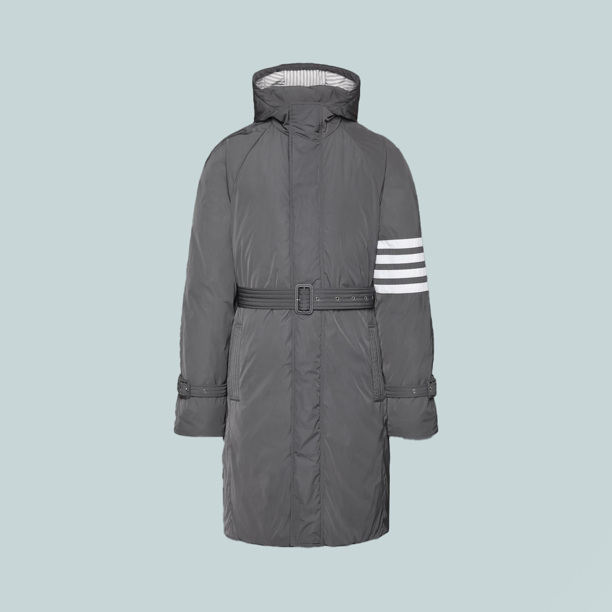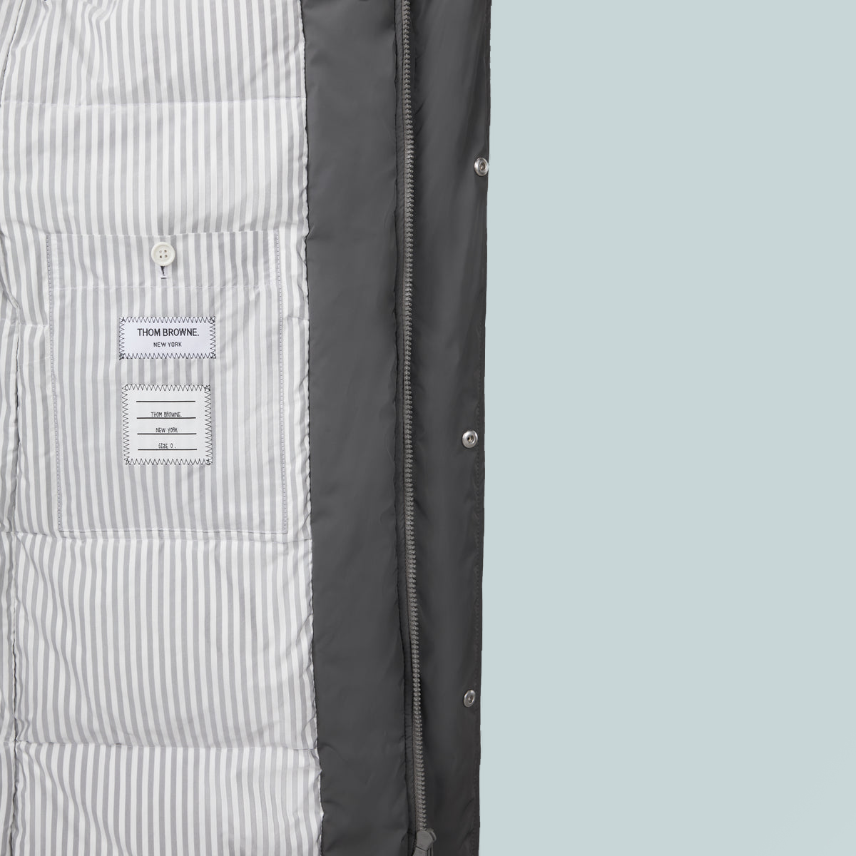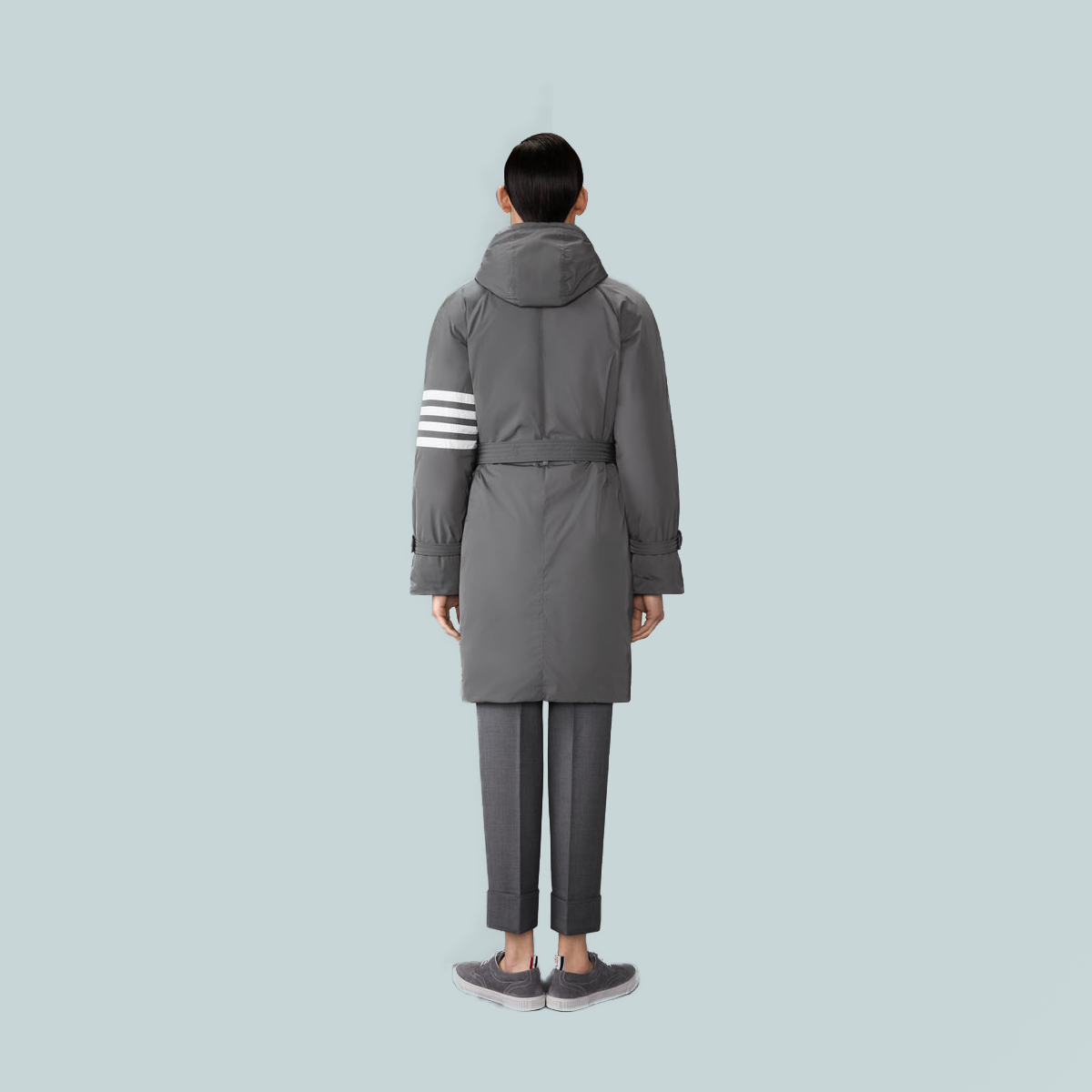Winter weather calls for the comfort of this signature Thom Browne parka, filled with luxe down and finished with a flattering belted waist and adjustable belted cuffs. Inspired by a trip to Utah, Thom envisioned an elongated silhouette to shield more of the body from unforgiving conditions. Built to last and crafted with Thom's signature attention to detail and quality.