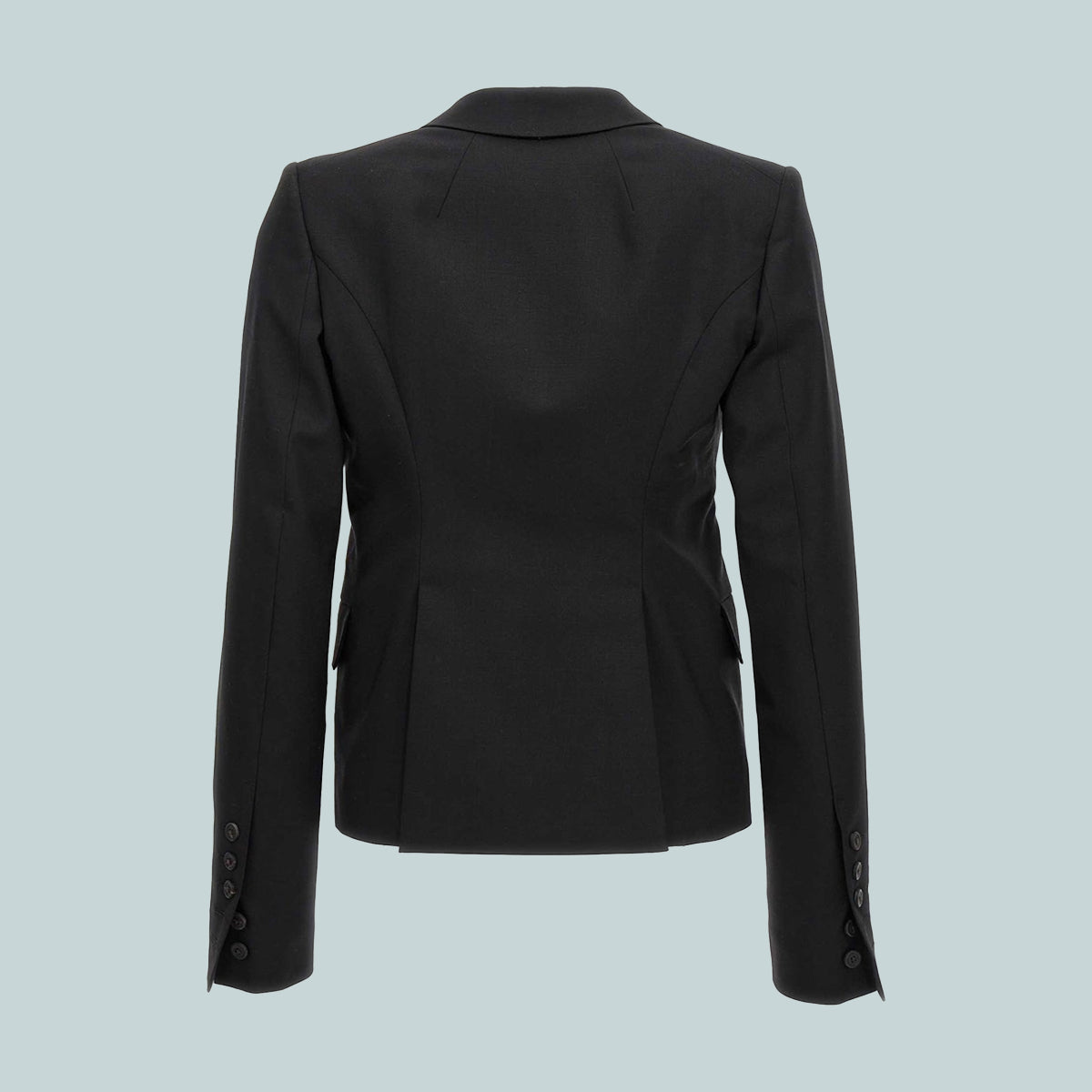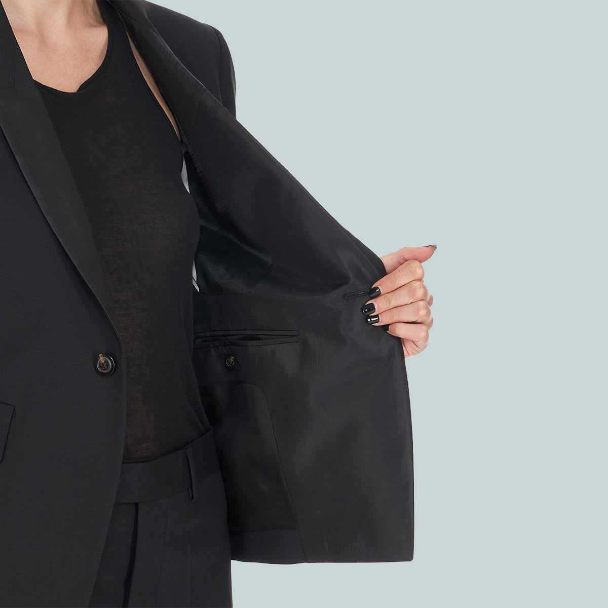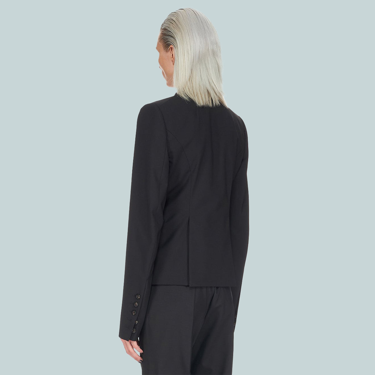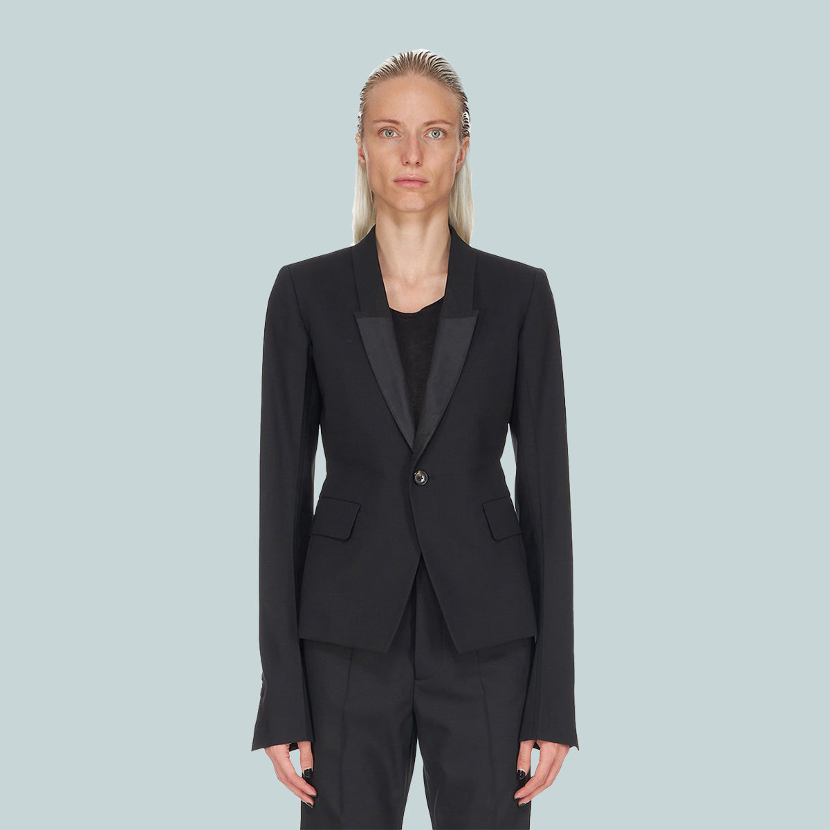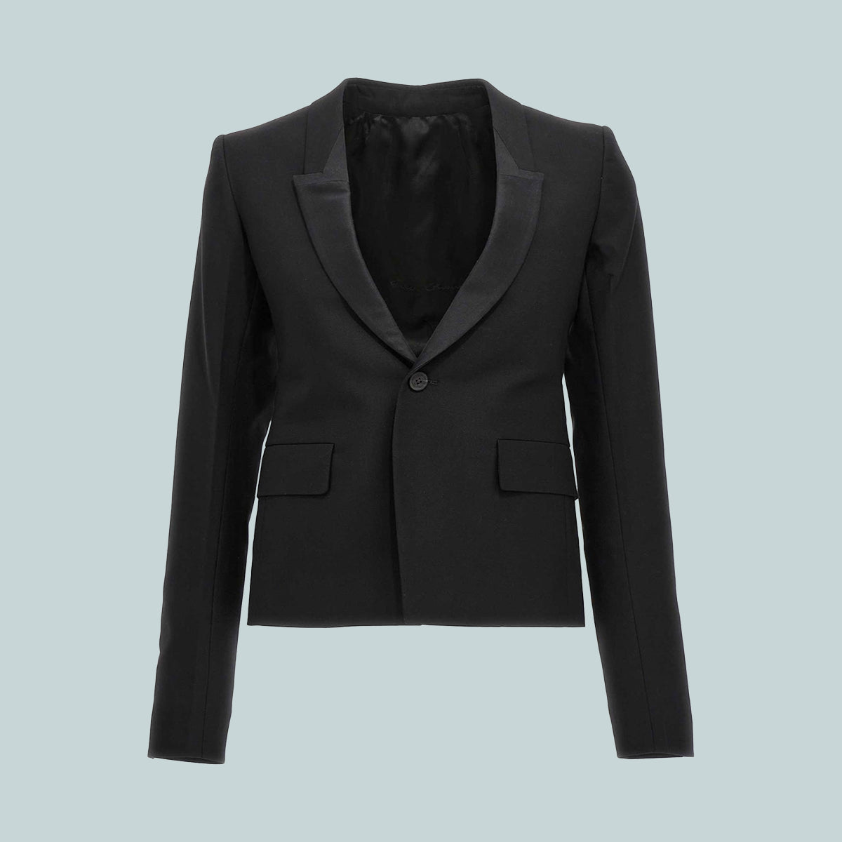 Rick Owens FW22 Strobe 60cm soft blazer in black paper finish wool tailoring and silk taffetas. This tailored jacket is above the hip in length with long slim sleeves and button cuffs. It features a slim lapel with geometric glyph cut, a single button closure, two side front pockets with flaps, internal button closure pocket and a double vent on back.