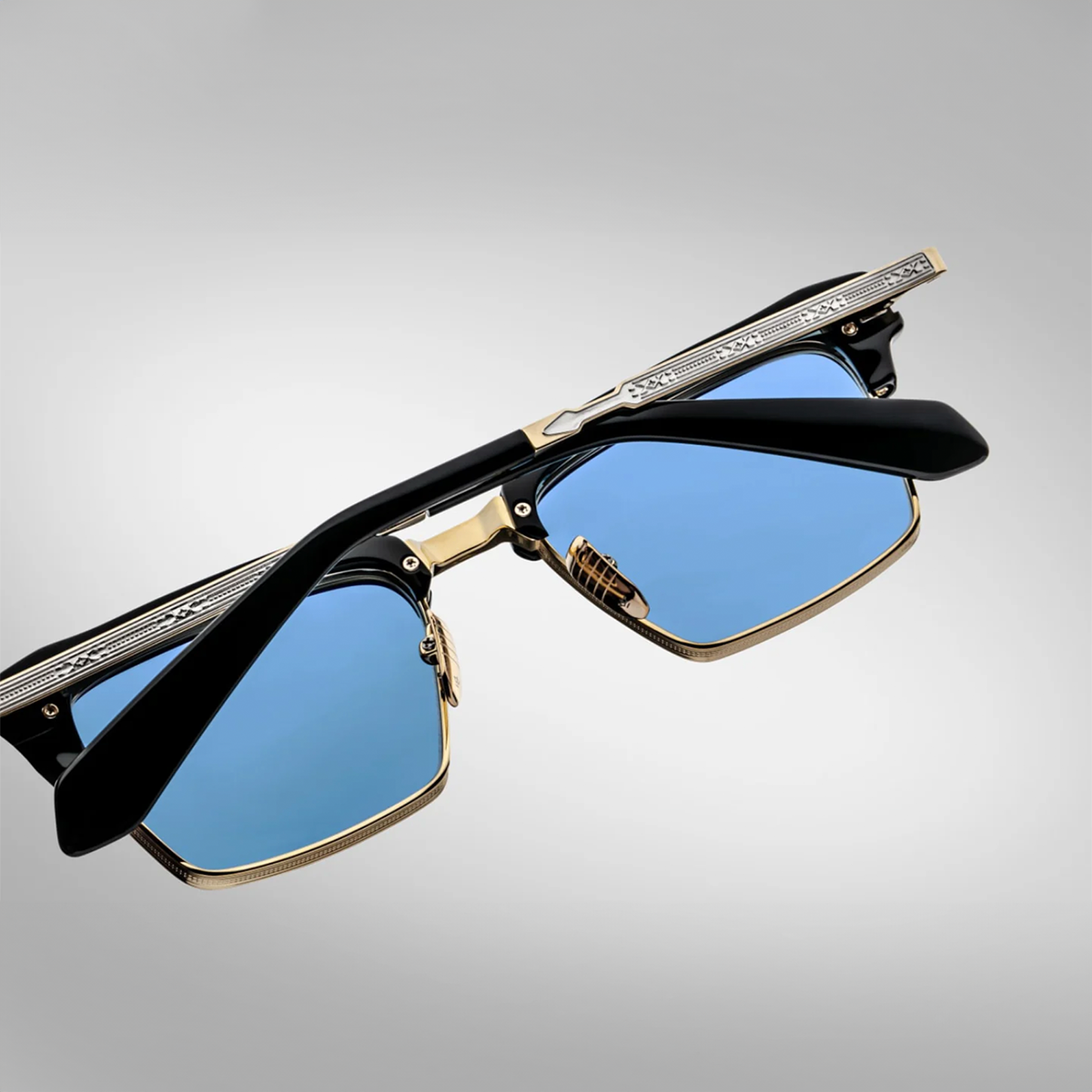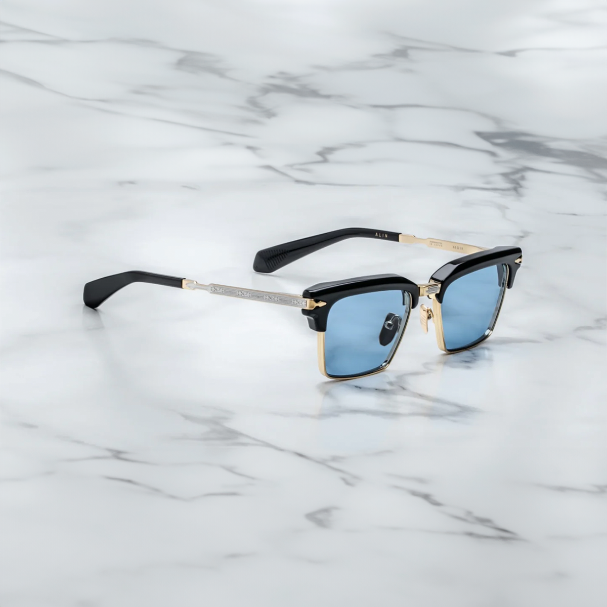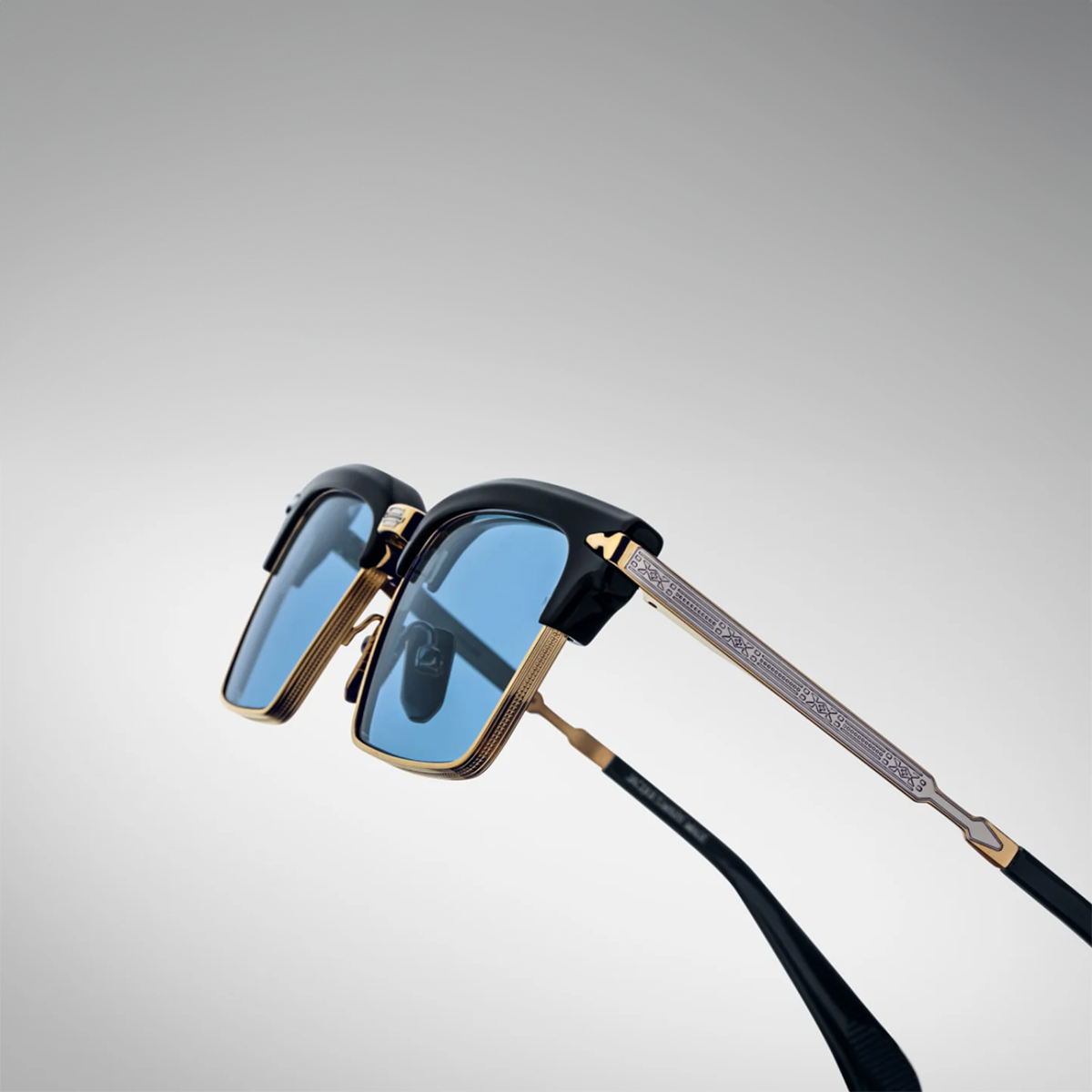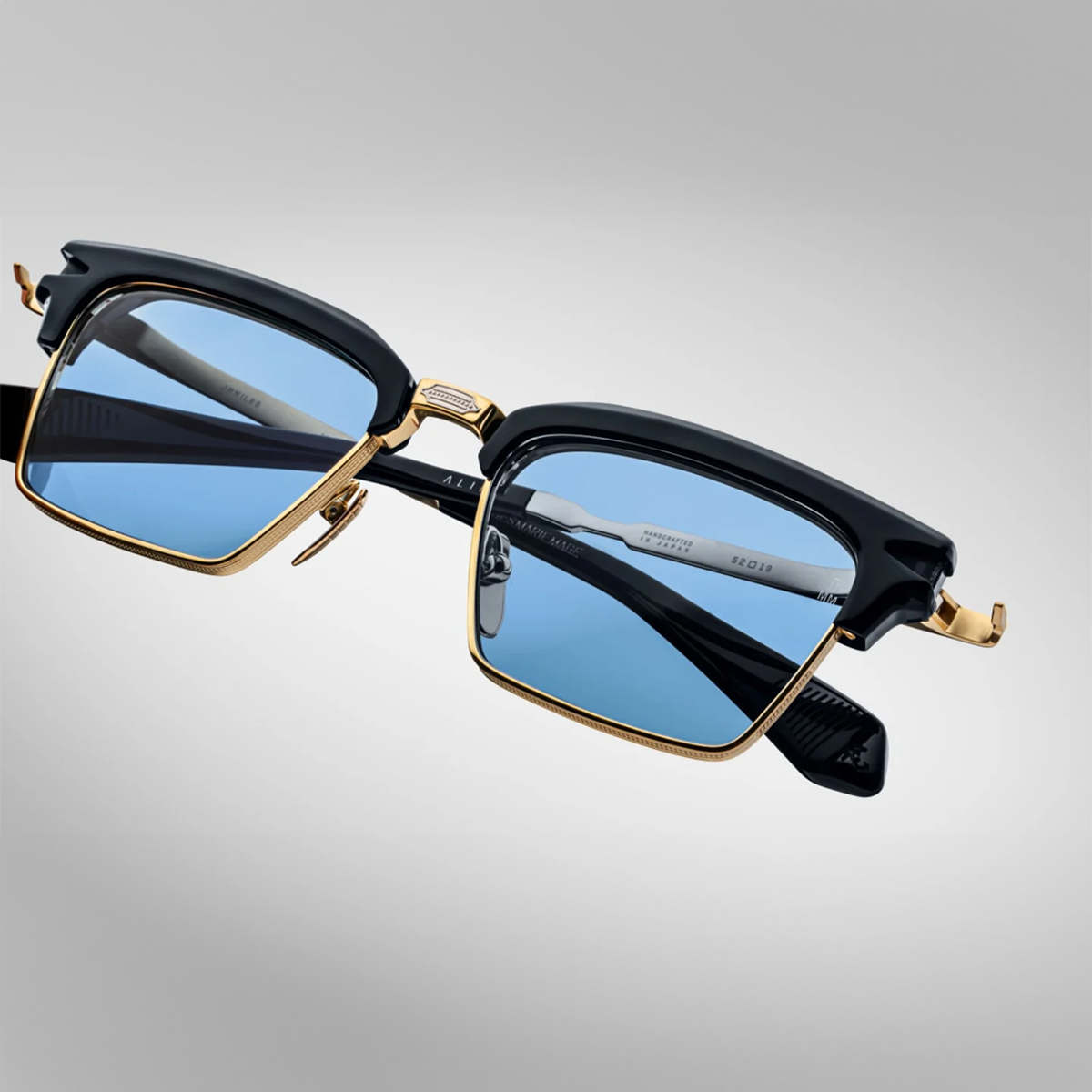 Material: Moon Gold 100% Beta Titanium with Silver Accents, Black Cured Cellulose Acetate and Blue lenses