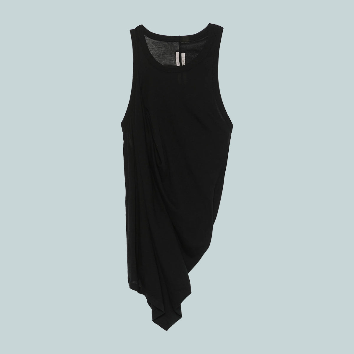 this anthem tank is below is hip length. it is sleeveless with a round neck, and deep armholes. it features draping which starts at the right arm, draping around the body to the right back side, and falls in folds on the left hip. it has level shoulder seams and signature seam running down the center back spine.