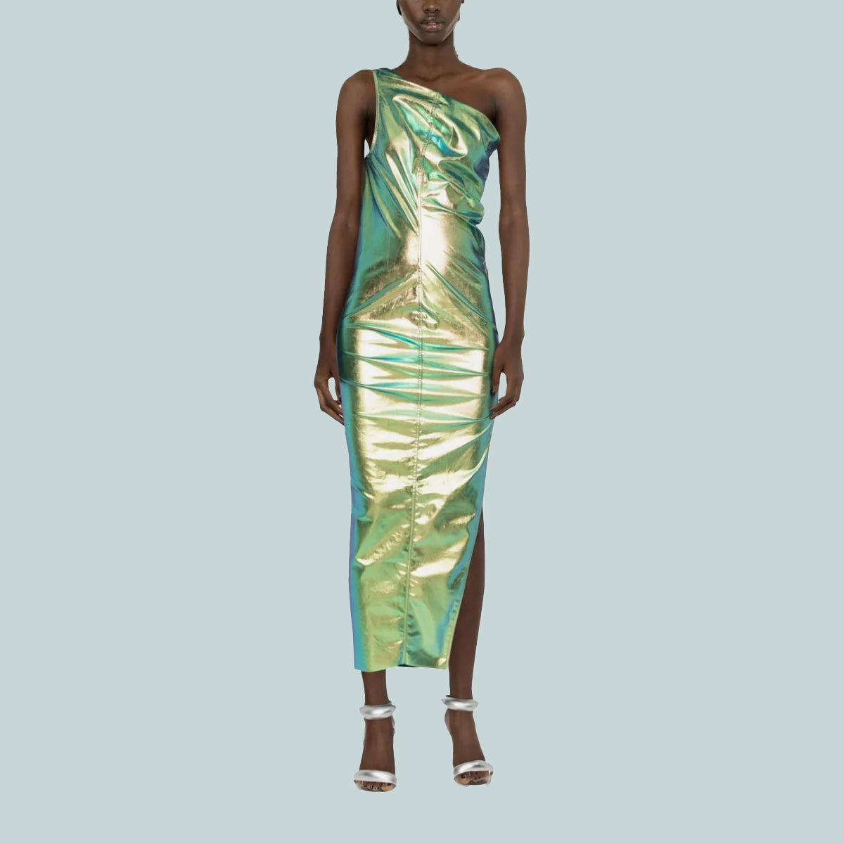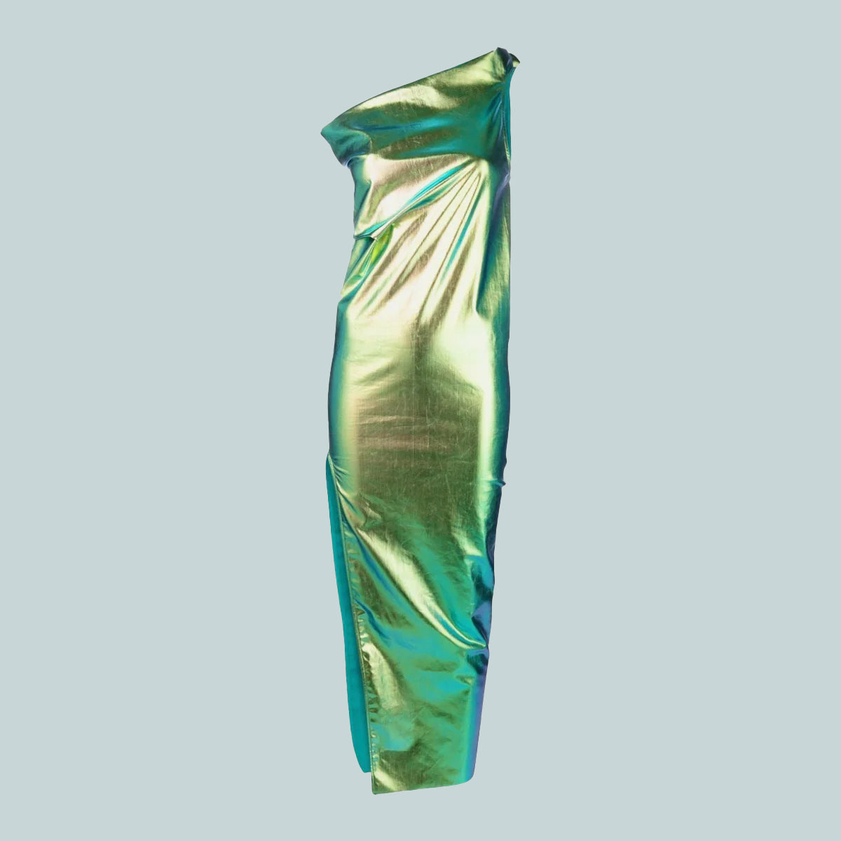 This Athena gown is ankle-length and features an asymmetrical neckline with draping and has one sleeveless shoulder which can be worn up on the shoulder or down to create an off the shoulder top. It features a tapered skirt with a split on the right leg reaching up to mid-thigh. it has the signature seam running down the centre back spine and a raw cut hem.