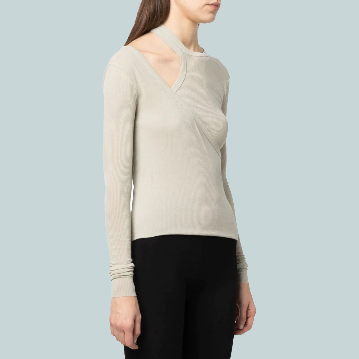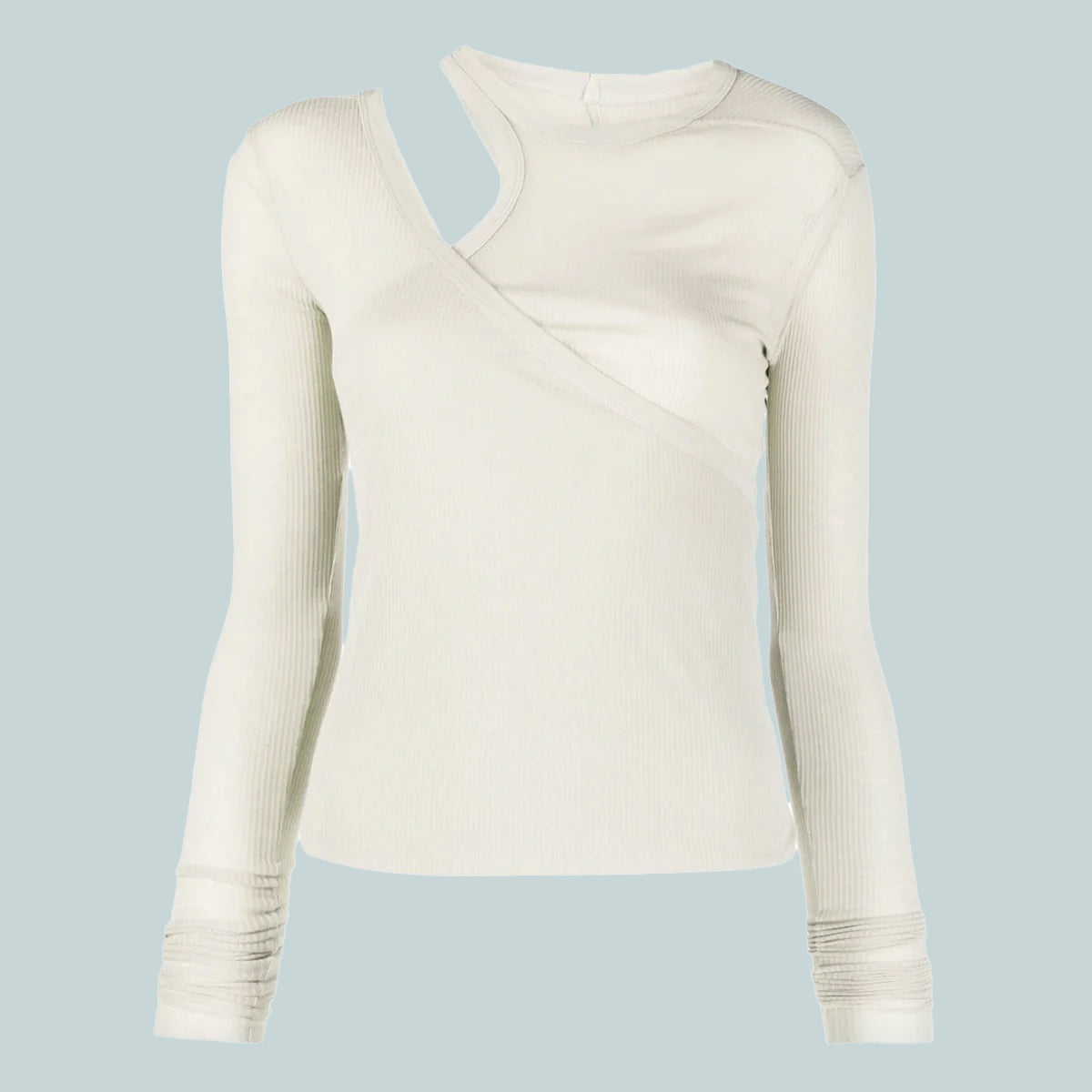 This banana ls t is below hip length with long sleeves. It is double layered with an asymmetrical neckline on top, which can be worn as a regular top, or peeled down with the top layer hanging, exposing a racer tank shoulder on the right side. It features the signature level shoulder seam on the left shoulder and single seam running down the centre back spine.