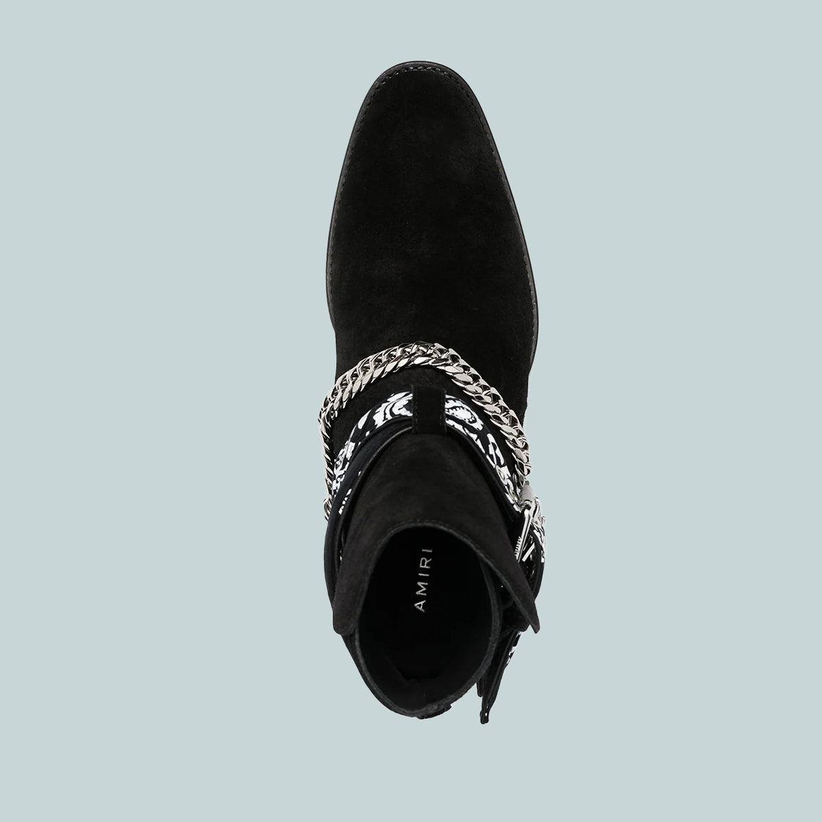 Bandana buckle boots adorned with vintage bandana straps and adjustable cuban chain across forefoot, bandana double buckle closure, adjustable nickel chain and hardware.