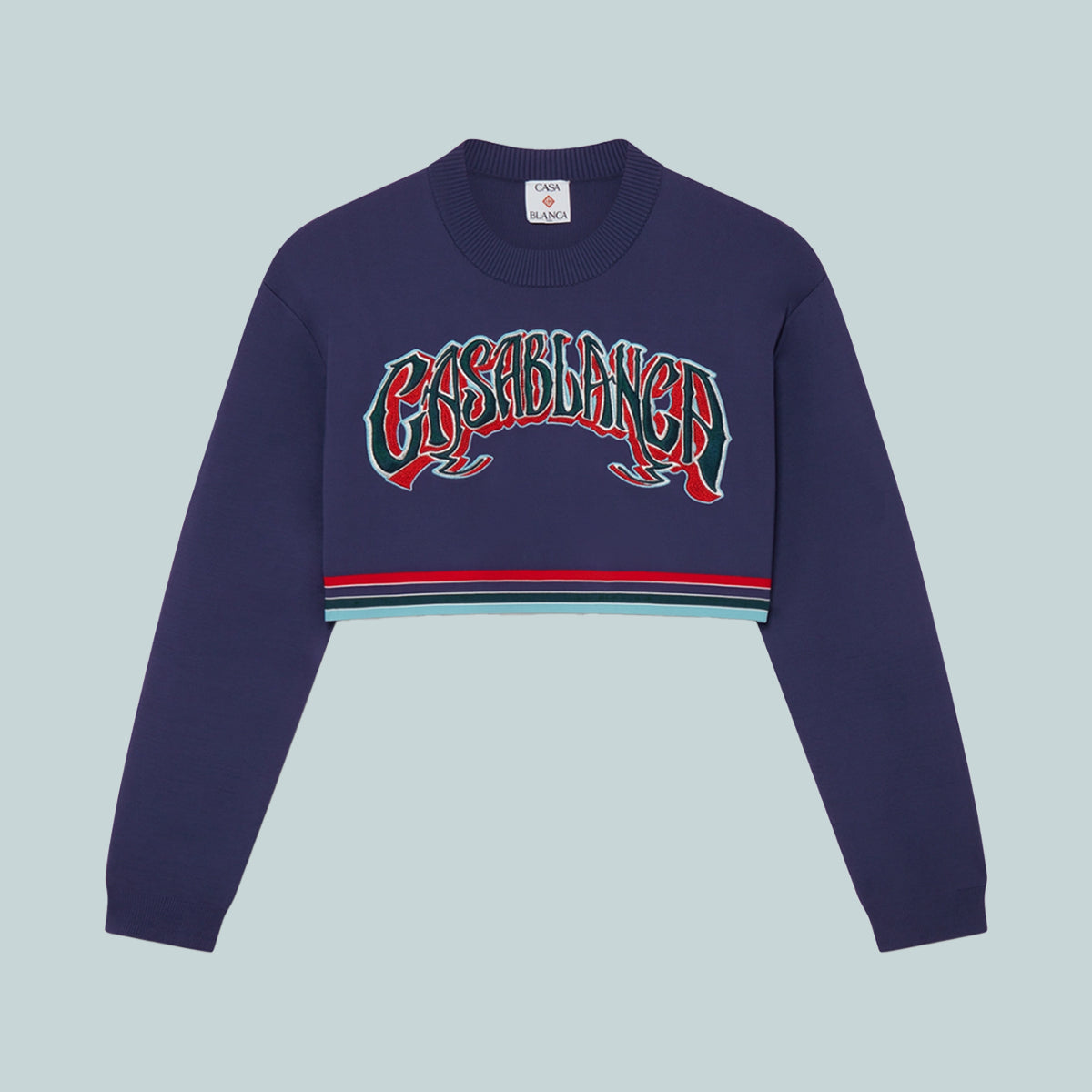 The baseball cropped jumper is crafted from a tricot fabric and features embroidered hand-drawn typography of the Casablanca logo, inspired by the gothic typeface used in tattoos. Completed with rib collar and cuffs, and a red, white, blue, green, and navy horizontal stripe detail on the hem.