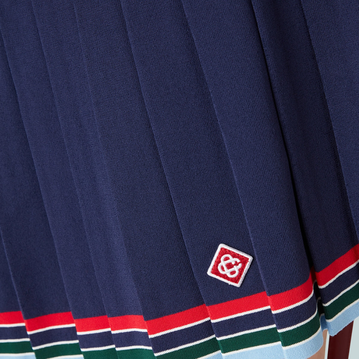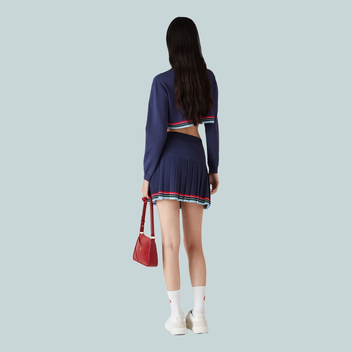 The baseball pleated skirt is a mini-style crafted from a tricot fabric. Completed with a waistband, pleats, and a red, white, blue, green, and navy horizontal stripe detail on the hem.