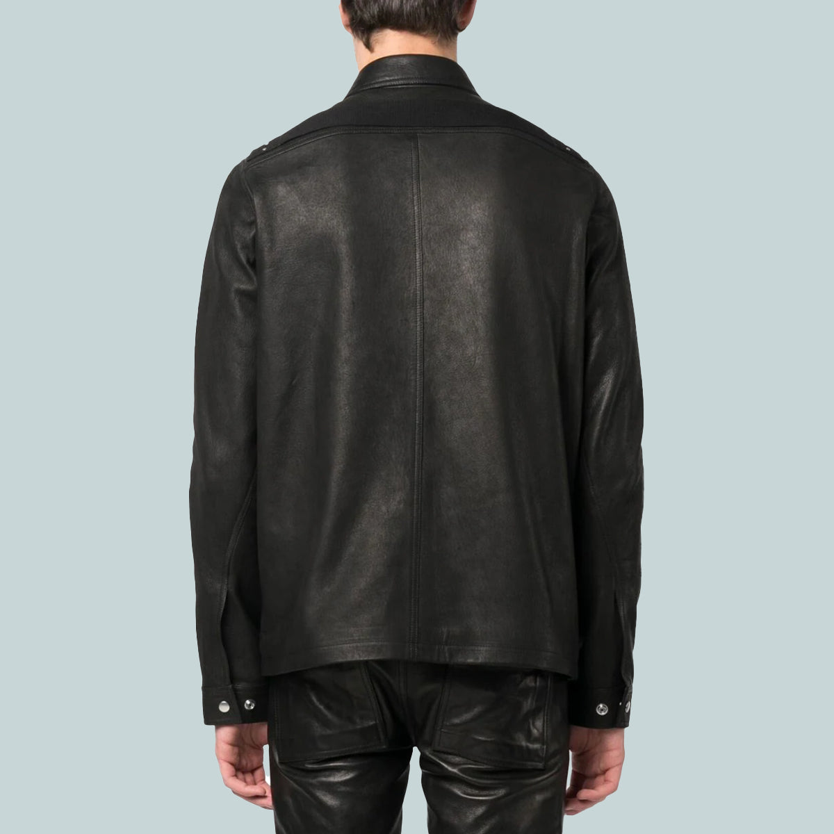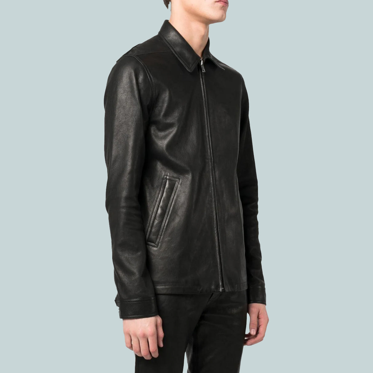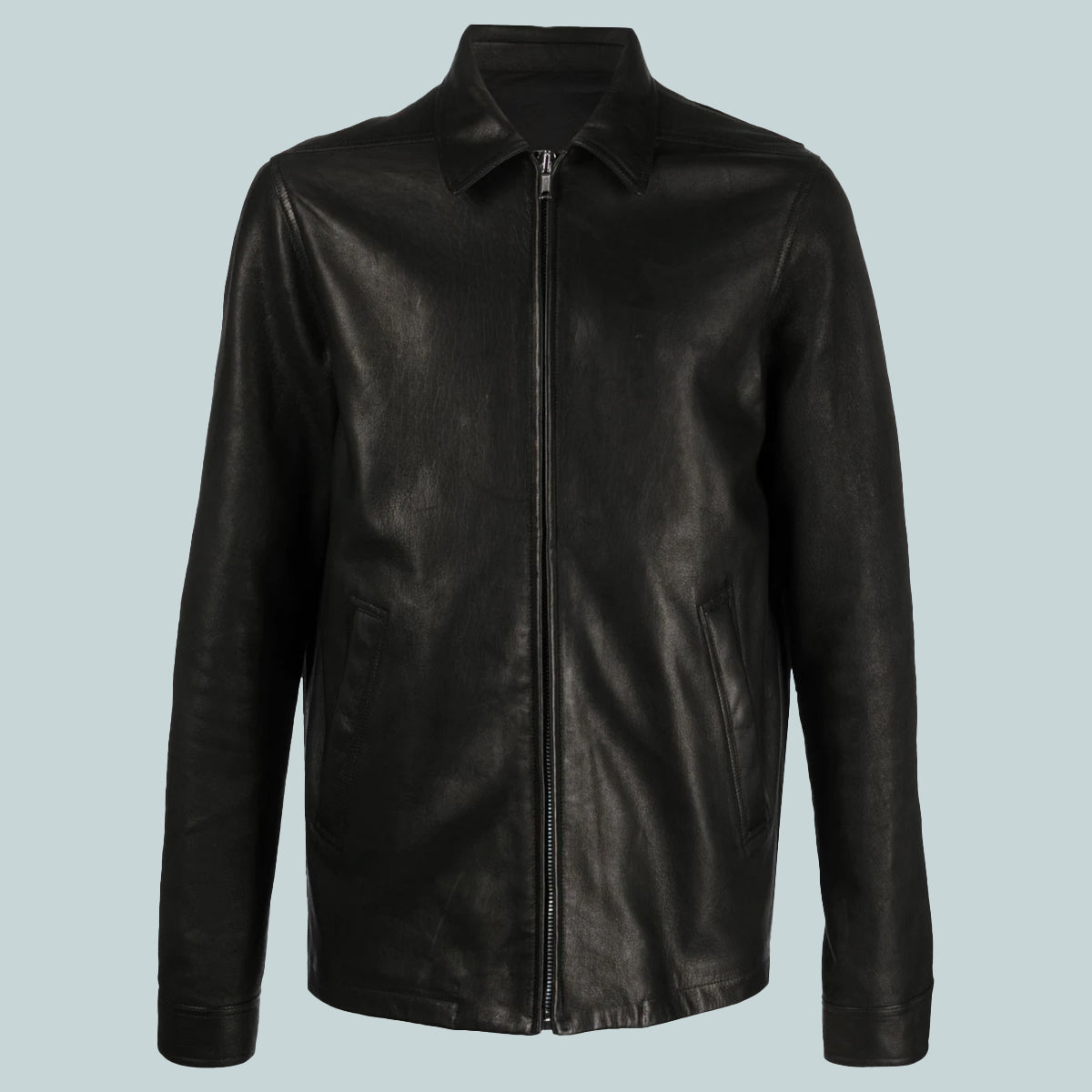 This brad jacket is hip length with a straight fit and long sleeves. It has a centre front zip opening, classic collar, side front welt pockets with an internal snap, slip cuffs with snaps and double topstitching.