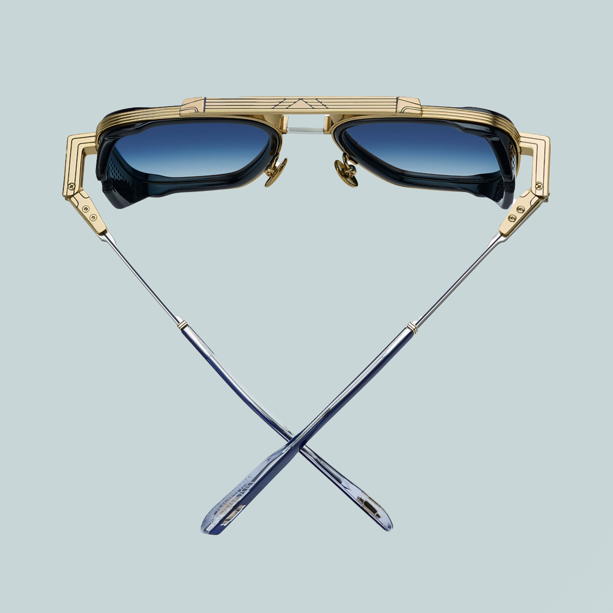Combination temple arms with two-tone construction and embedded Art Deco-style decor.