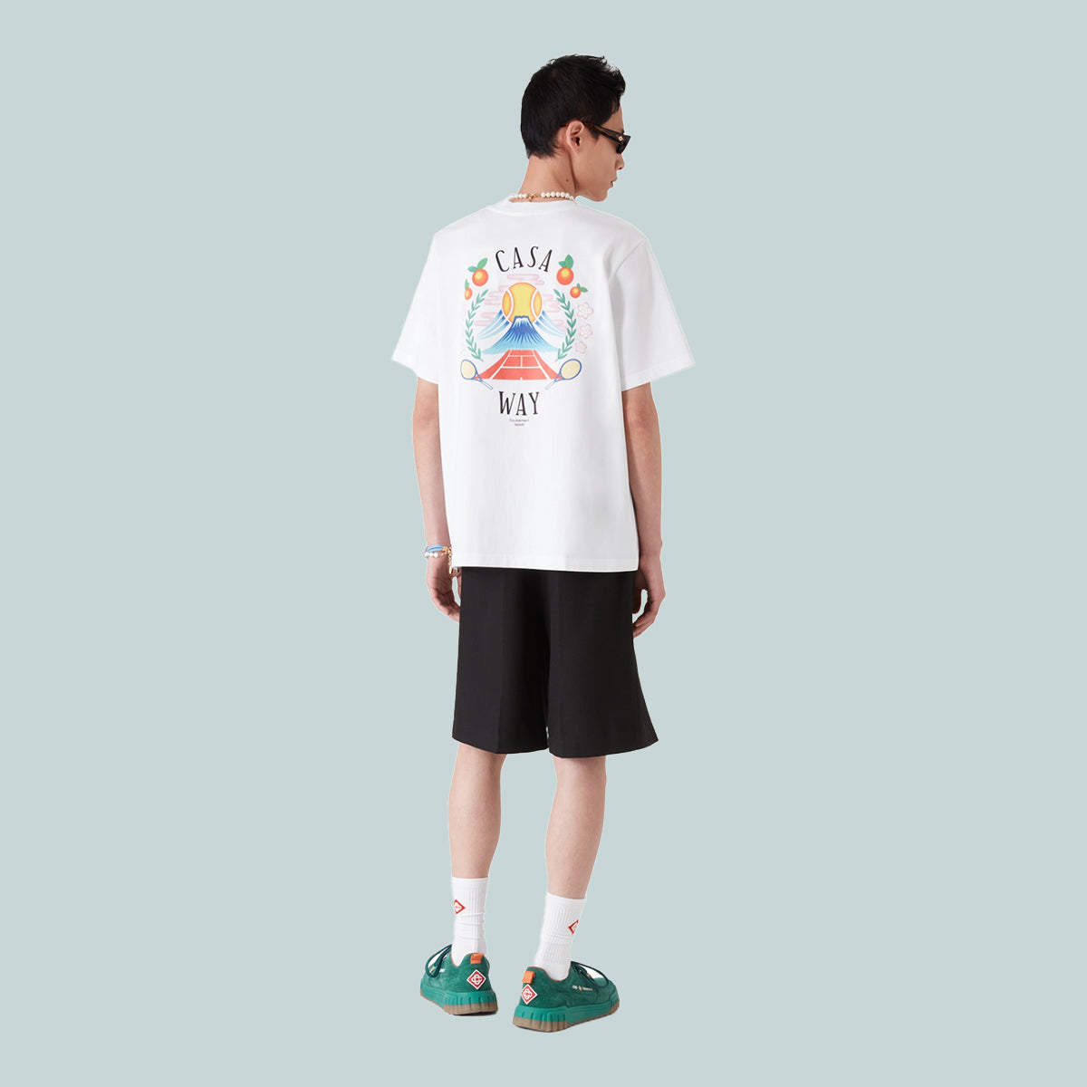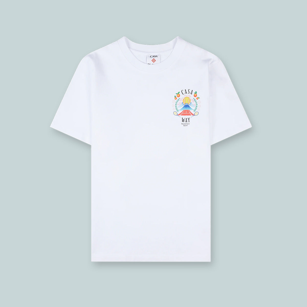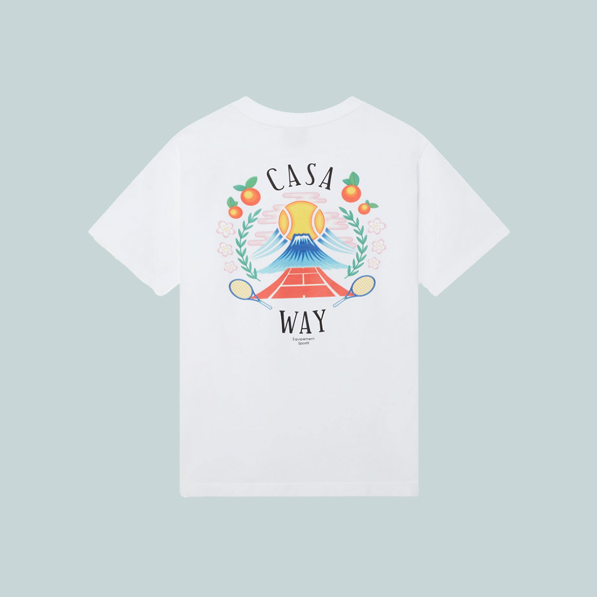 The Casa Way Mountain t-shirt is a short-sleeve design crafted from organic cotton fabric and features the house's seasonal artwork that follows the story of the iconography style we've been exploring - digitally built artwork that showcases our mountain logo, with different lines and gradient, that create a strong branding. Completed with a classic crew neck.