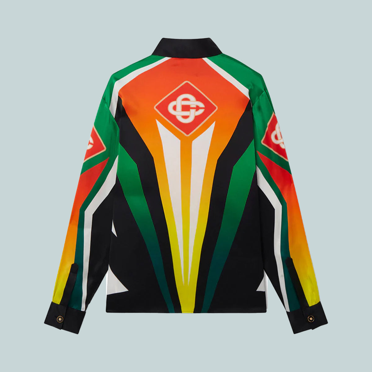 The Casa Moto Sport silk shirt is a long-sleeve printed style, crafted from a silk satin fabric, featuring panels of this season's gradient colours representing the rich exchanges across cultural disciplines in African art, music and film. Completed with the house's signature gold rim enamel buttons, button closure, black contrast point collar and cuffs.