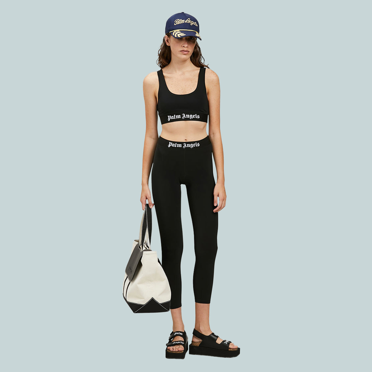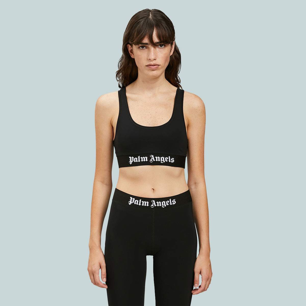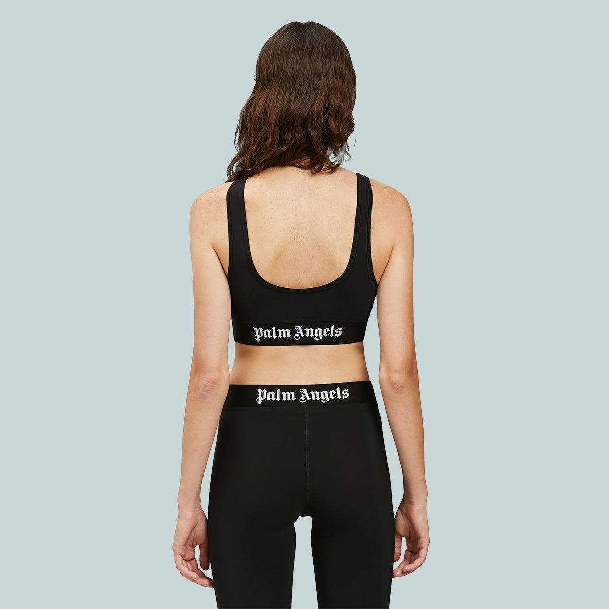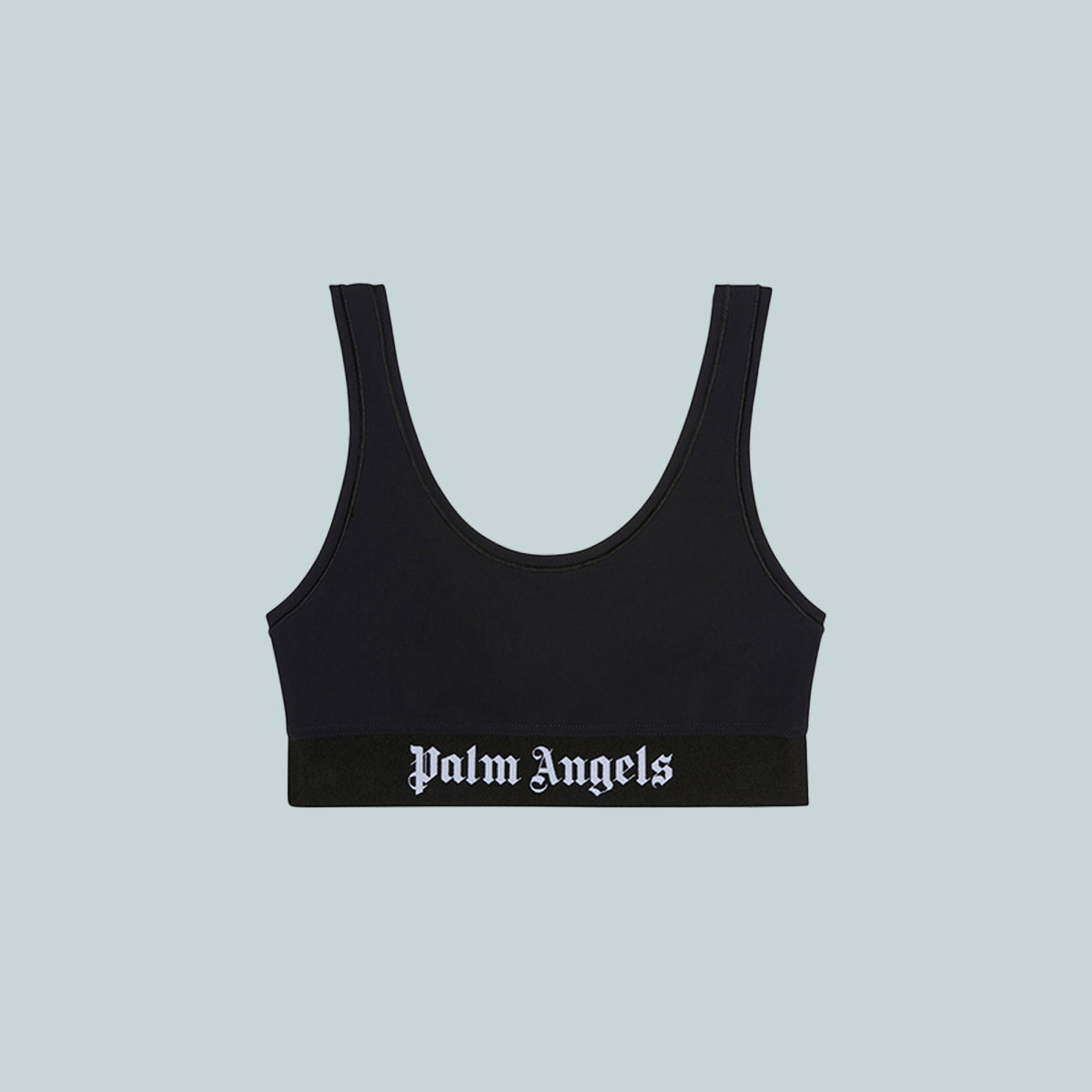 Sports bra in black. Elasticised waistband featuring jacquard "palm angels" logo pattern in white.
