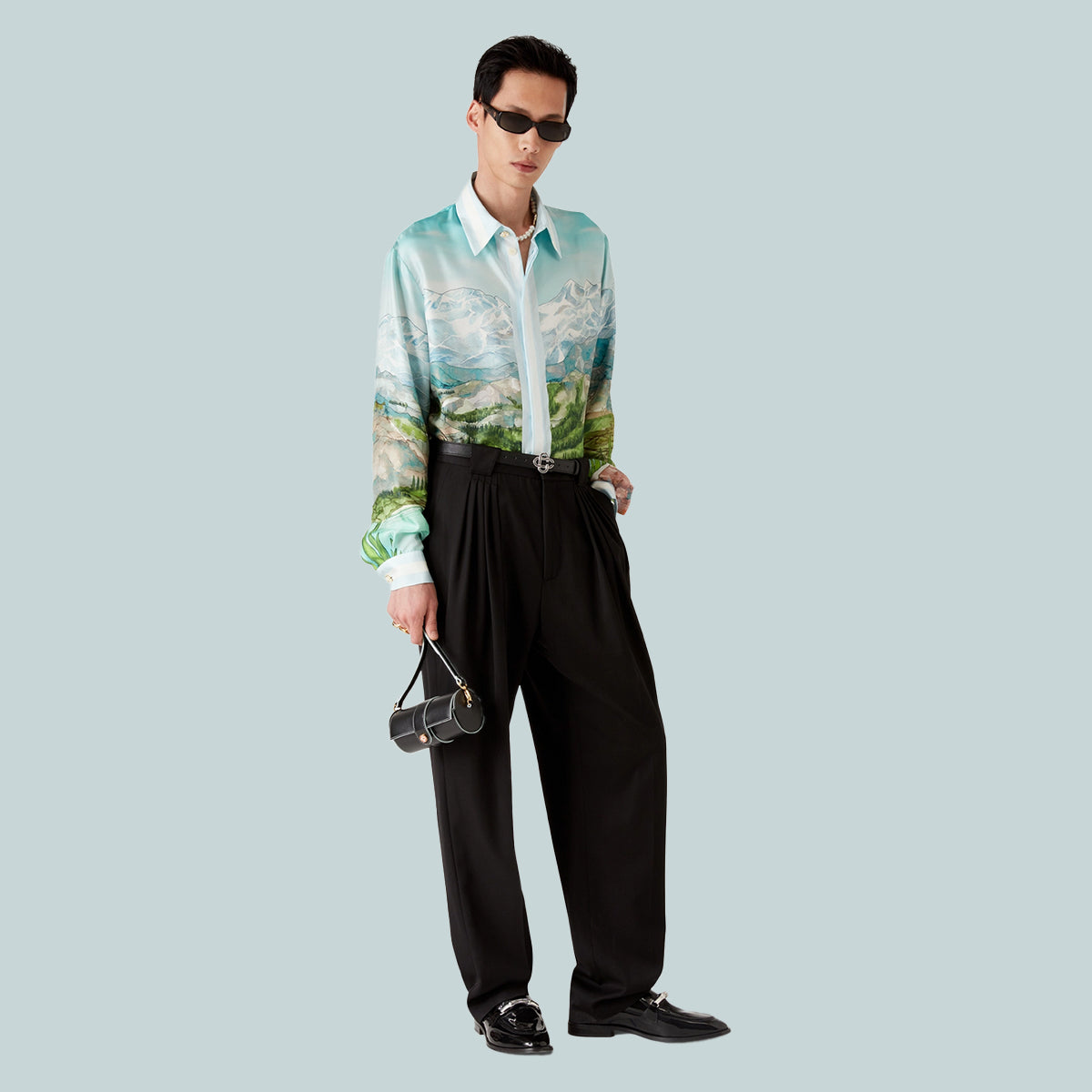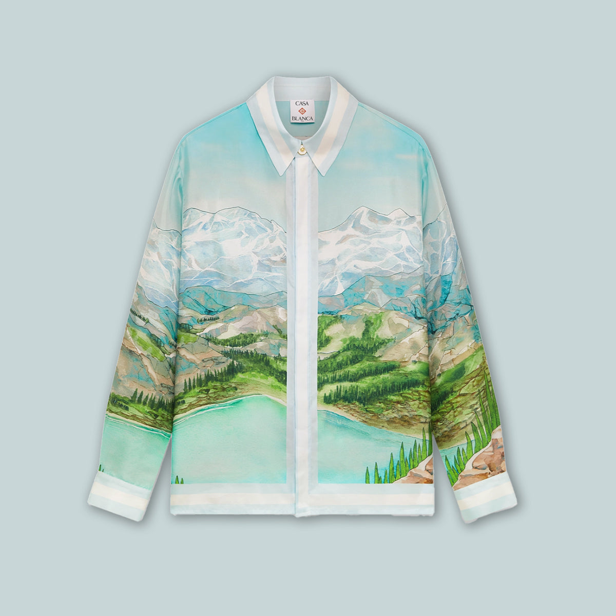 The Dalmatian A La Montagne silk long-sleeve shirt is an all-over printed design crafted from silk twill fabric featuring the house's signature artwork depicting a landscape with snow-covered mountains, lakes and a dalmatian. Completed with a collar, button closure, interlocking CC logo corozo buttons, signature pearl floral buttons at the collar and cuffs, and stripe edge detail on the collar, cuffs, hem and placket.