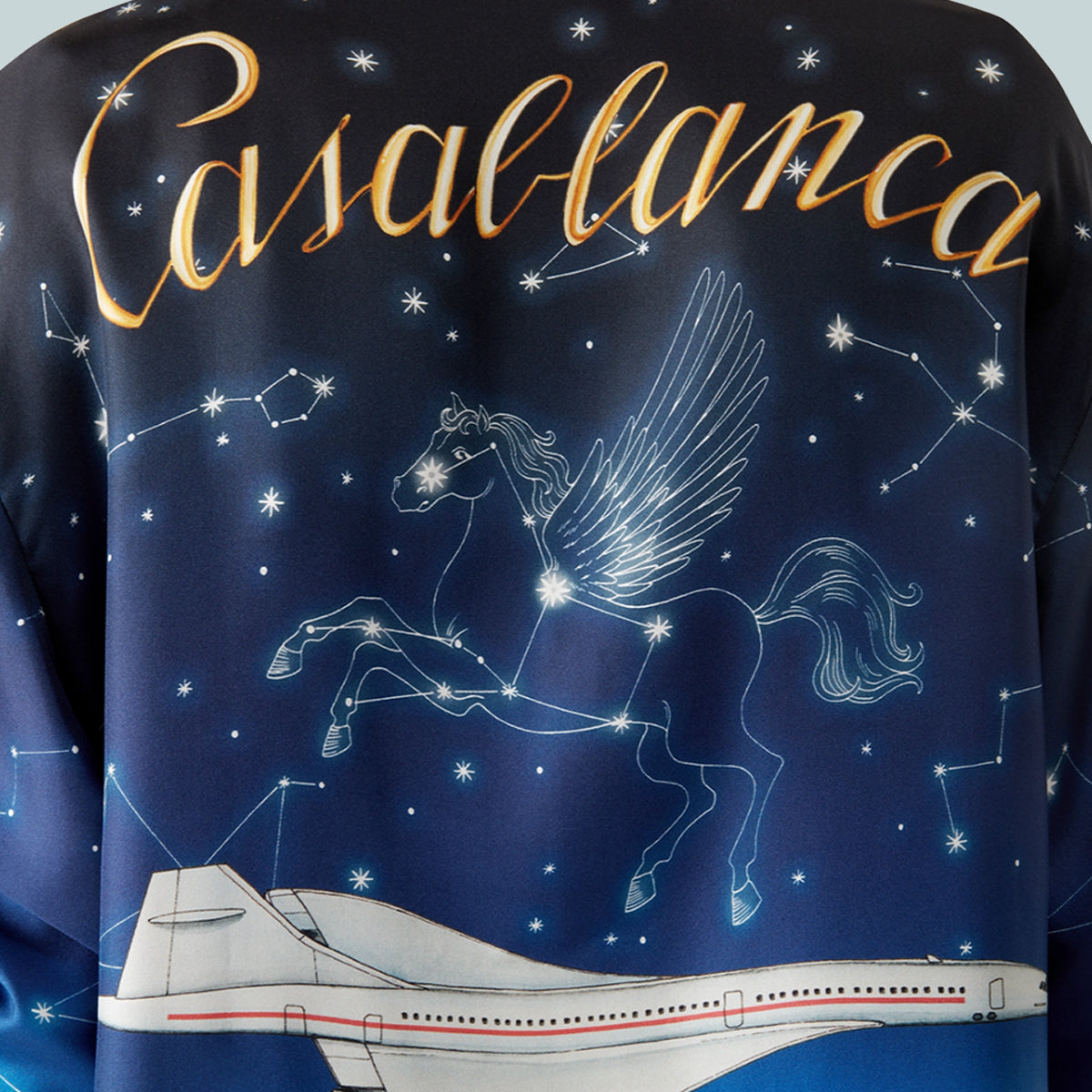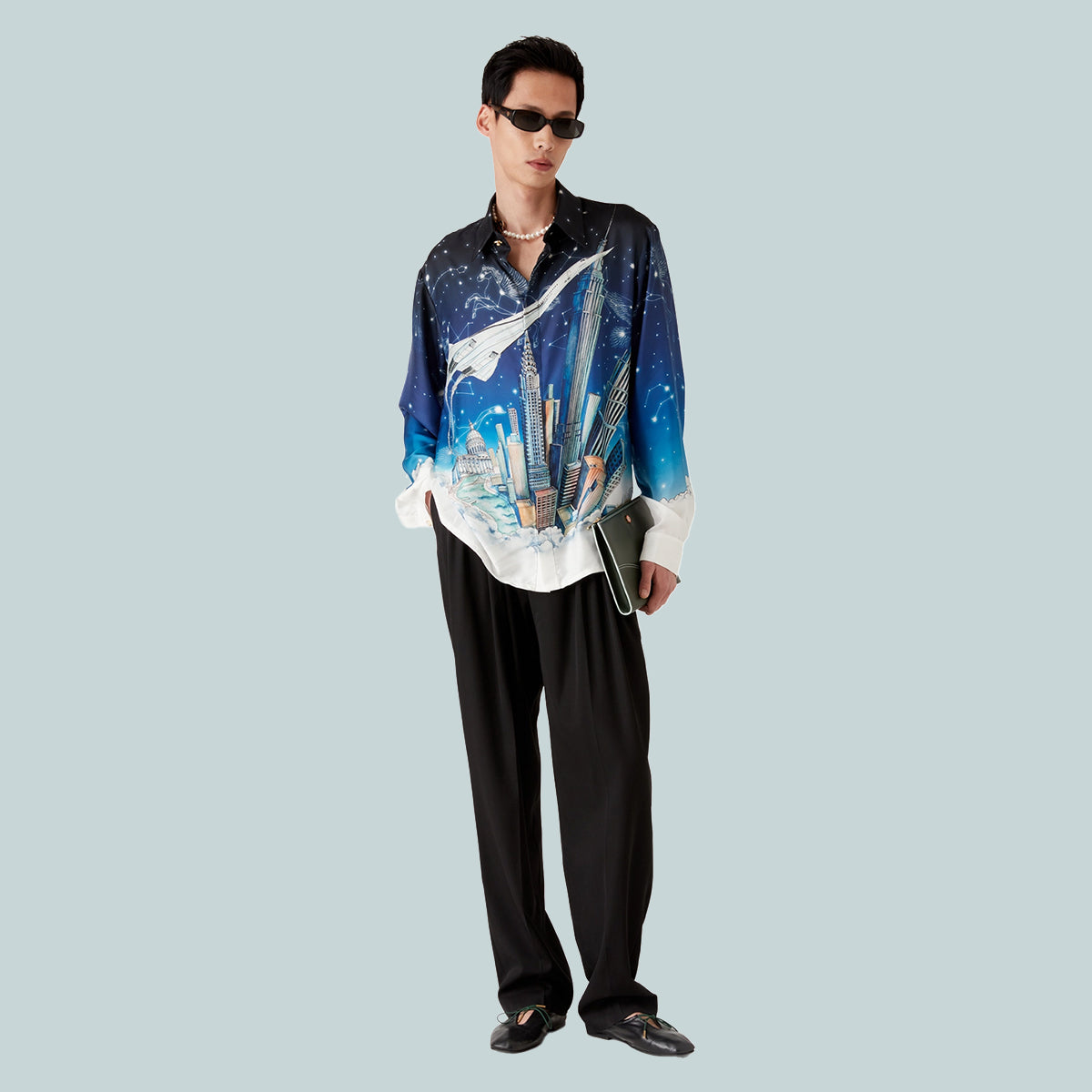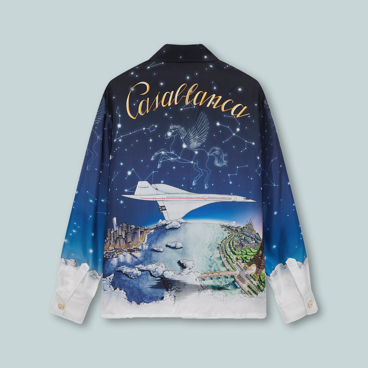 The Vol De Nuit silk shirt is a long-sleeve all-over printed design featuring artwork paying homage to the fantasy and surrealism of both the house and Charaf Tajer’s birthplace, Paris, crafted from silk twill fabric. Completed with a collar, button closure, interlocking CC logo corozo buttons, and signature gold rim pearl buttons at the collar and on the cuffs.