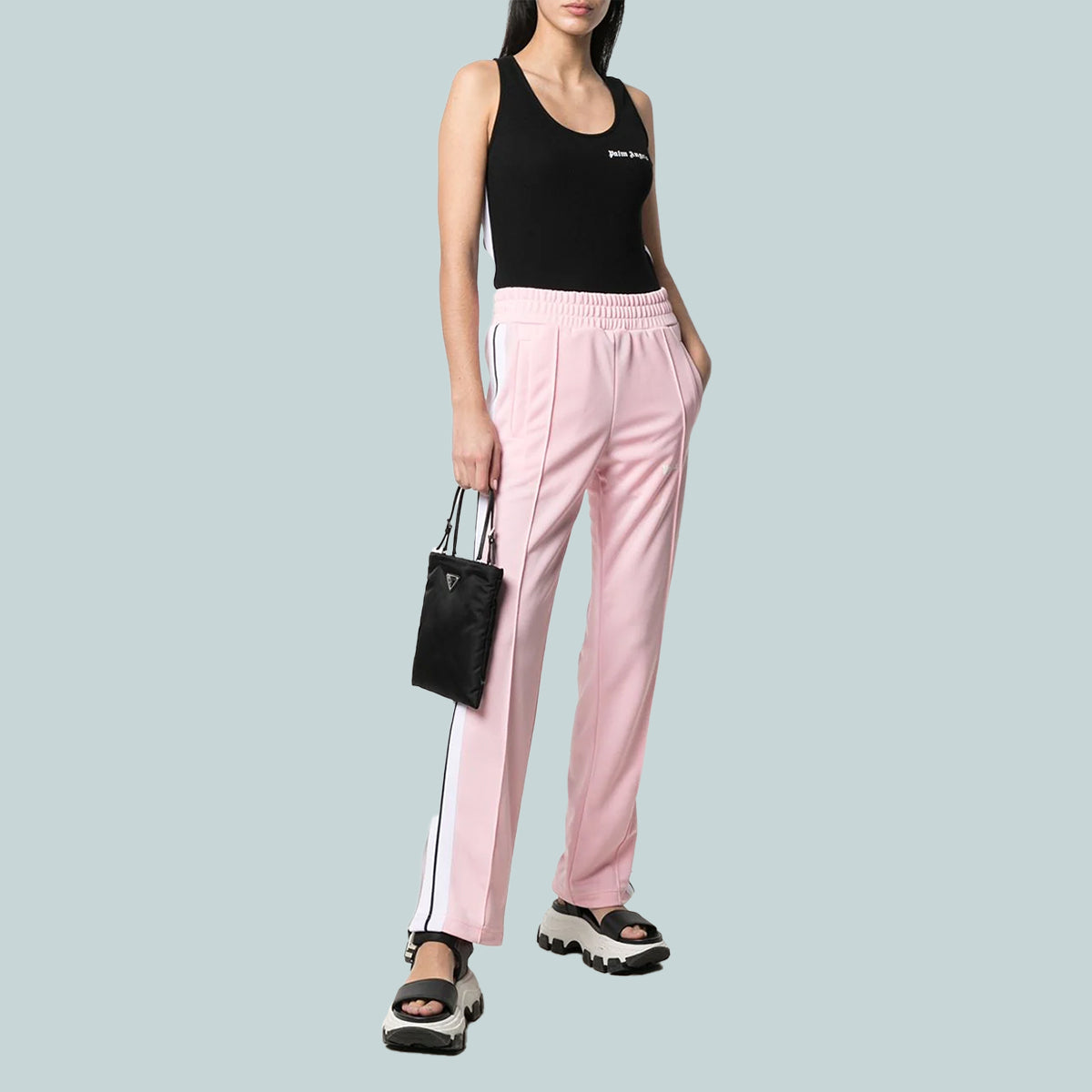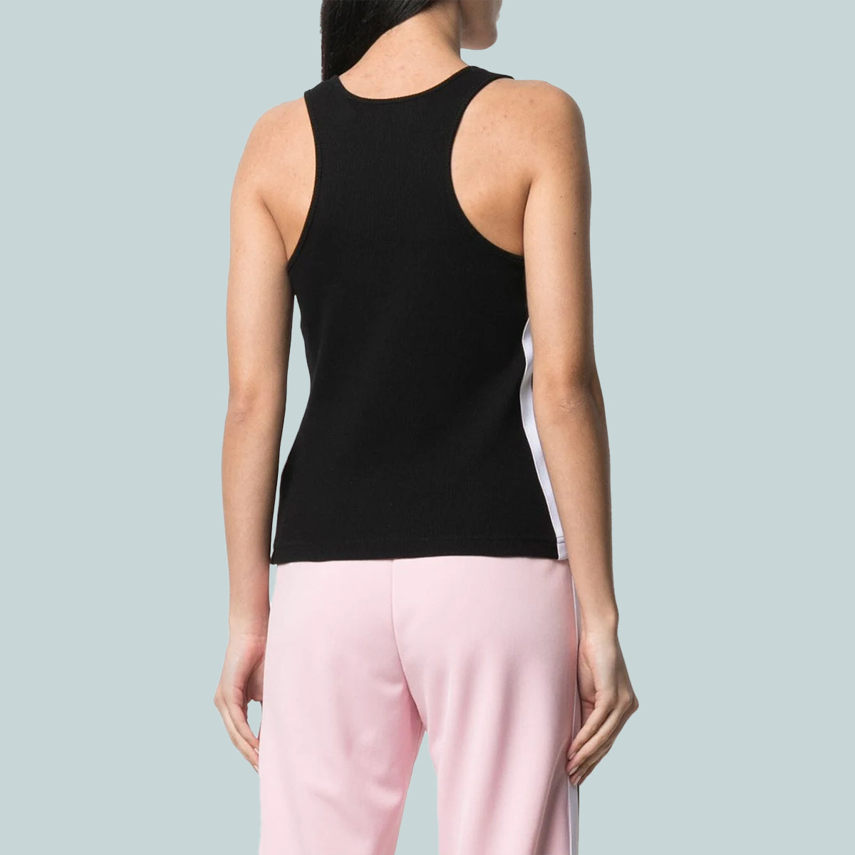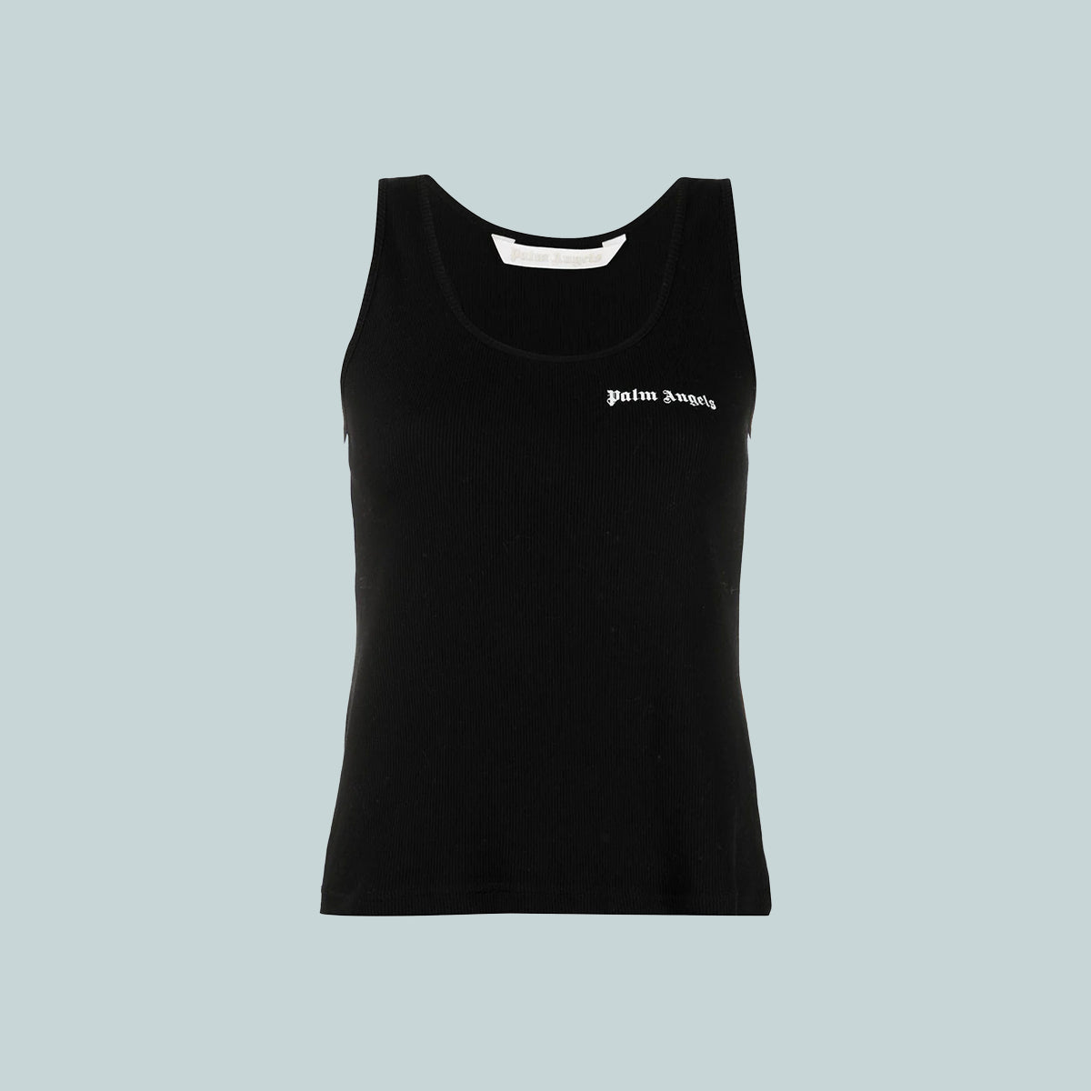 Sleeveless cotton tank top in black with Palm Angels logo printed in white at chest. Scoop neck. Straight hem.
