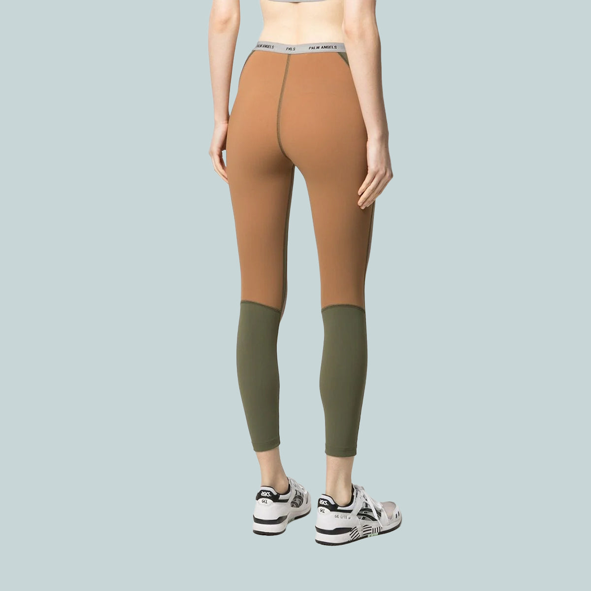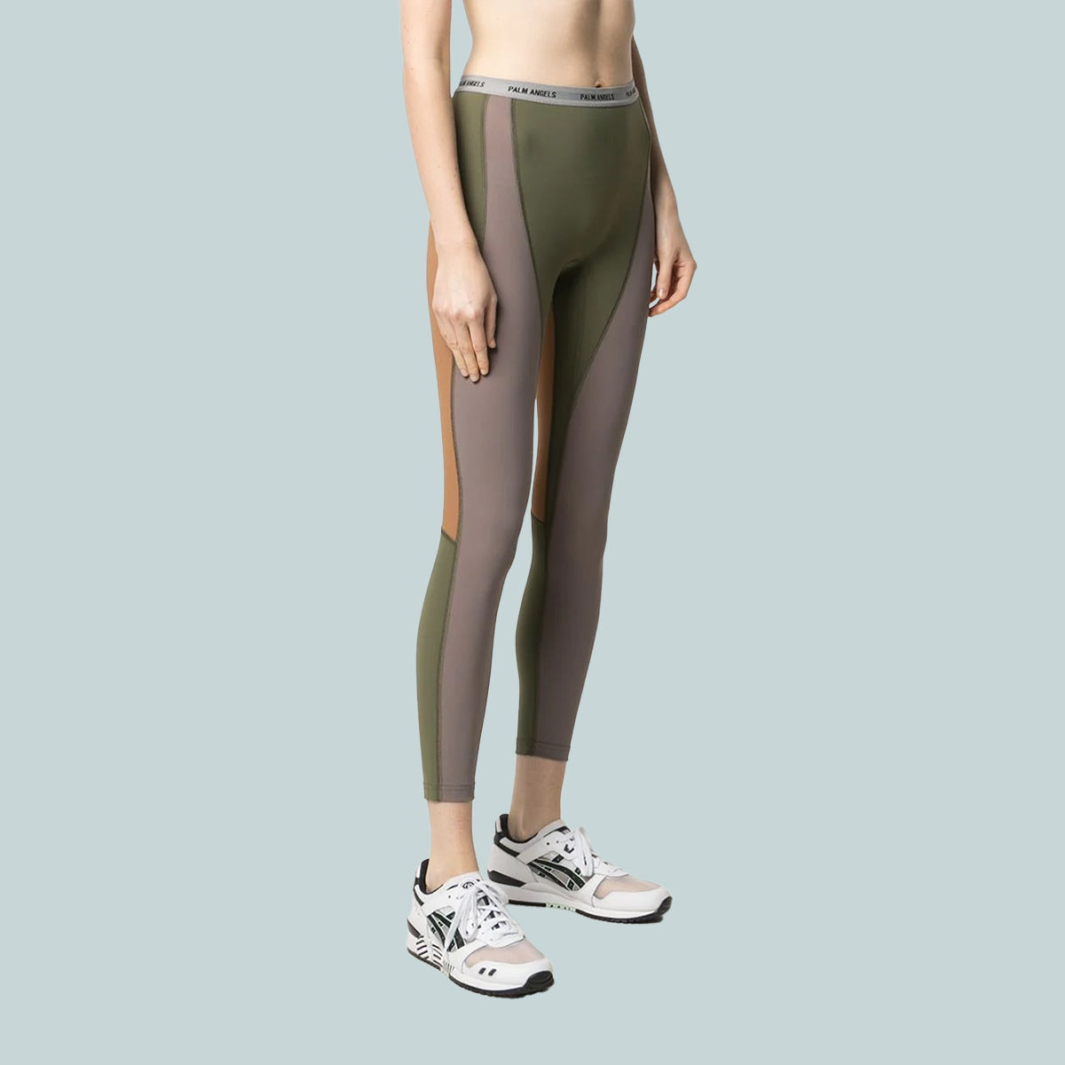 Stretch leggings from Palm Angels. Elastic logo print high-rise waistband. Grey/ brown/ green colour-block panelled design. Full length.