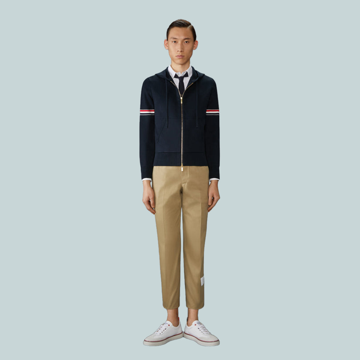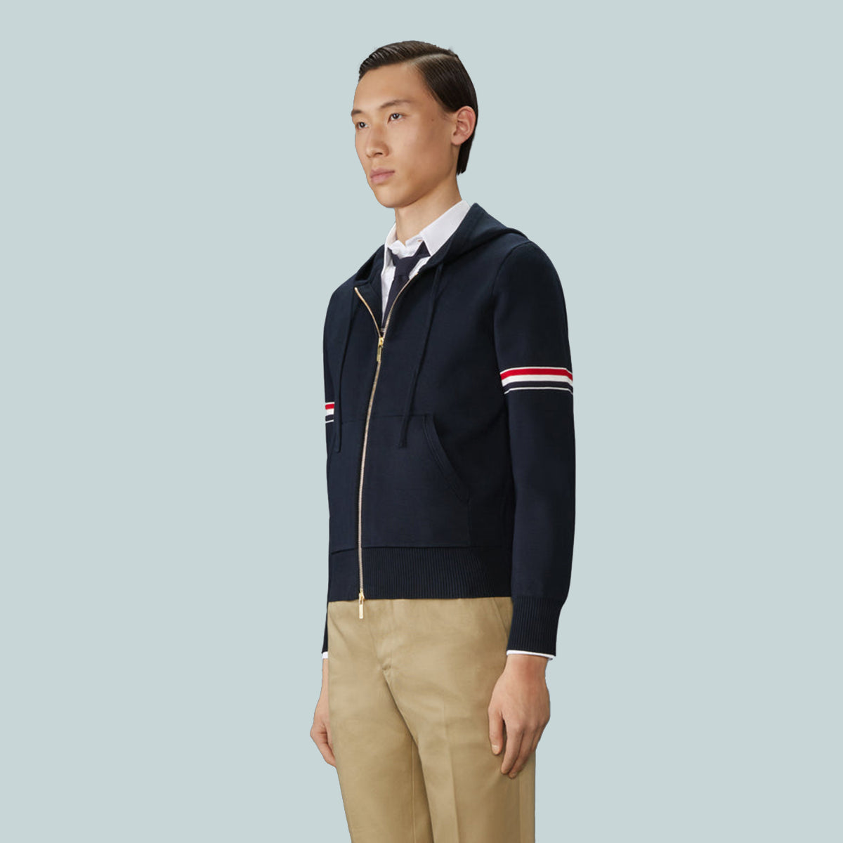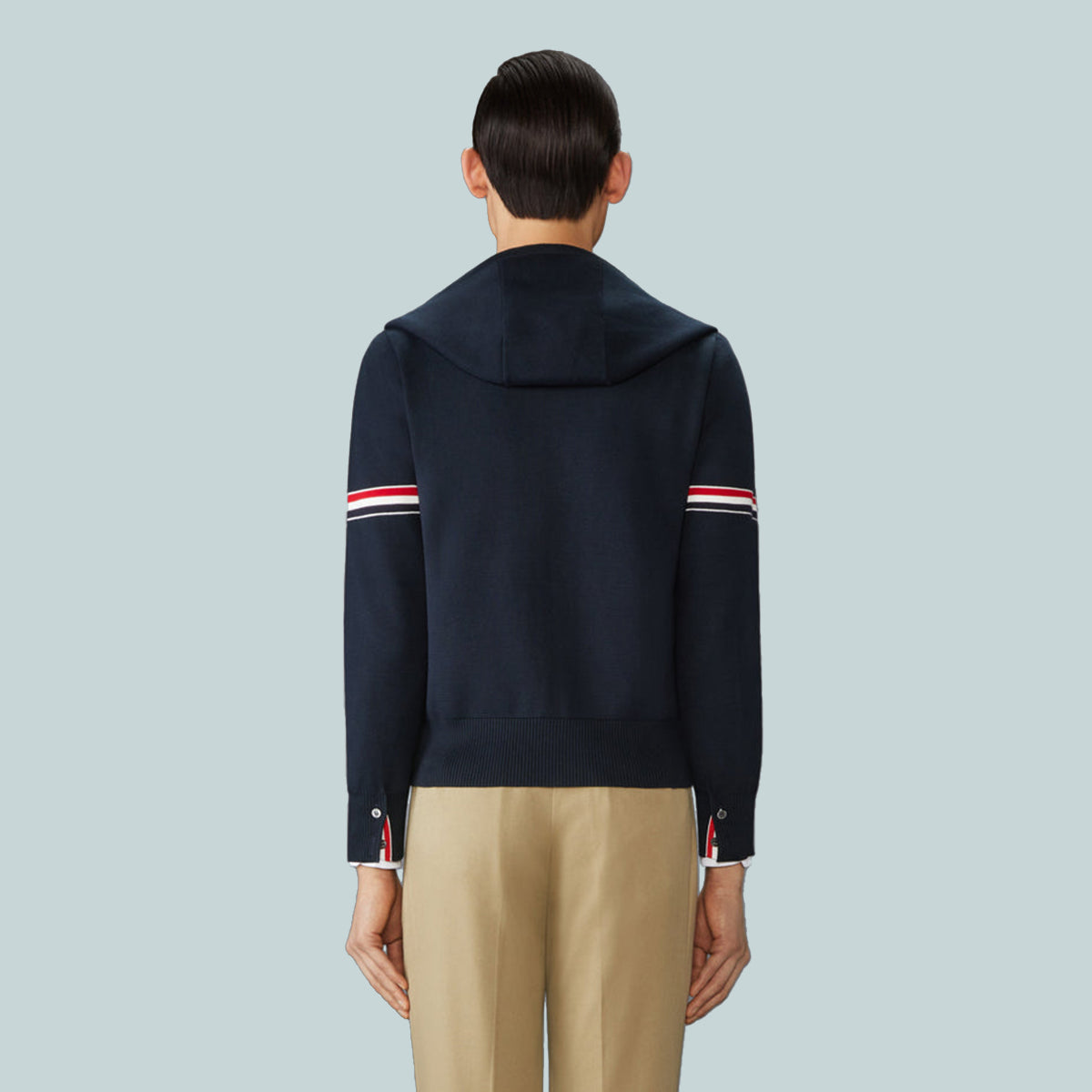 Zip hoodie in navy Milano stitch cotton with striped grosgrain armbands. 2-way zip closure, drawstring hood, slant welt side pockets. Buttoned cuffs with signature striped grosgrain trim.