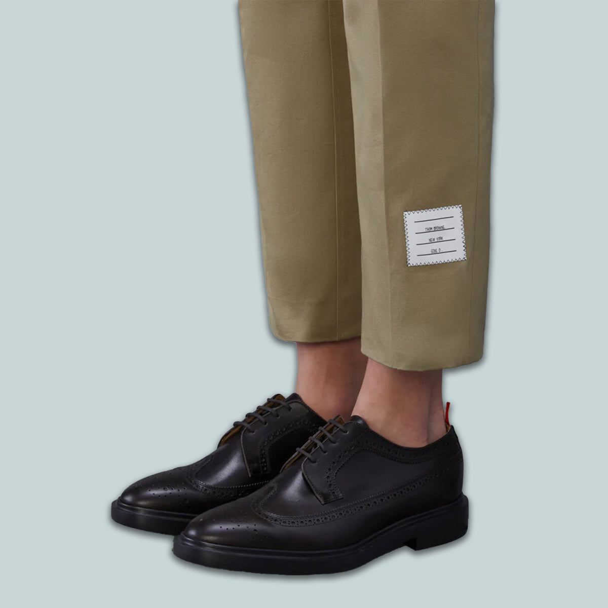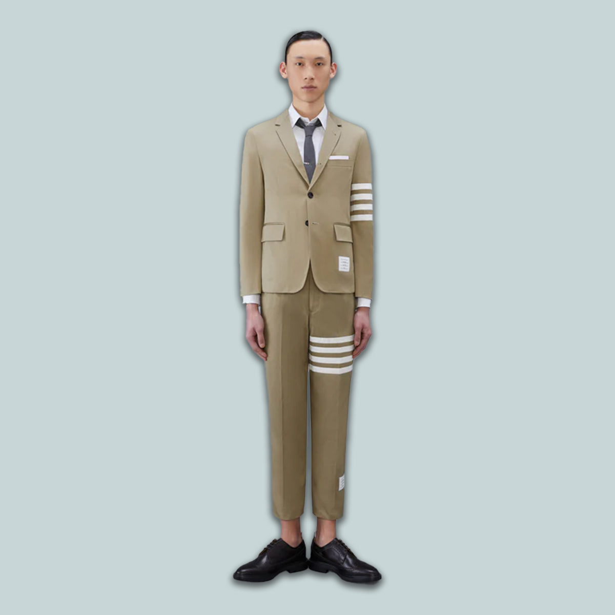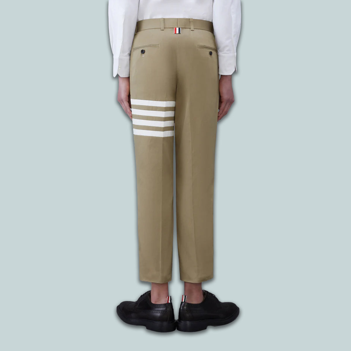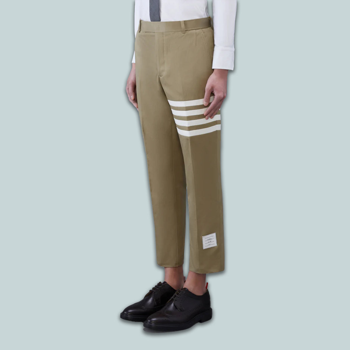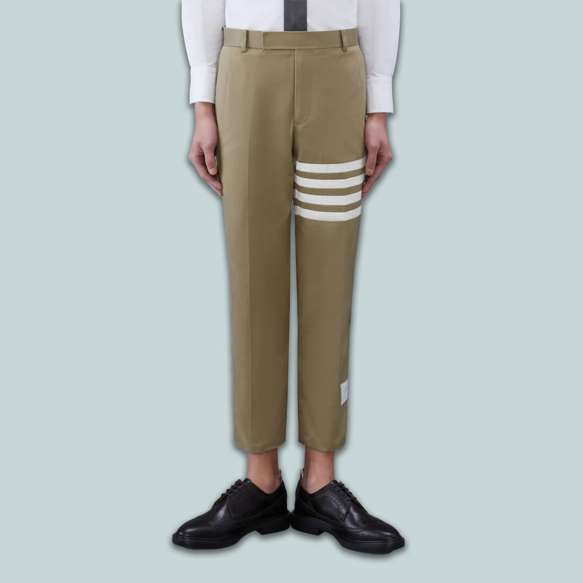 Our Cotton Twill 4-Bar Unconstructed Chino Trouser. A classic shortened hem pays homage to Thom Browne distinguished tailoring, while two signature Thom Browne emblems adorn the left leg, our signature 4-Bar stripe and nametag applique.