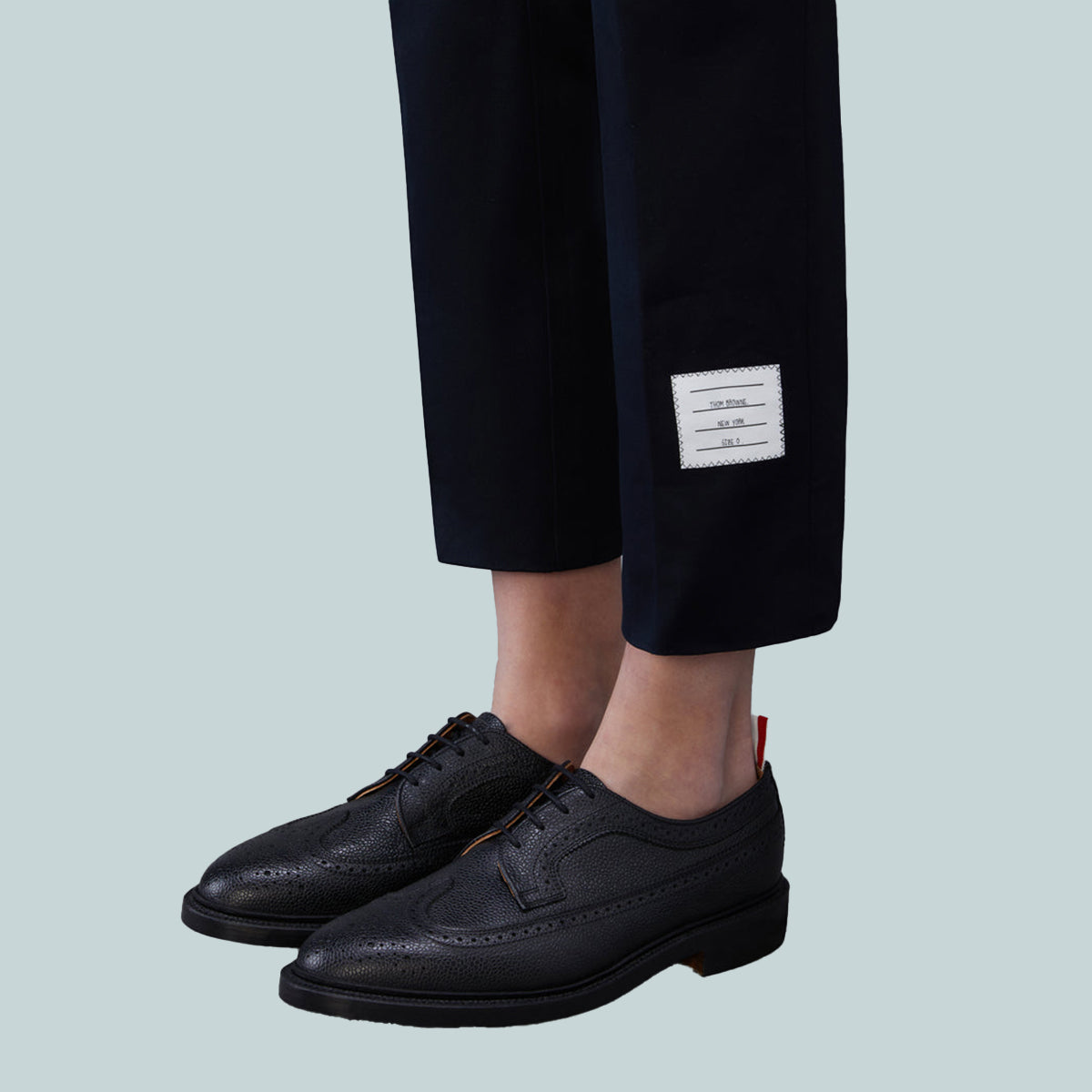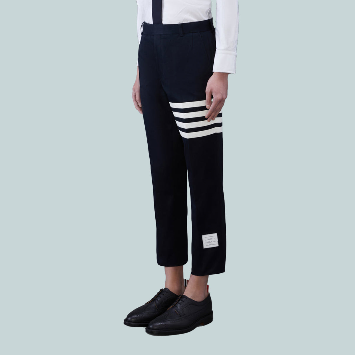 Our Cotton Twill 4-Bar Unconstructed Chino Trouser. A classic shortened hem pays homage to Thom Browne distinguished tailoring, while two signature Thom Browne emblems adorn the left leg, our signature 4-Bar stripe and nametag applique.