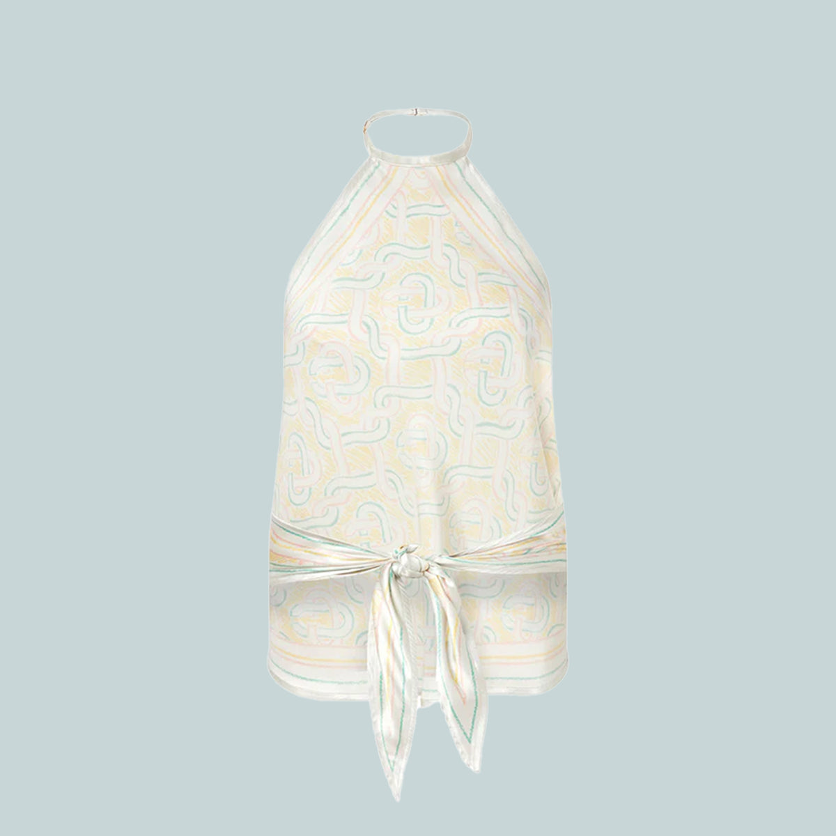 The Crayon monogram silk scarf top is a halter neck design featuring a classic monogram design, recreated using crayons to create a free-hand sketch look with pastel colours. Crafted from a printed silk satin fabric and completed with an adjustable neck fastening - designed to be fastened by tying the fabric at the back.