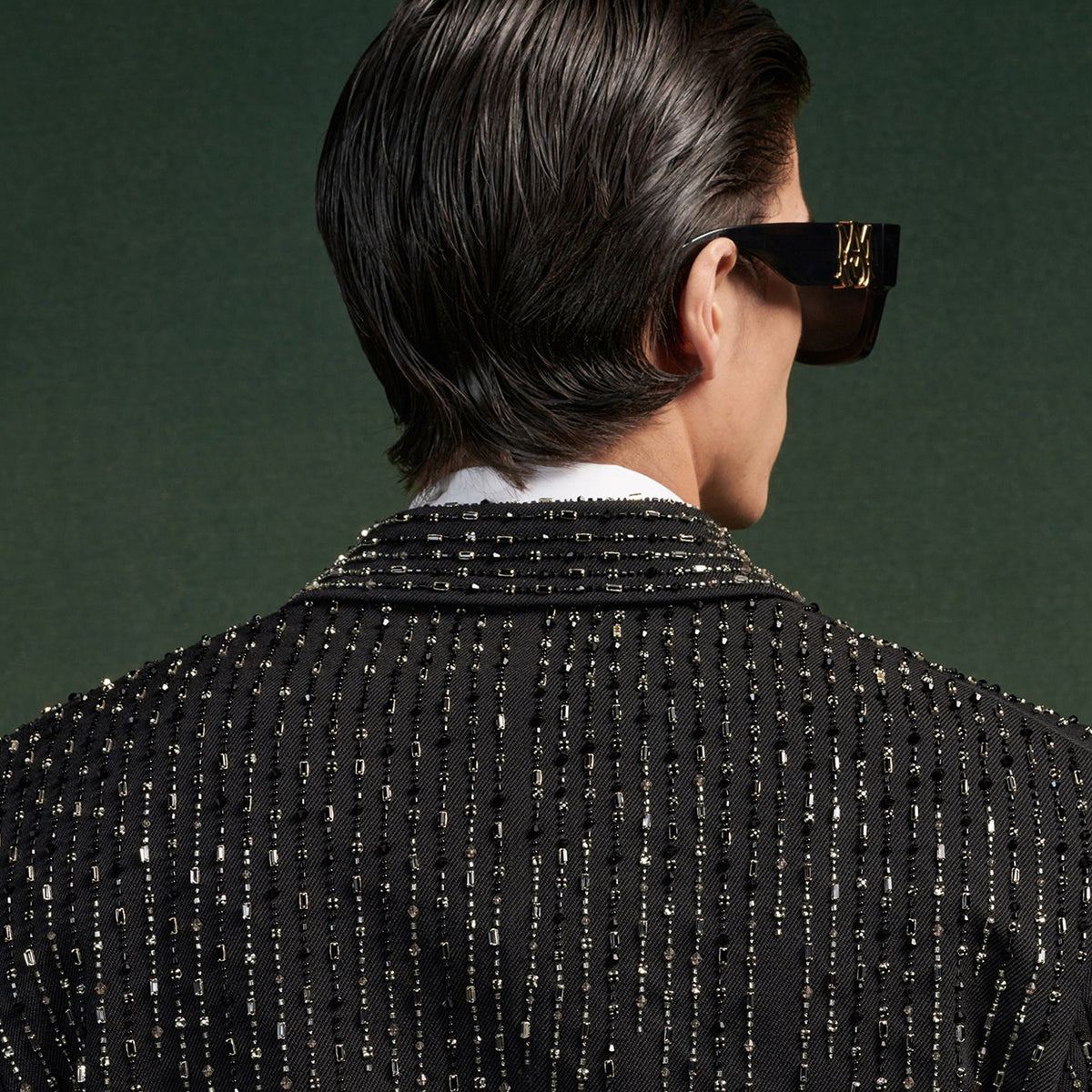 For Spring-Summer 2025, hand-placed crystals, beads, and sequins illuminate house signature tailoring silhouettes in a striped gradient effect. The Crystal Stripe Double Breasted Blazer is crafted with a wide notched lapel, welt pockets, and covered button closure.