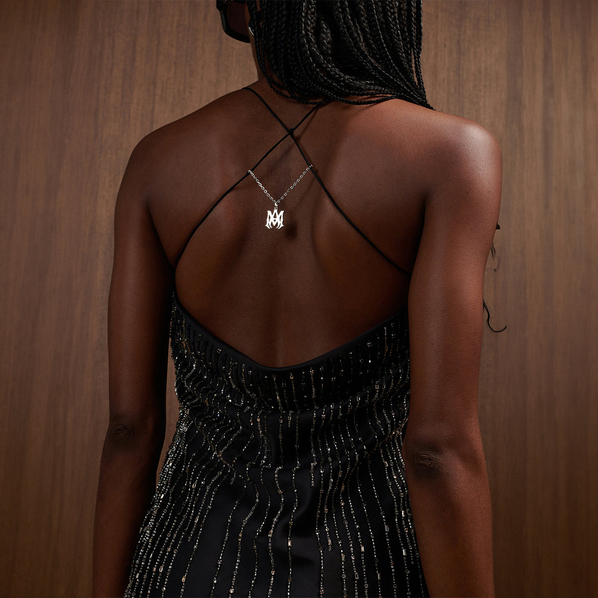 For Spring-Summer 2025, hand-placed crystals, beads, and sequins illuminate womenswear silhouettes in a striped gradient effect. The Crystal Stripe Mini Dress is designed with an open back featuring MA icon hardware suspended from a silver chain.