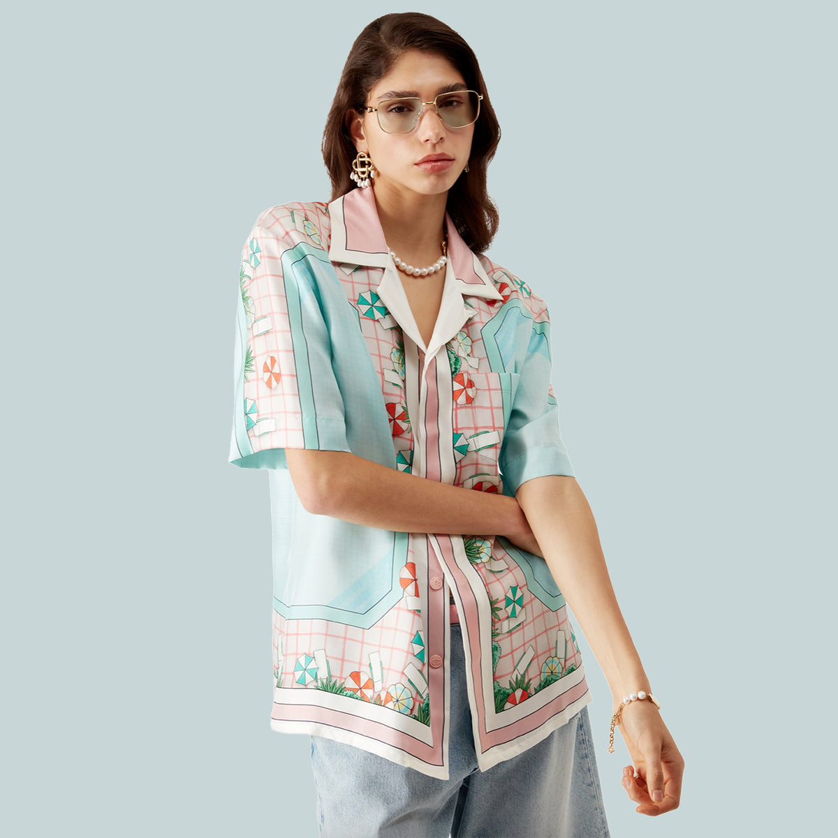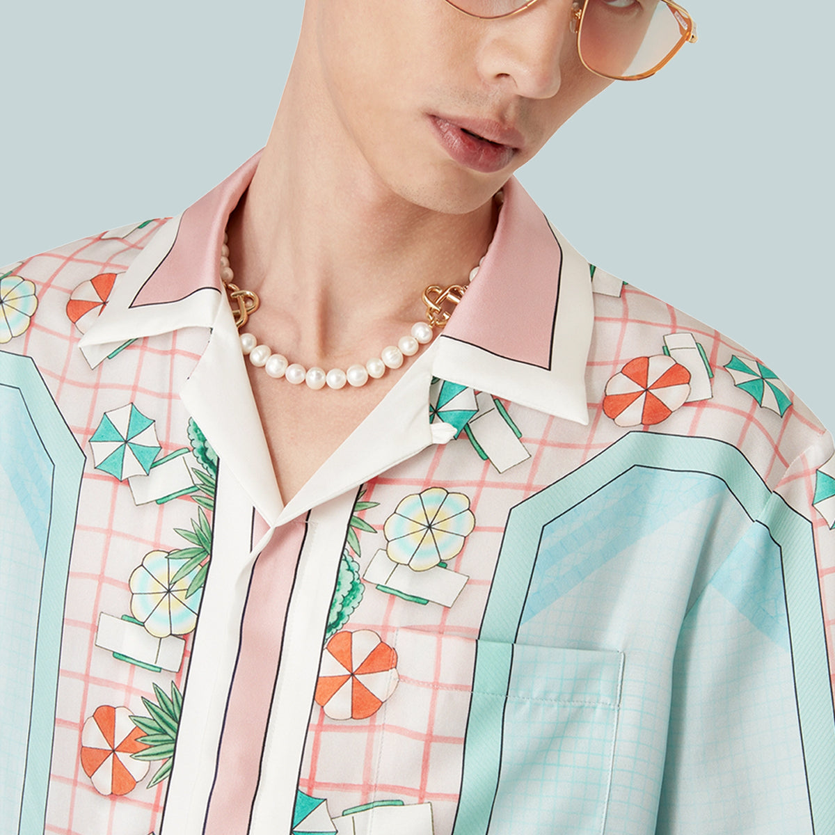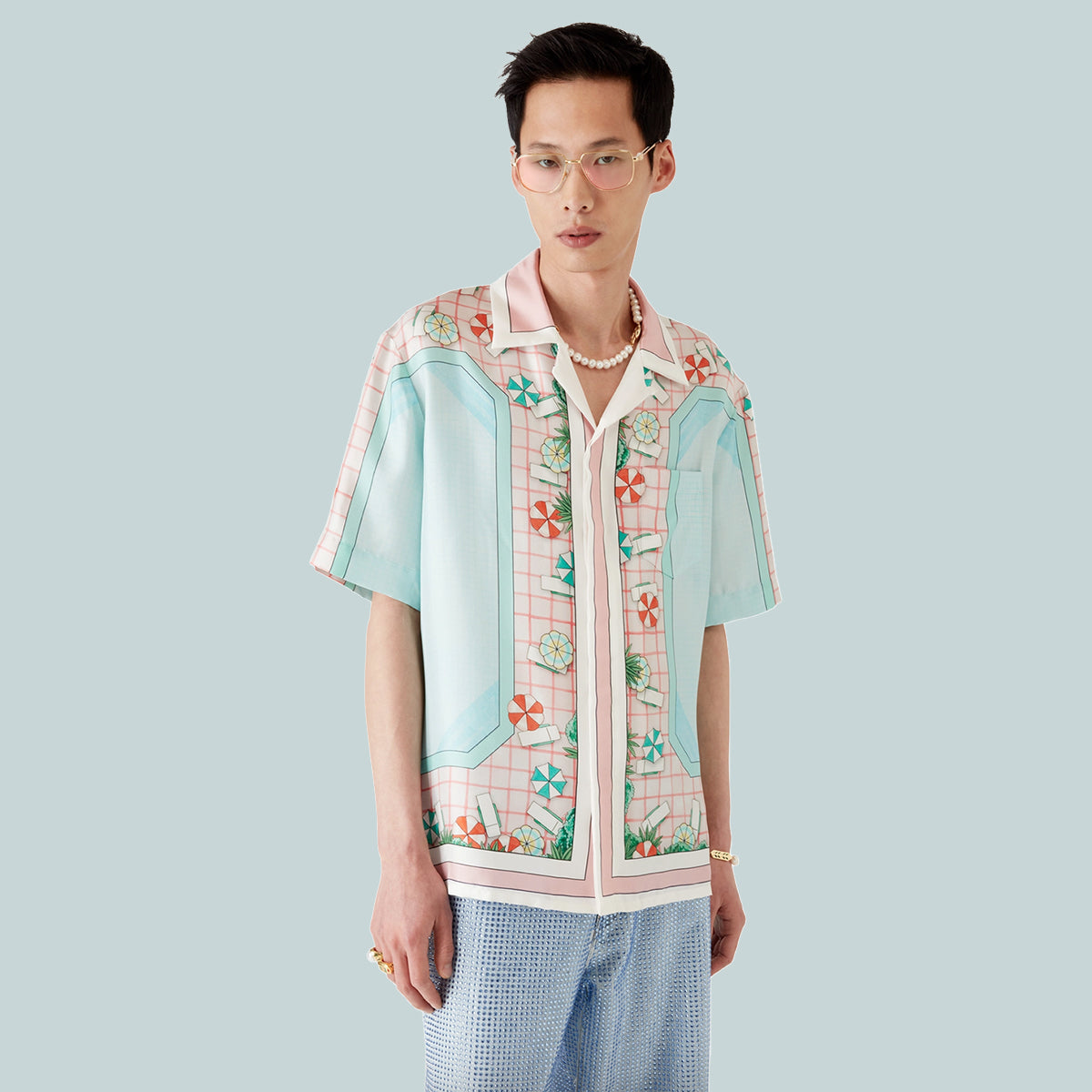 The Copacabana silk short-sleeve shirt is an all-over printed design featuring the house's signature artwork, inspired by a hotel pool and travel idealism and features a beautiful day at the pool viewed from above - giving a new perspective - crafted from silk twill fabric. Completed with a Cuban collar, hidden button closure, interlocking CC logo corozo buttons, a breast pocket, and stripe edge detail on the shoulders, collar, placket, and hem.