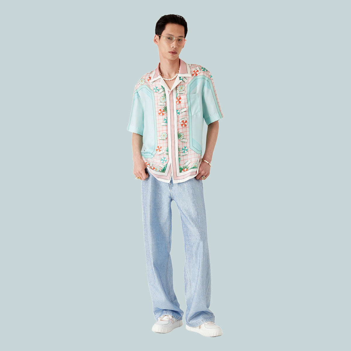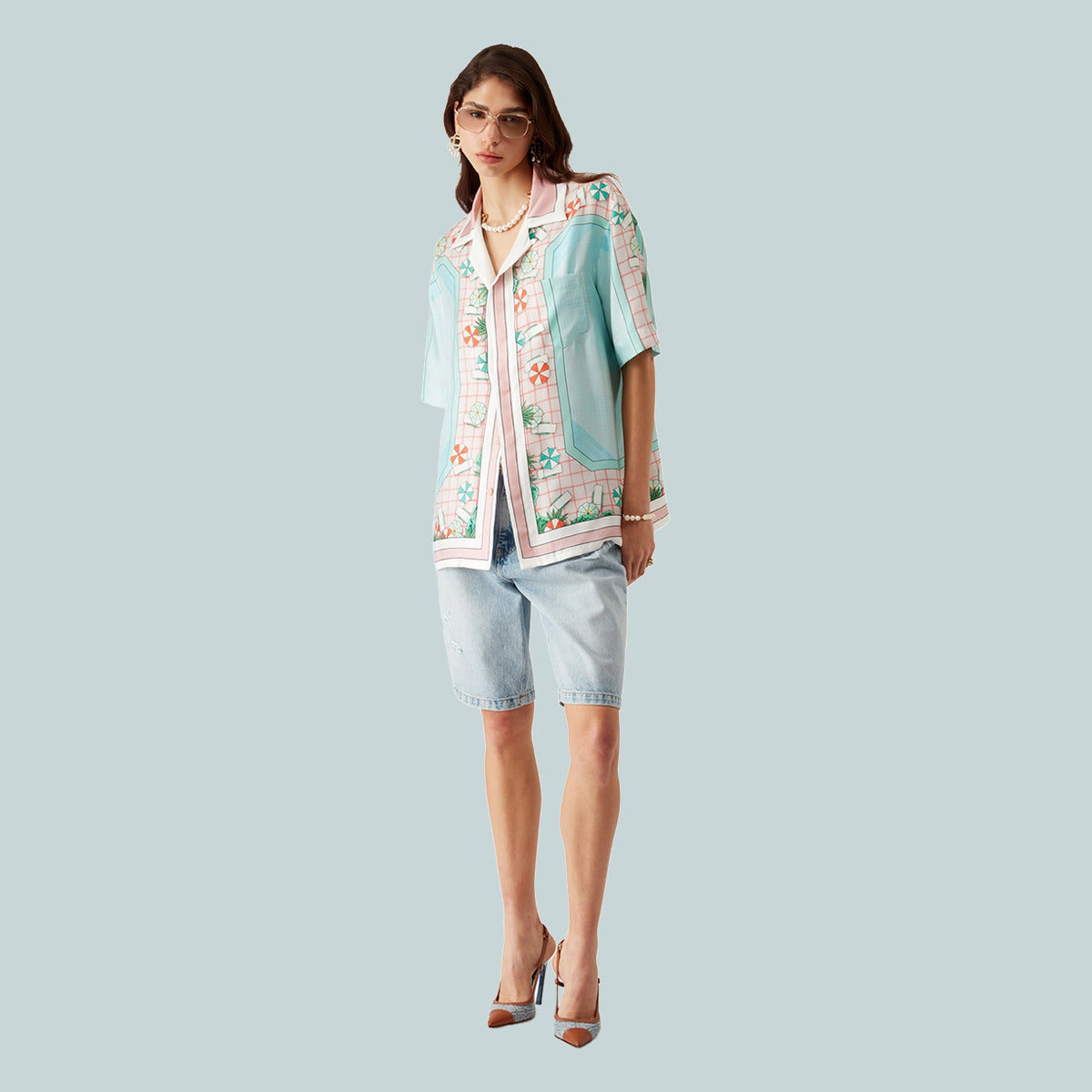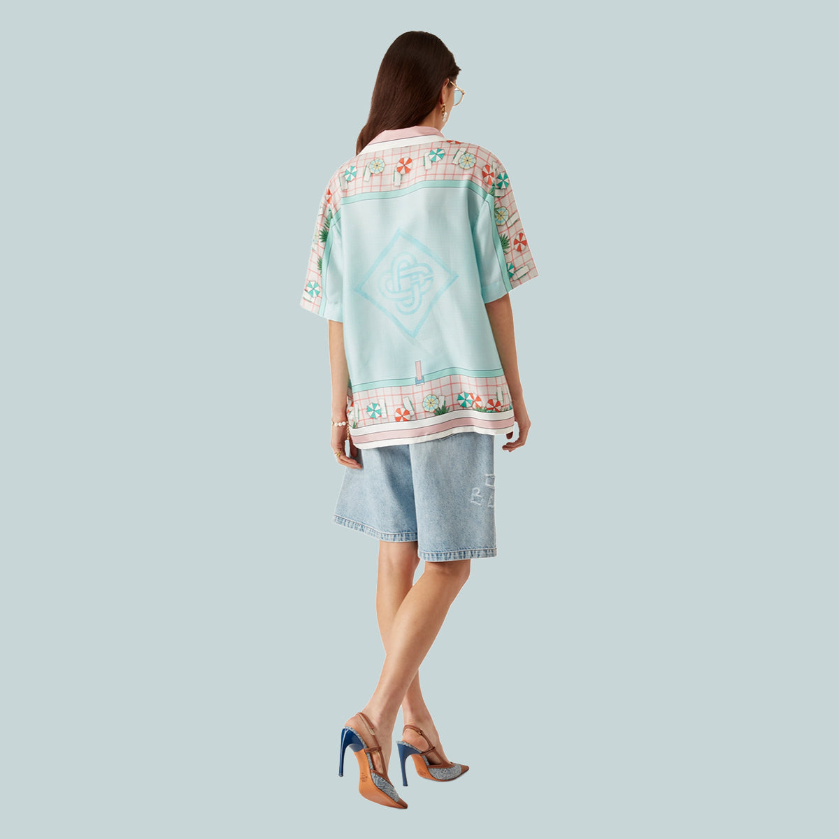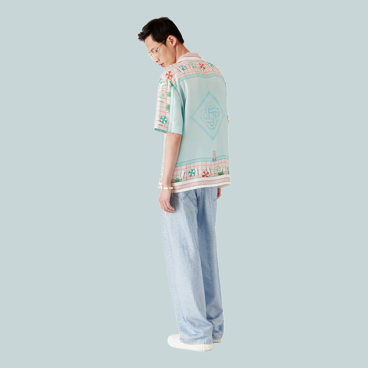 The Copacabana silk short-sleeve shirt is an all-over printed design featuring the house's signature artwork, inspired by a hotel pool and travel idealism and features a beautiful day at the pool viewed from above - giving a new perspective - crafted from silk twill fabric. Completed with a Cuban collar, hidden button closure, interlocking CC logo corozo buttons, a breast pocket, and stripe edge detail on the shoulders, collar, placket, and hem.