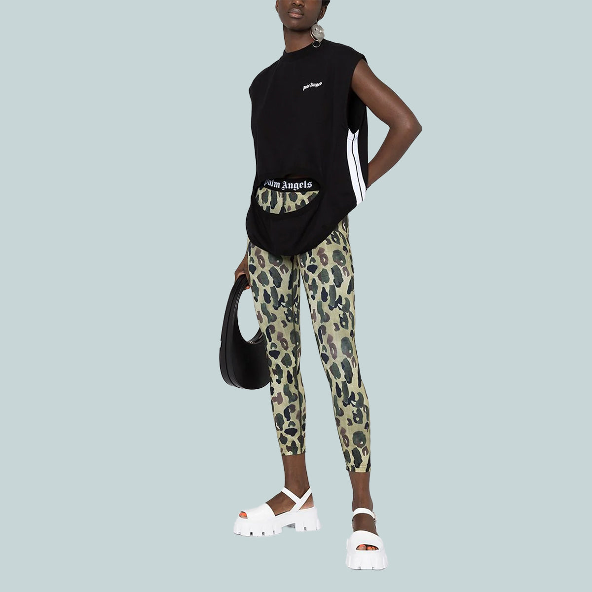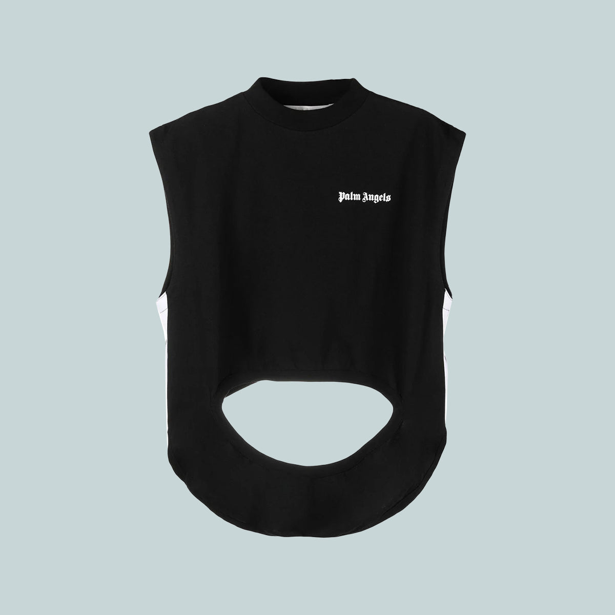 Cotton sleeveless tank top with a cut-out design and a cap-sleeve construction. Black with Palm Angels logo printed in white at chest. White side stripe detail.