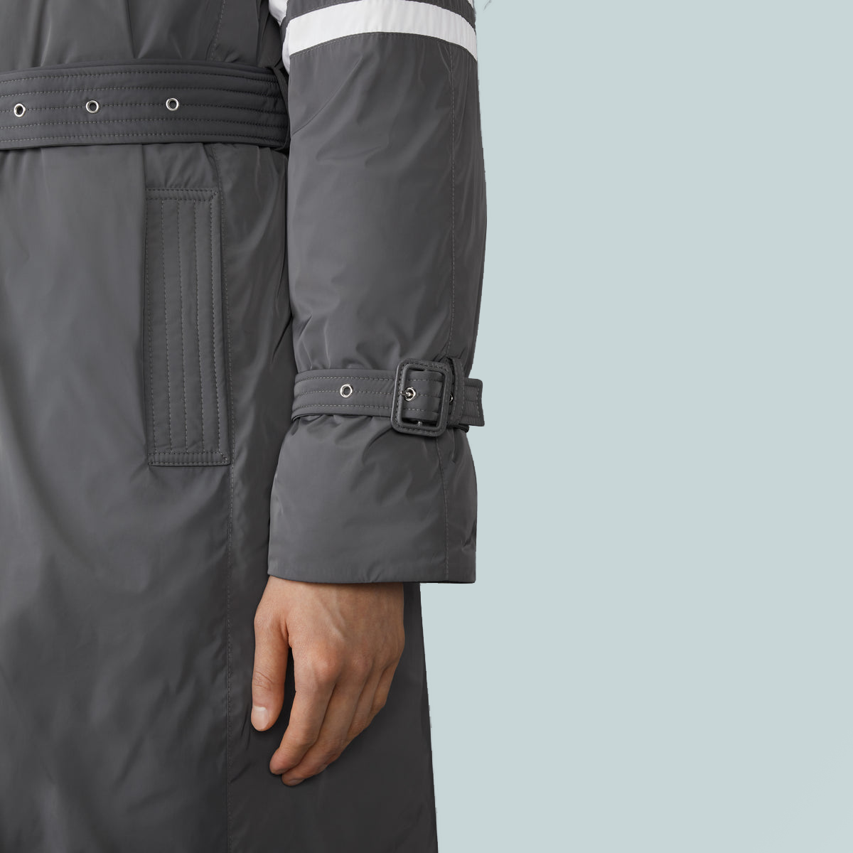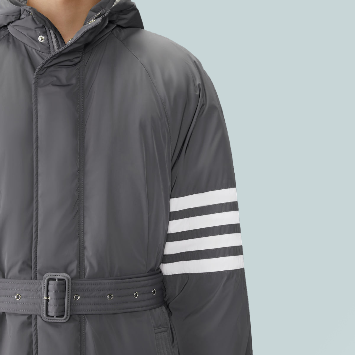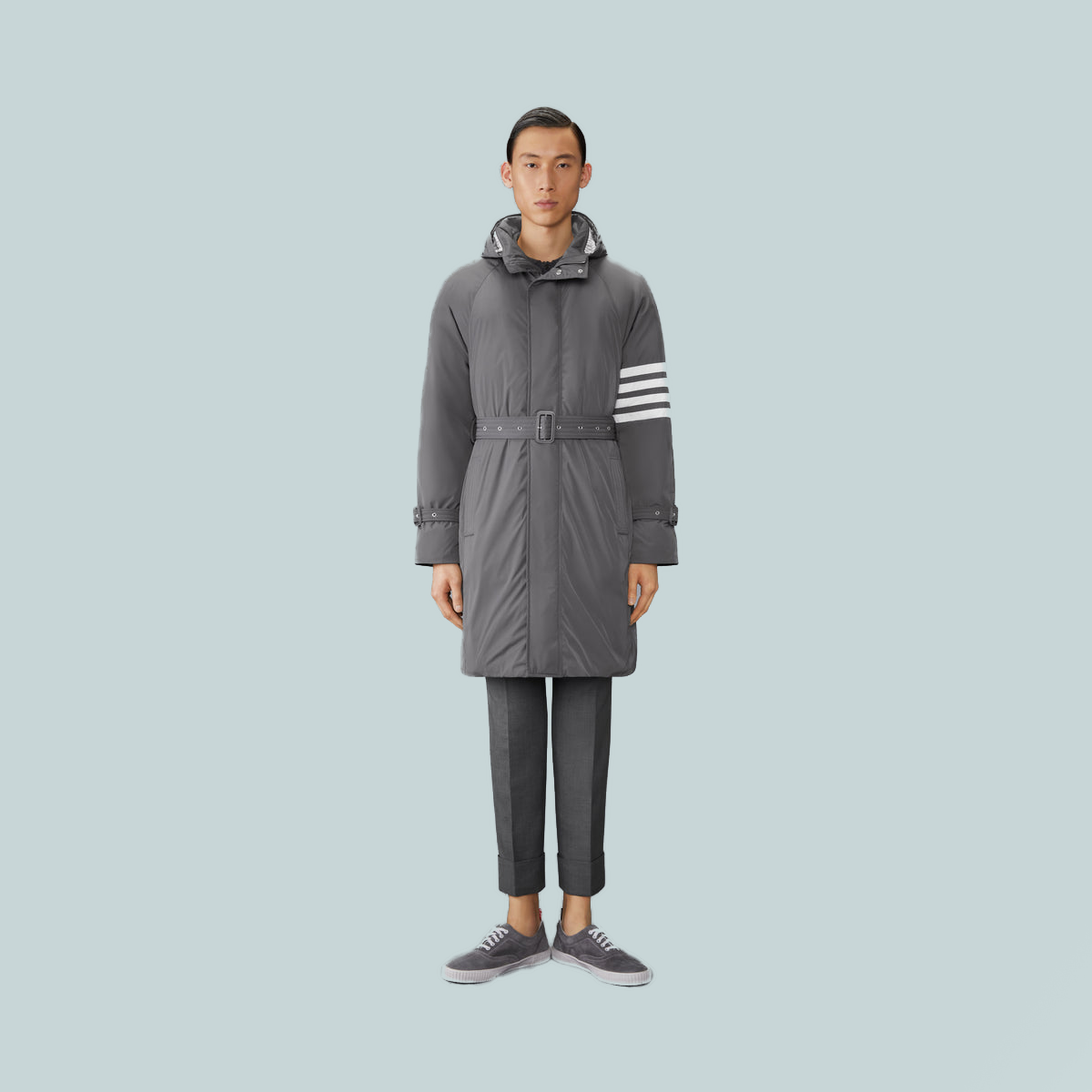 Winter weather calls for the comfort of this signature Thom Browne parka, filled with luxe down and finished with a flattering belted waist and adjustable belted cuffs. Inspired by a trip to Utah, Thom envisioned an elongated silhouette to shield more of the body from unforgiving conditions. Built to last and crafted with Thom's signature attention to detail and quality.
