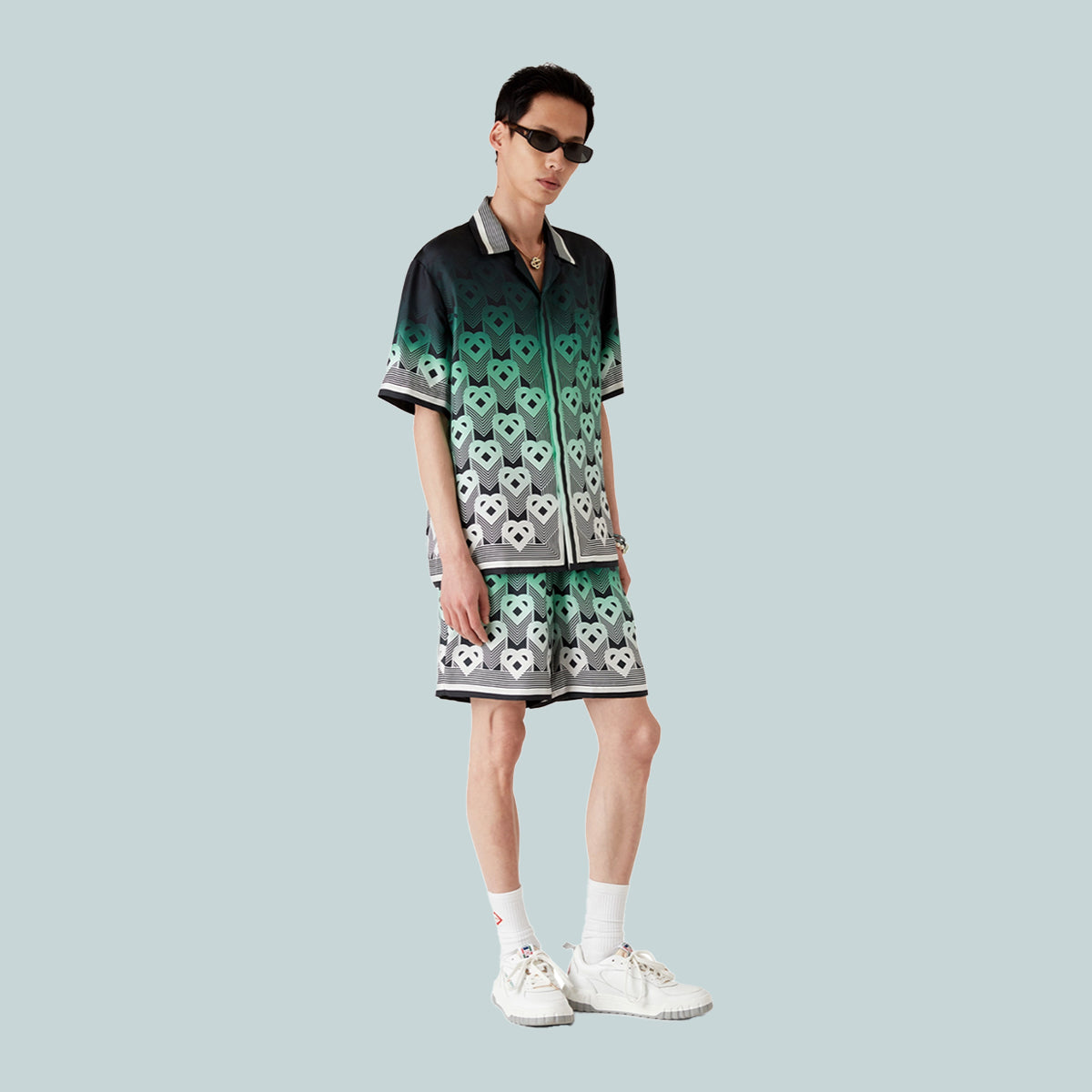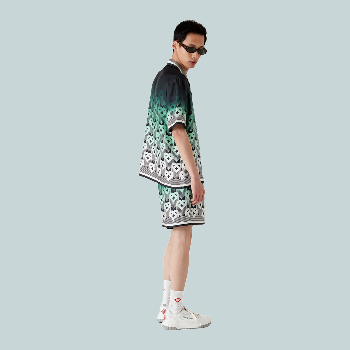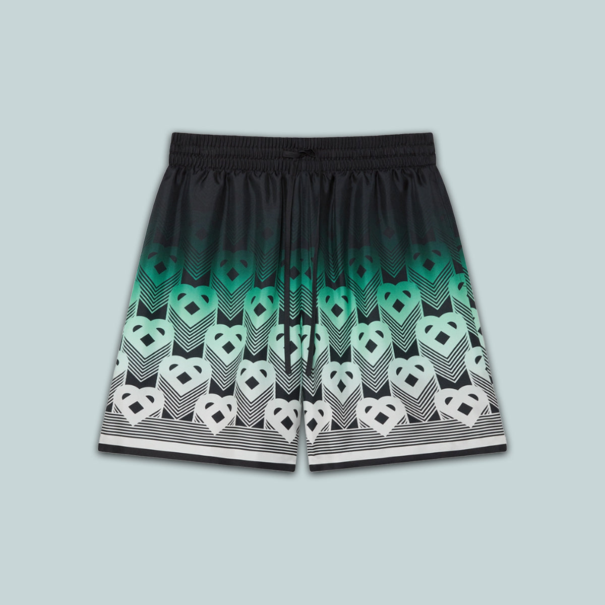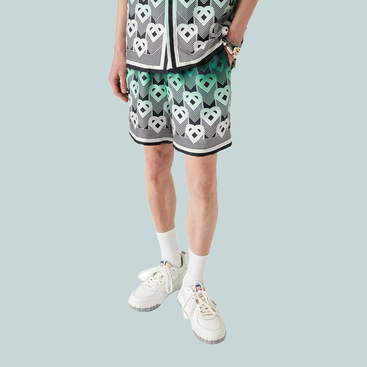 The Gradient Monogram silk shorts are an all-over printed design featuring the house's heart monogram used against a mint gradient that uses the Park Hyatt colourway - an iconic Tokyo hotel that uses mint and black in its interior design - crafted from a monogrammed silk twill fabric. Completed with an elasticised waistband, drawstring fastening, side pockets, a back pocket and striped detail on the hem.