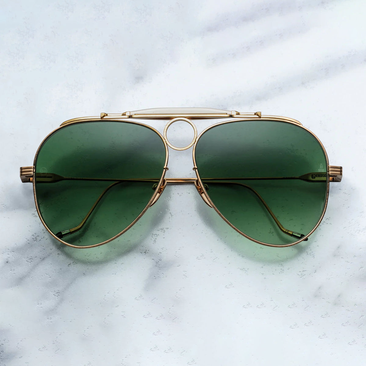 Modern interpretations of the iconic shooter-style glasses were made popular by outlaw writer Hunter S. Thompson. Handcrafted in Japan utilizing 100% beta titanium, these startling spectacles feature our signature tailfin-temple-tip with a custom black epoxy detail.