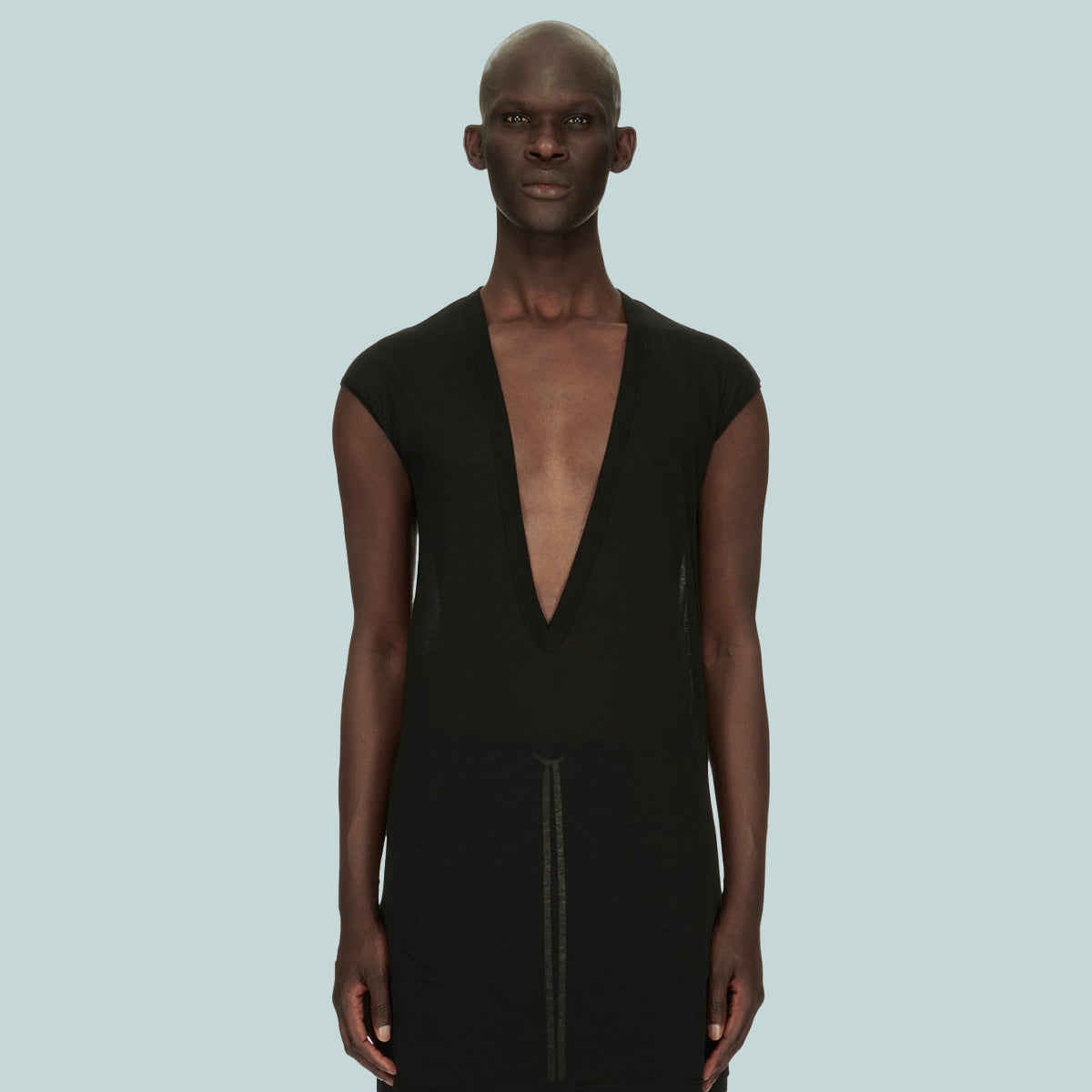 This dylan t is below hip length. it has an extreme deep v neck with a raw cut hem and reinforced raw cut, wide, tank shoulders. it features the signature single seam running down the centre back spine.