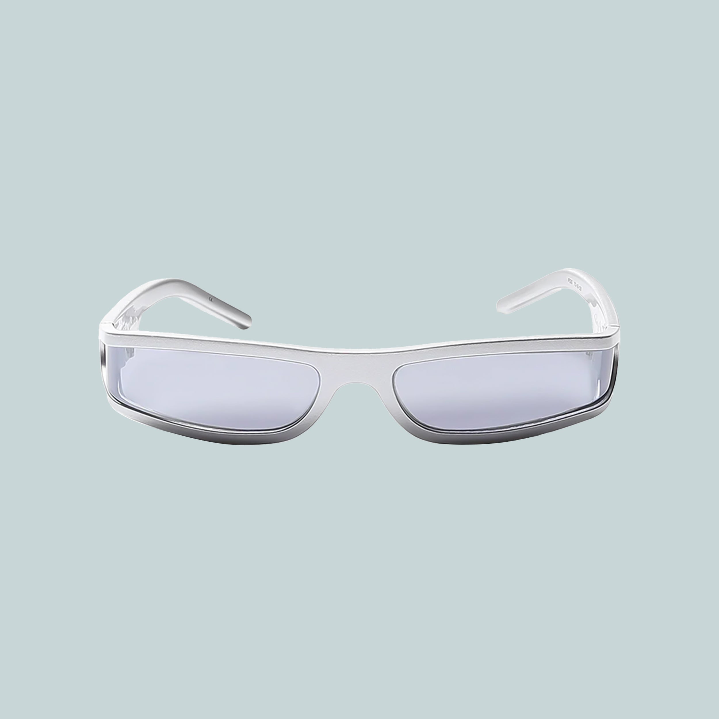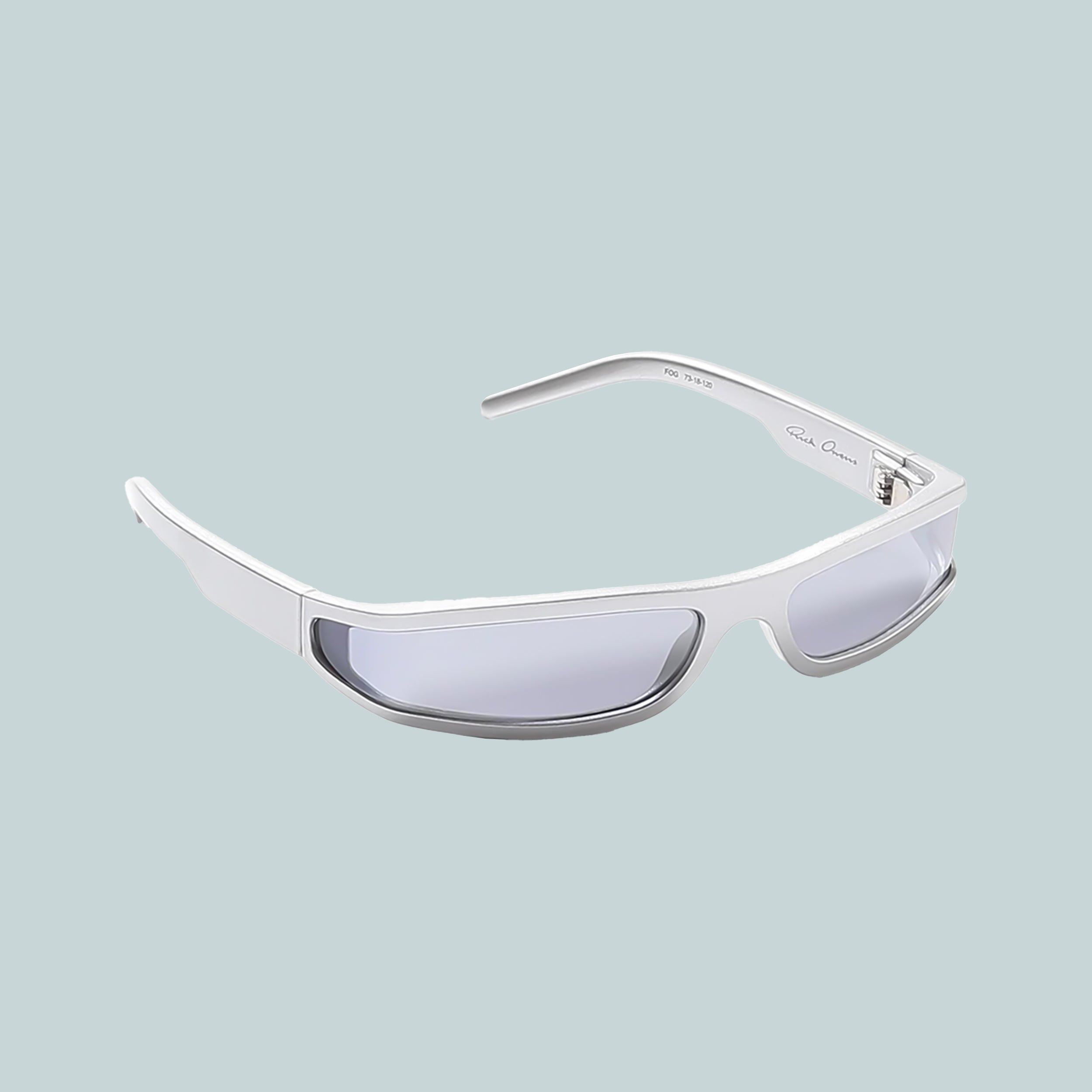 The Fog sunglasses by Rick Owens. A slim wrap-around frame with lenses that extend to fold around the temple.