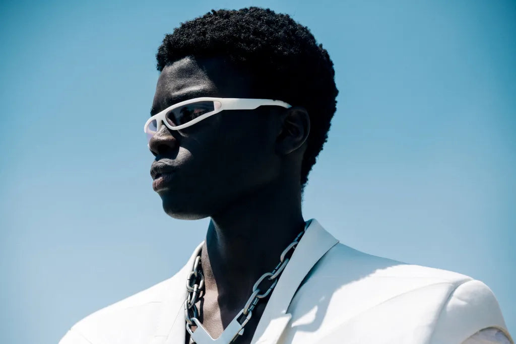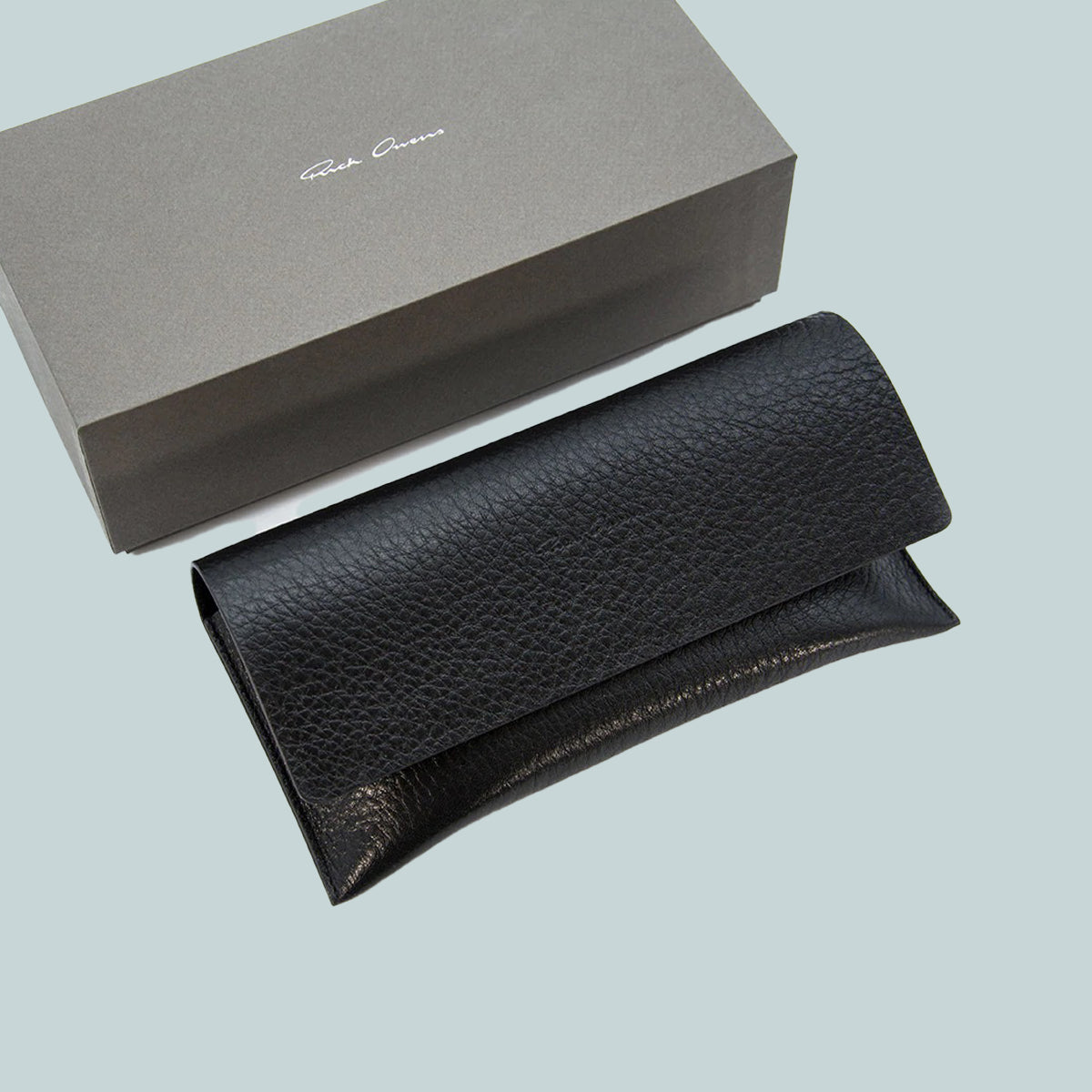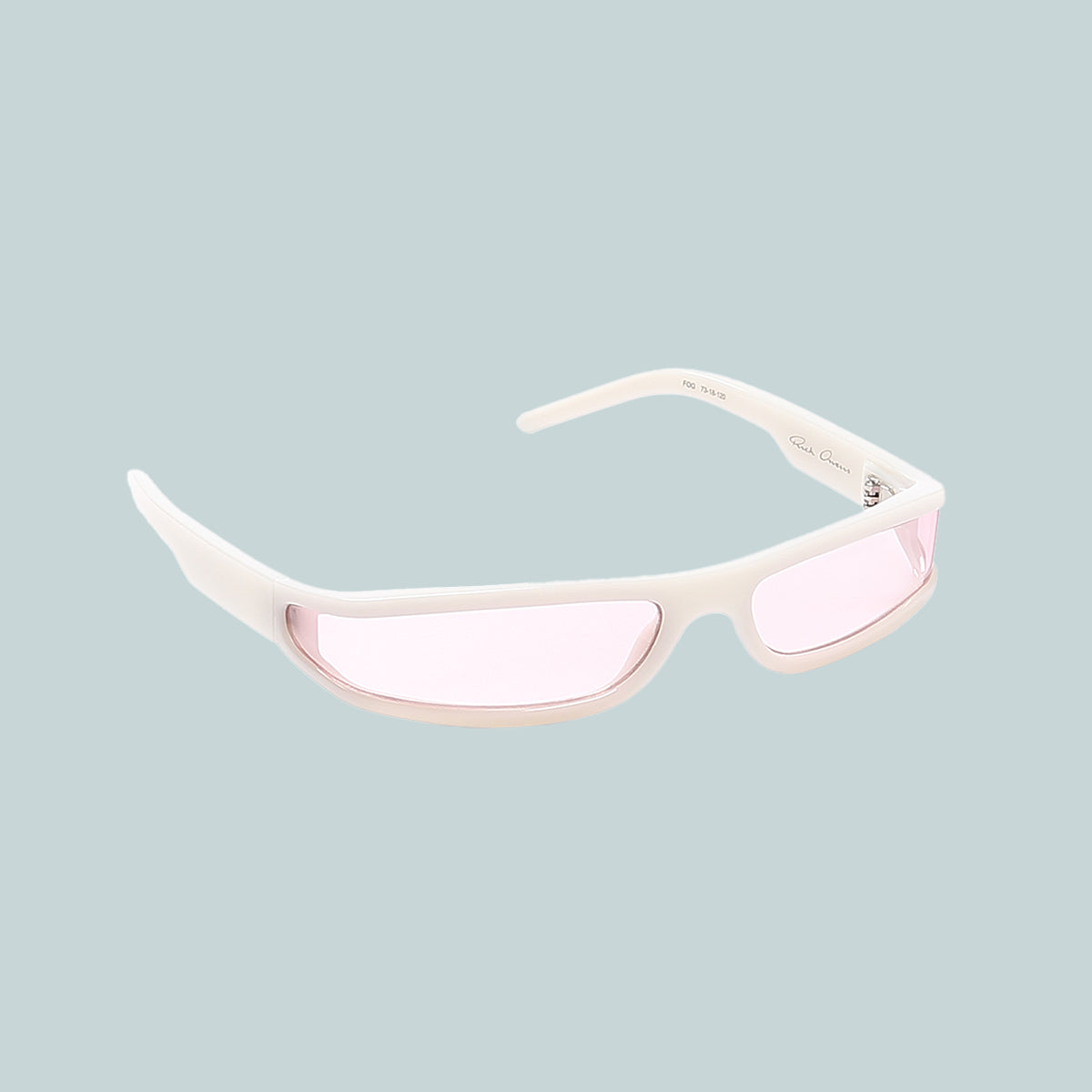 The Fog sunglasses by Rick Owens. A slim wrap-around frame with lenses that extend to fold around the temple.