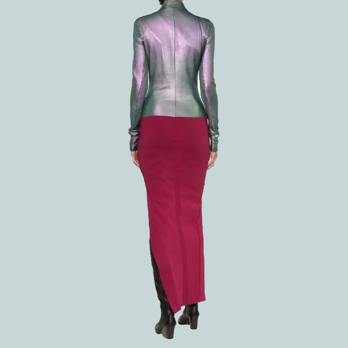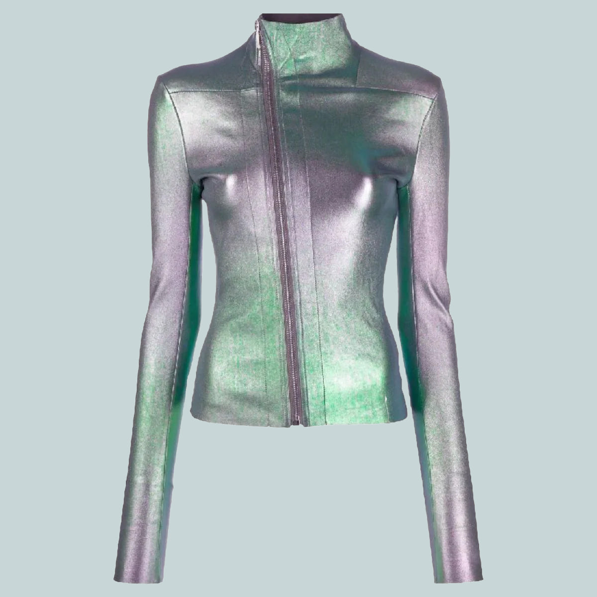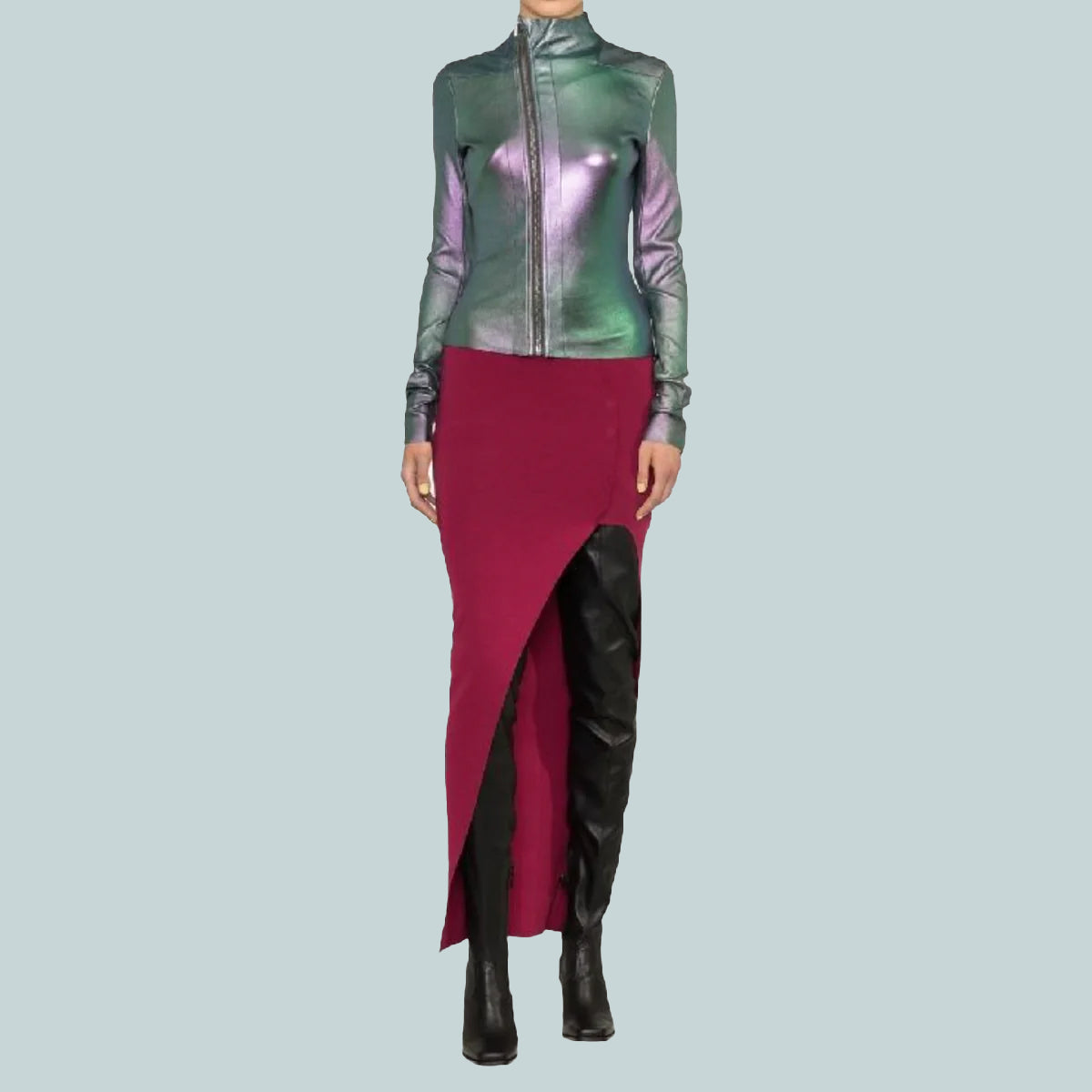 This Gary jacket is below waist length with a skin tight fit. It has long sleeves, a high neck with an asymmetrical zip front opening and level shoulder seams with topstitching.