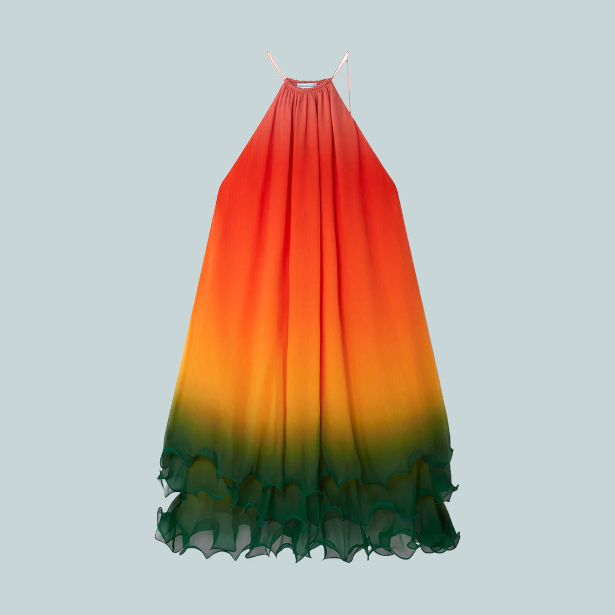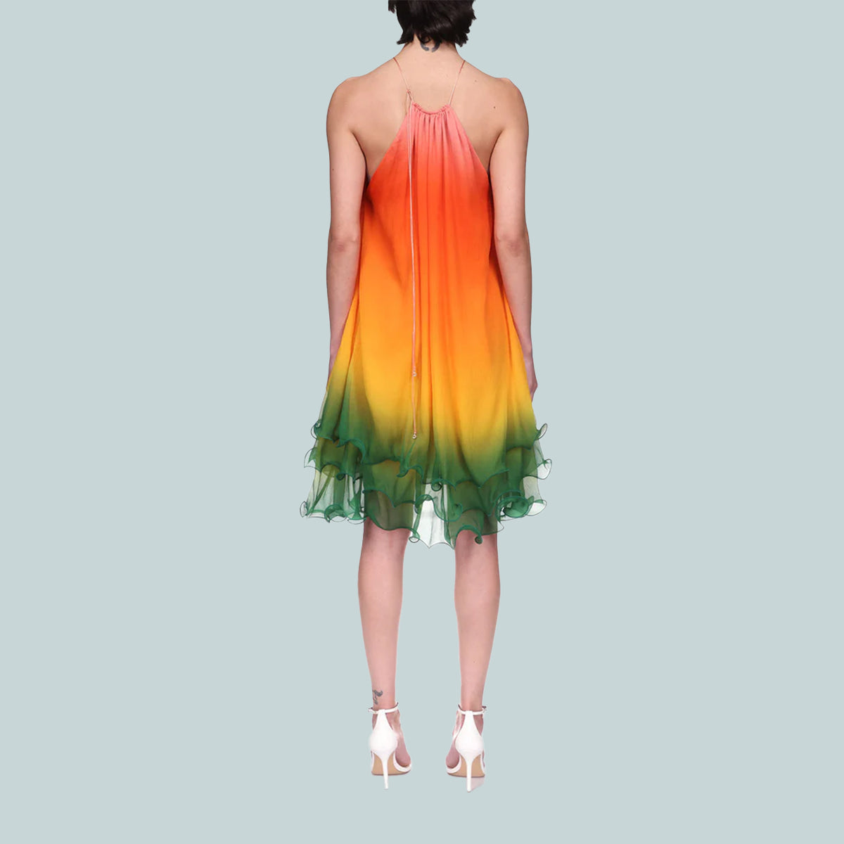 The Rainbow Gradient cocktail dress is a sleeveless design crafted from silk crepe fabric, featuring three layers of the season's rainbow gradient print representing the rich exchanges across cultural disciplines in African art, music and film. Completed with a halter neck with string fastening.