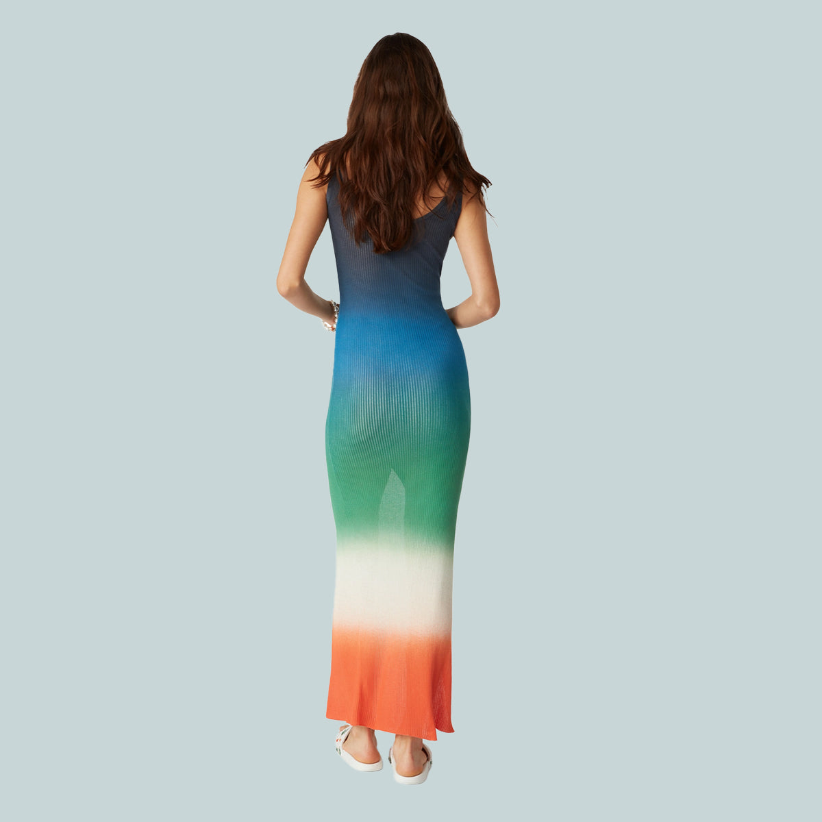 The gradient rib dress is a printed sleeveless design featuring the house's seasonal vibrant gradient print of deep inky blues transitioning through shades of pink to vibrant orange, representing the summer’s shifting sky, sinking into the ocean’s horizon, alluding to nature’s ever-changing canvas. Completed with button closure, a scoop neckline, narrow shoulder straps, and signature gold rim pearl buttons.