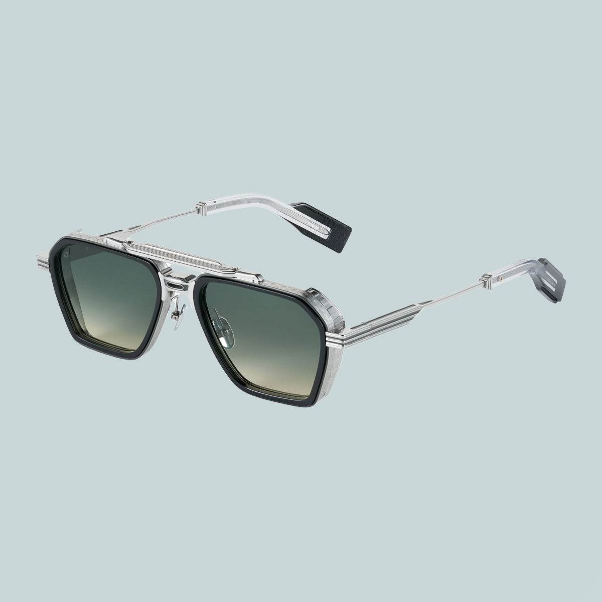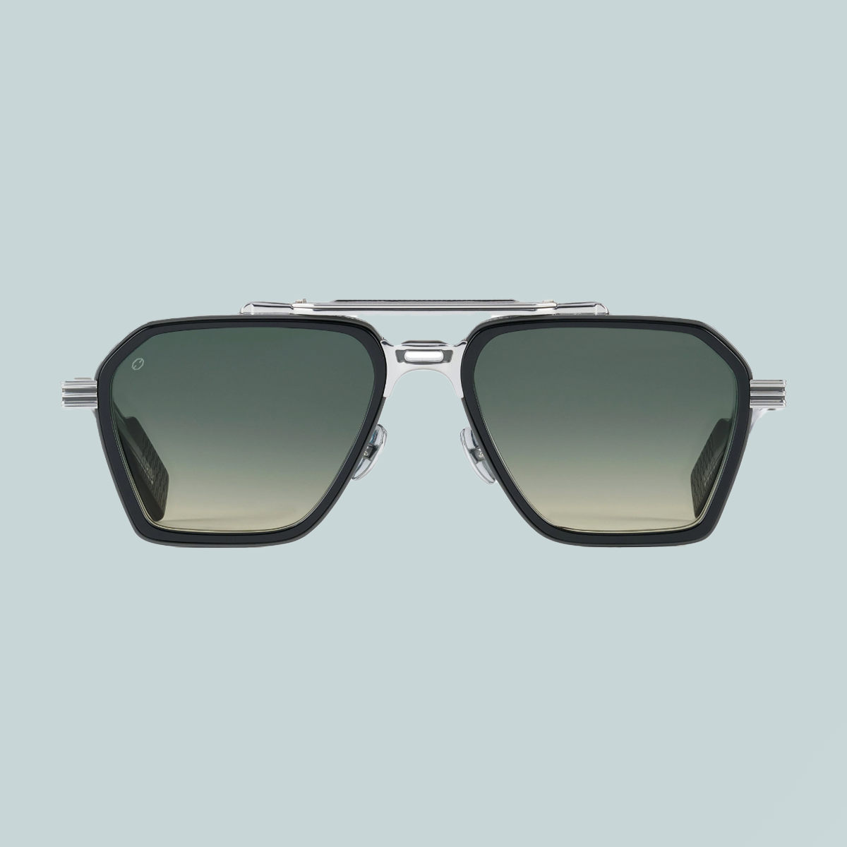 A modular nose bridge system fuses dual plating colors, complemented by a robust two tone brow bridge construction with exquisite detailing and architectural elements.