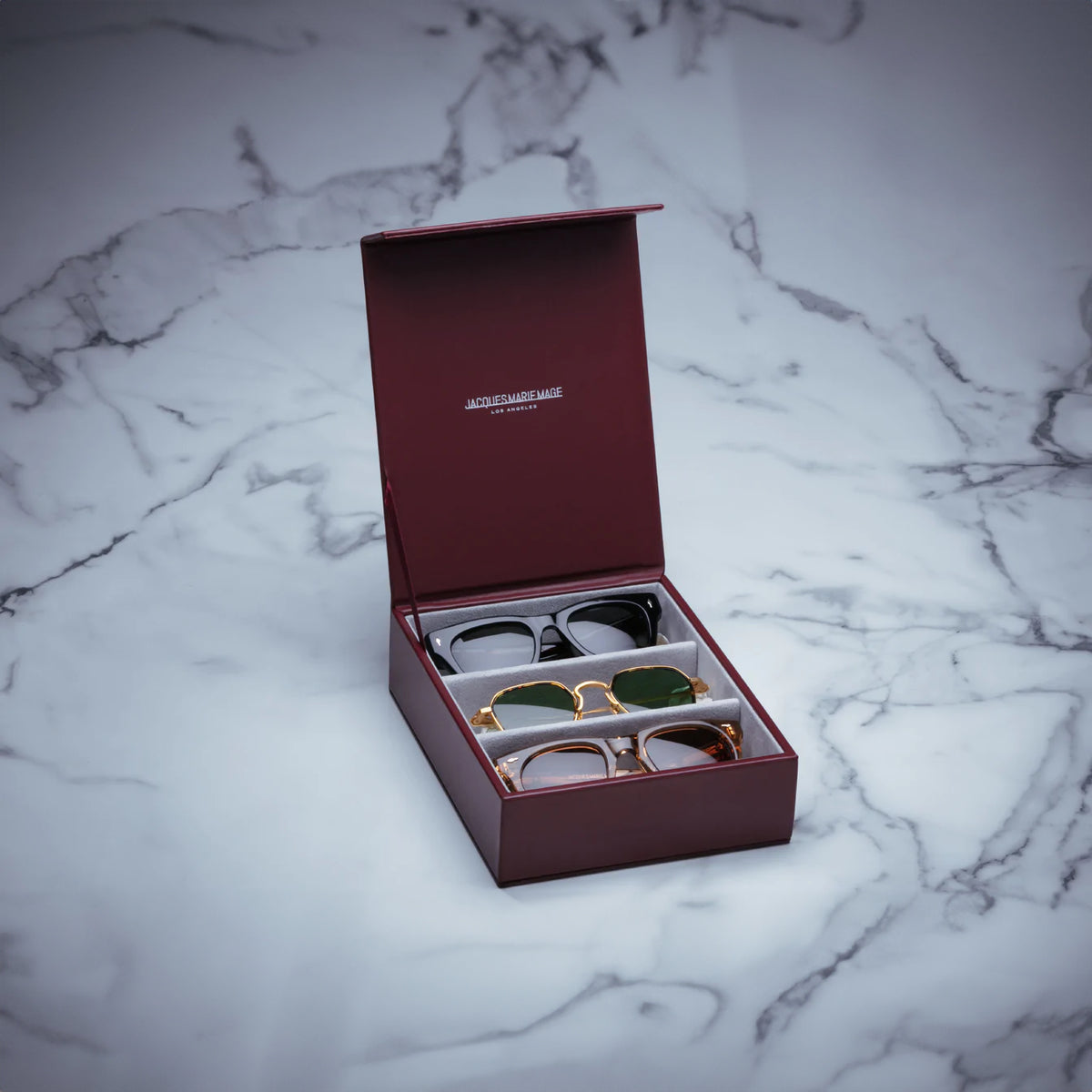 The Jacques Marie Mage collector eyewear tray is the absolute accessory to showcase your JMM collection. Handcrafted to Jacques Marie Mage specification in Italy out of cowhide signature burgundy leather.