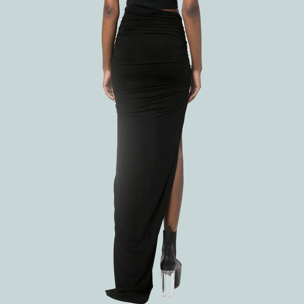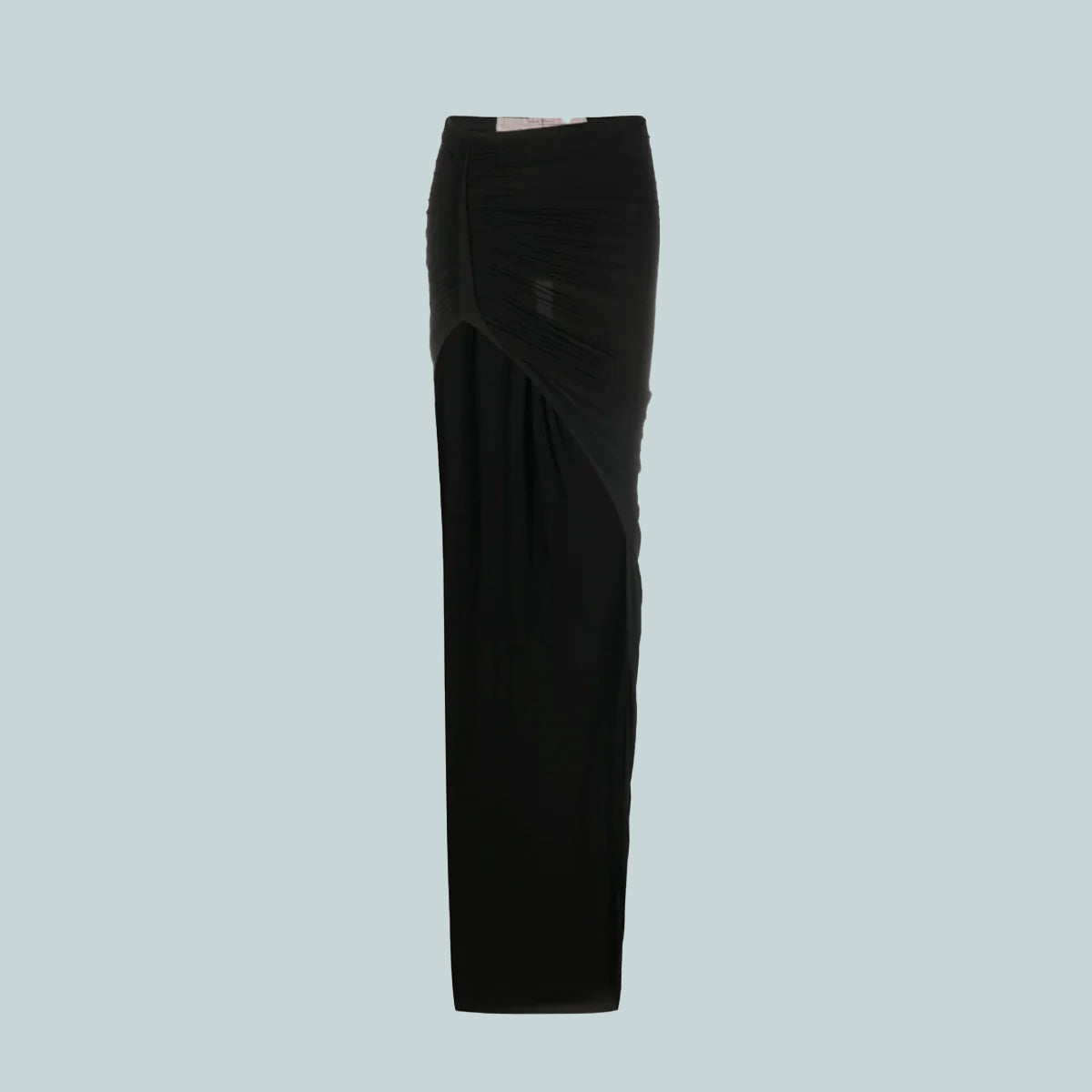 Asymmetric maxi skirt. Following the brand's monochrome palette, this asymmetric maxi skirt from Rick Owens arrives in a light grey shade. It has a stretch design and a sleek, floor length.