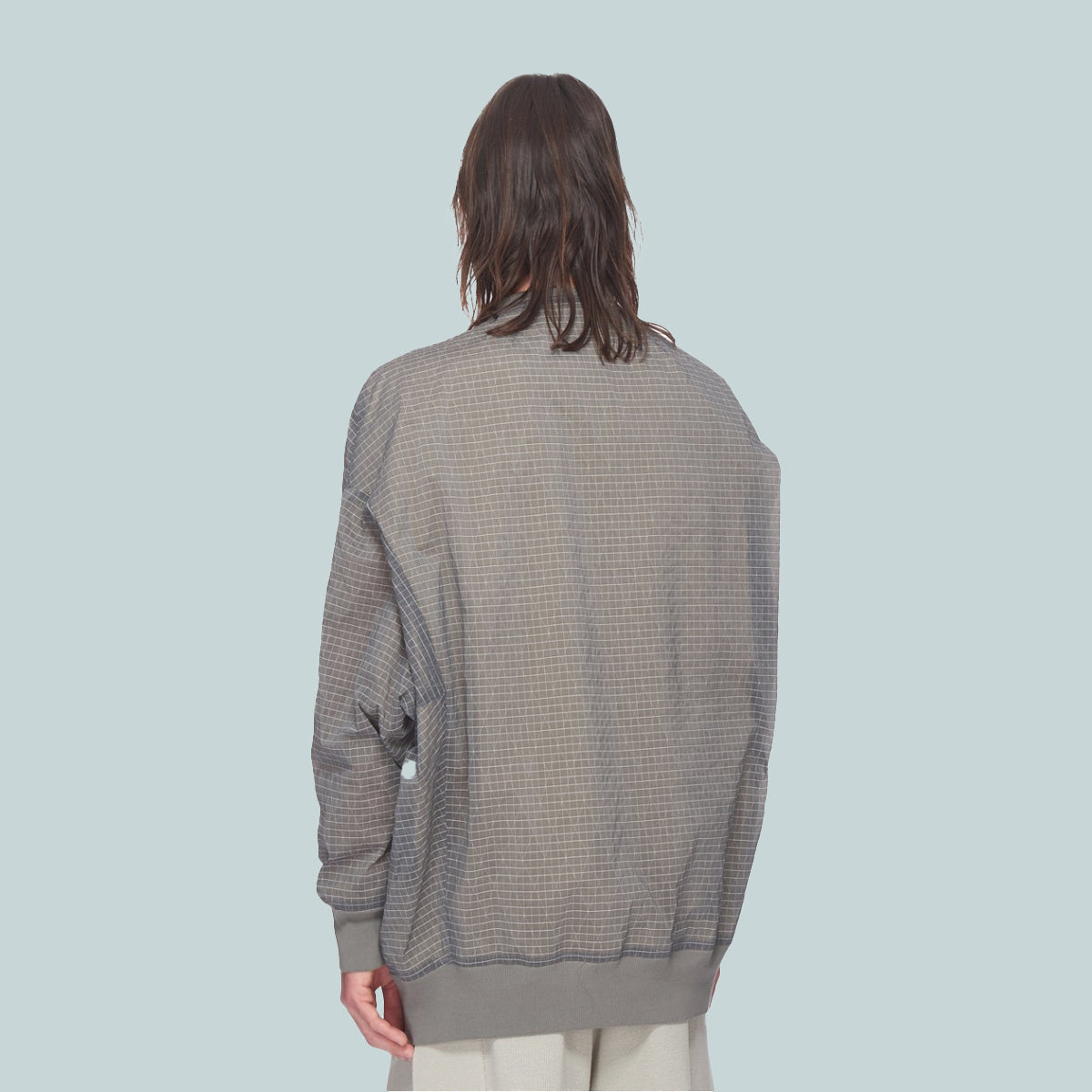 This jumbo peter flight is below hip length with a jumbo oversized fit. It has a centre front zipper, top snap detail, long sleeves and low shoulders with a dropped armhole and level shoulder seams. It has two side seam pockets with visible snaps and a ribbed collar, cuffs and hem.