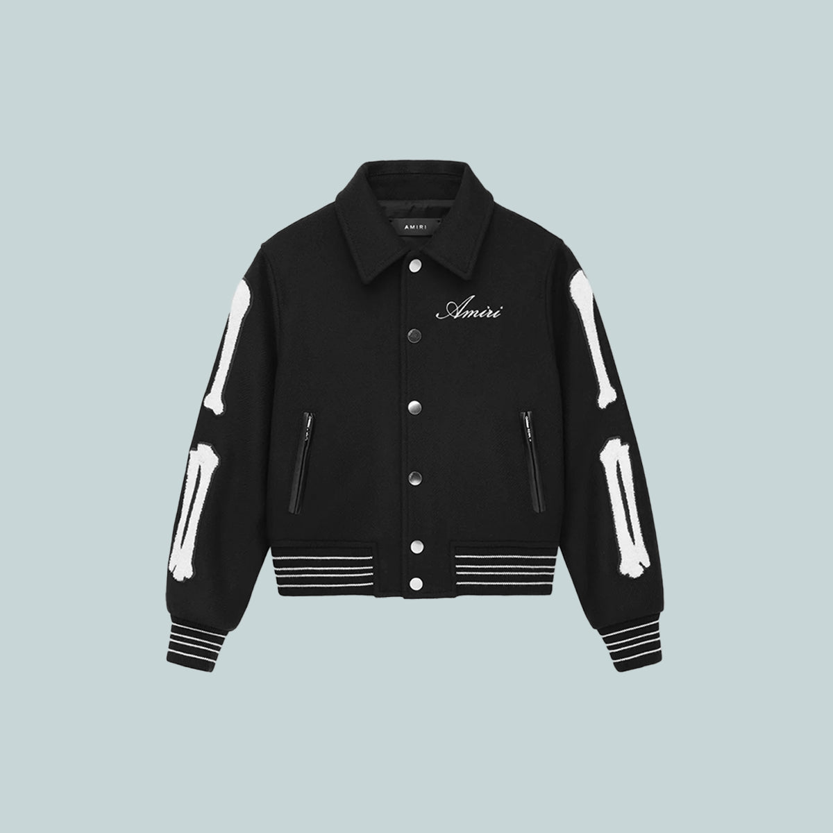 A renegade take on a classic outerwear silhouette emerges as a definitive house icon. The Bones Jacket is crafted in wool with chenille bone appliqué and finished with welt zipper pockets, striped rib accents and classic snap front closure alongside the embroidered AMIRI script logo at chest.