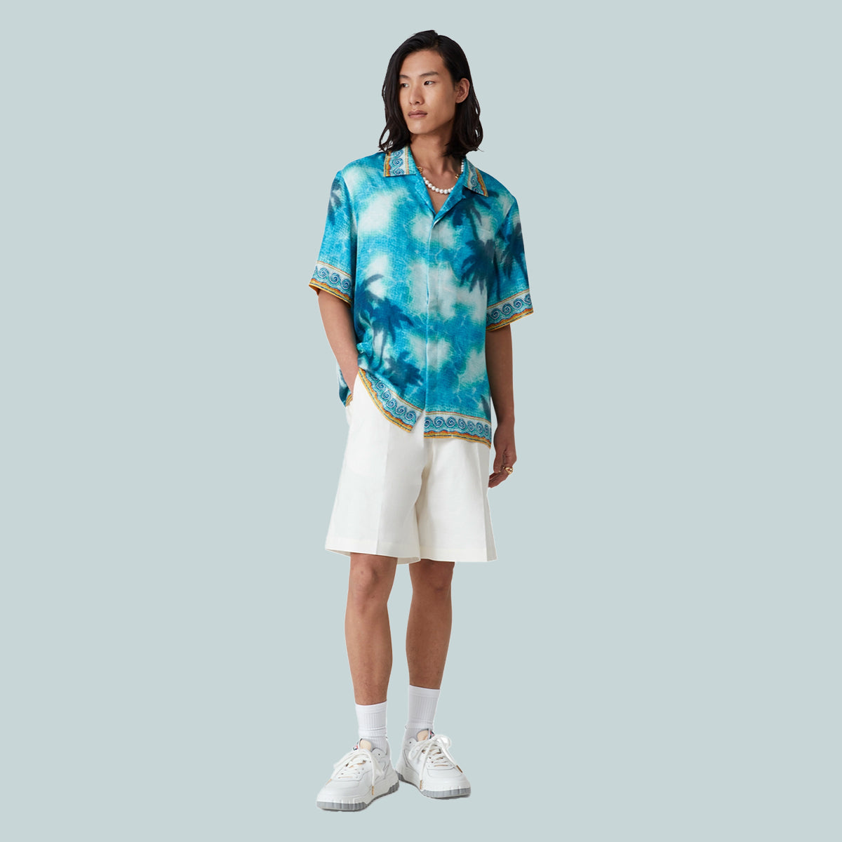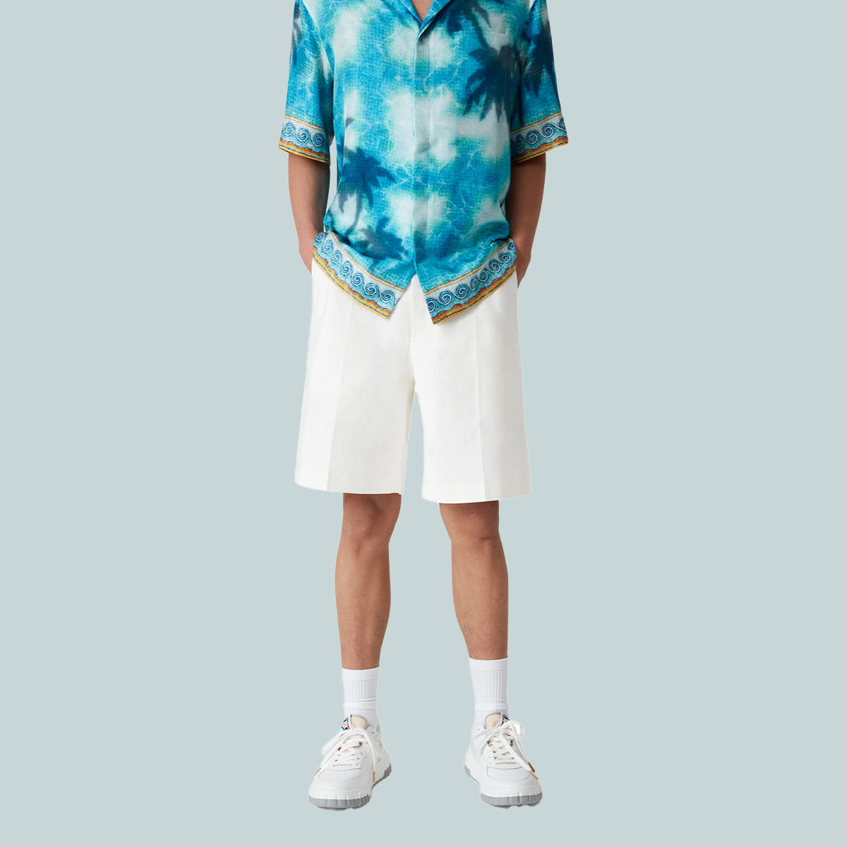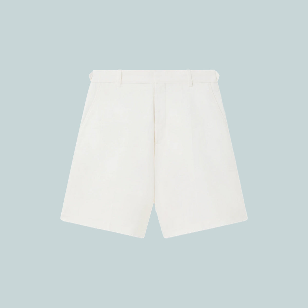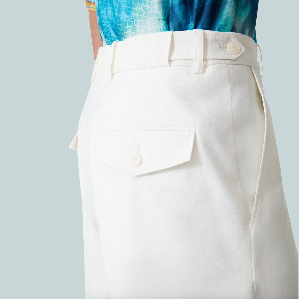 The linen pleated shorts are a tailored design crafted from a cotton blend fabric. Completed with zip closure, adjustable waistband featuring interlocking corozo buttons and belt loops, slanted side pockets, and back flap pockets with button closure.