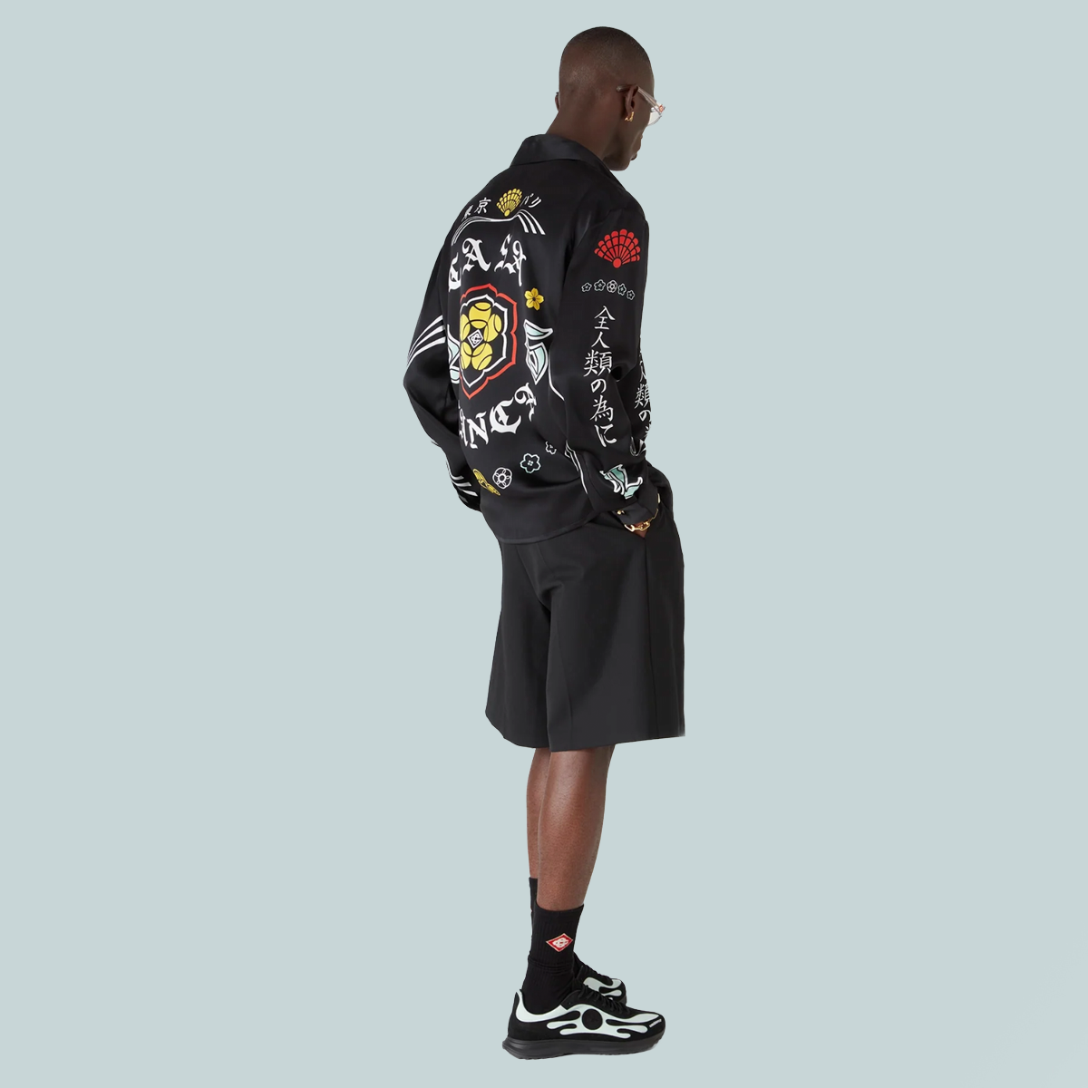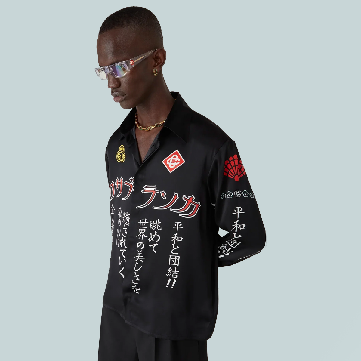 The Emblem long-sleeve silk shirt is a printed design featuring the season's artwork - we drew inspiration from the Japanese subculture of Bōsōzoku for one of our main themes. The contrast between graphic elements and text felt very Casablanca to us. We created our own take, incorporating phrases that describe the brand, like “looking at the beauty of the world.” The layout is unconventional, but the composition is carefully balanced, giving it a unique yet harmonious feel. Completed with a point collar, button closure, interlocking CC logo corozo buttons, gold rim enamal buttons at the cuffs, and at the collar.
