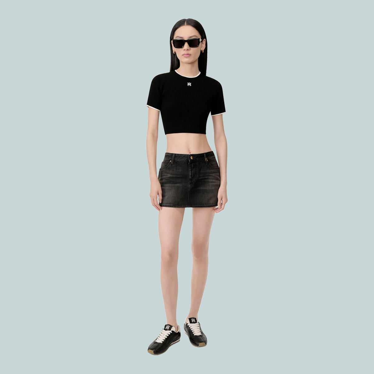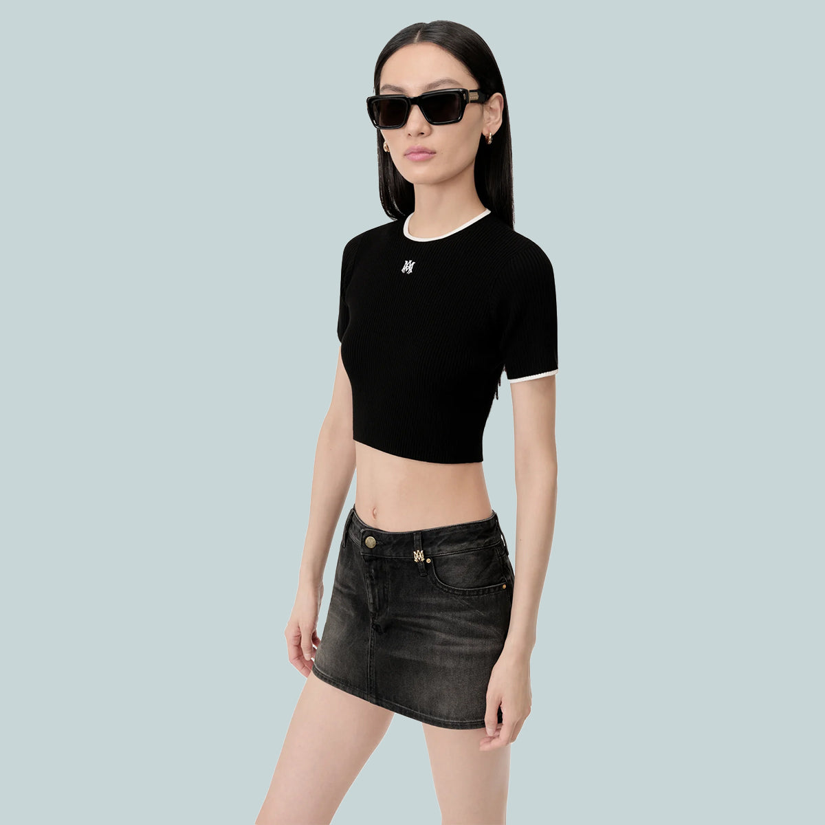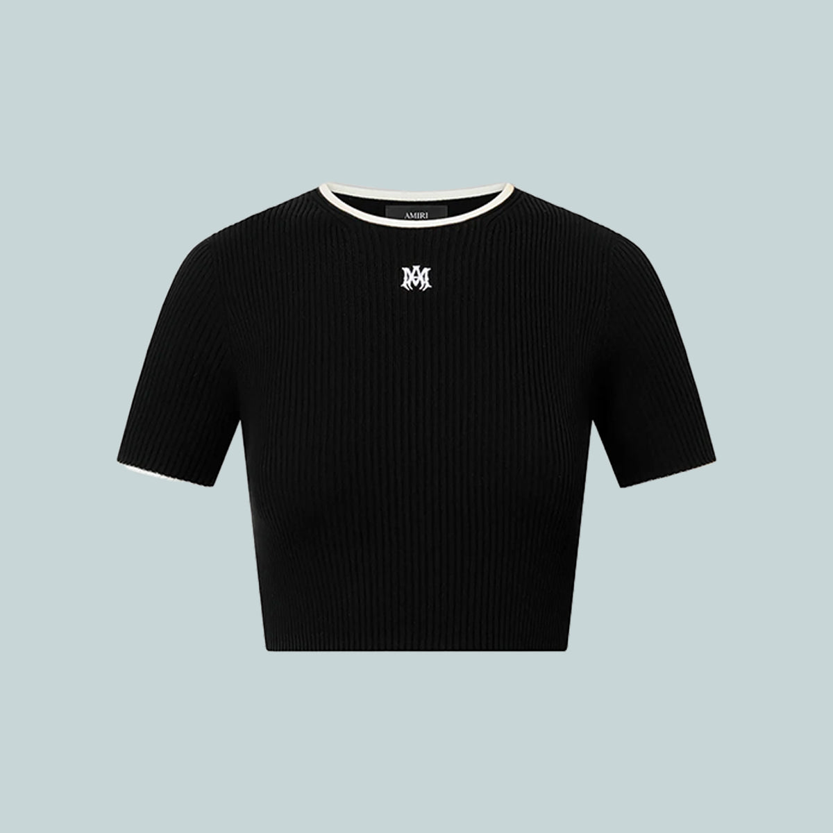Womenswear introduces versatile silhouettes enhanced by house iconography. The MA Baby Tee is designed in rib knit with an embroidered MA icon and contrast finishes at collar and cuffs.