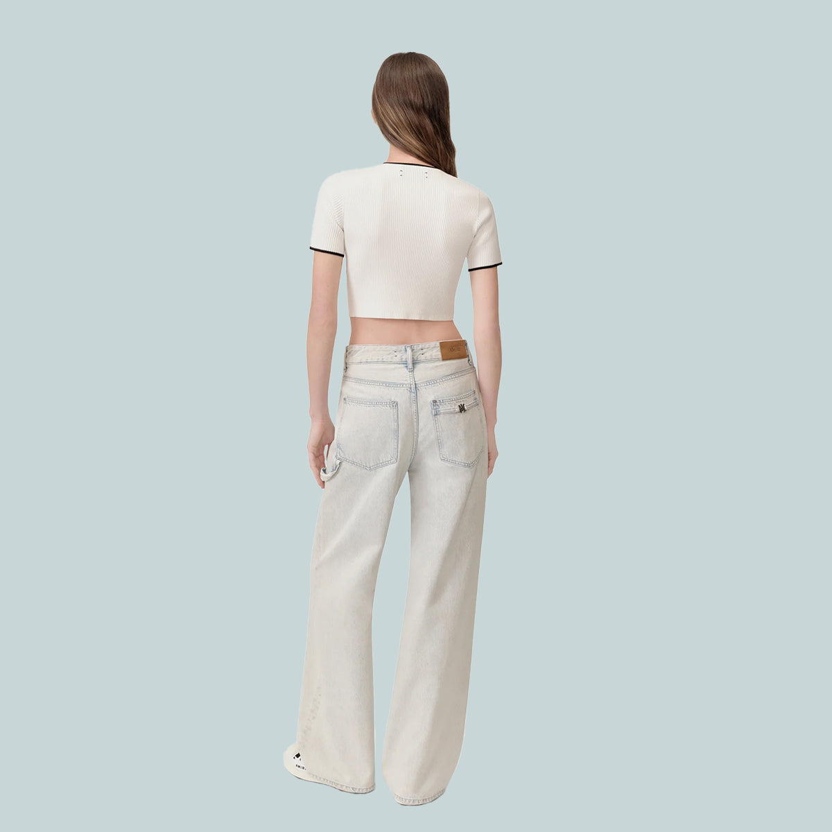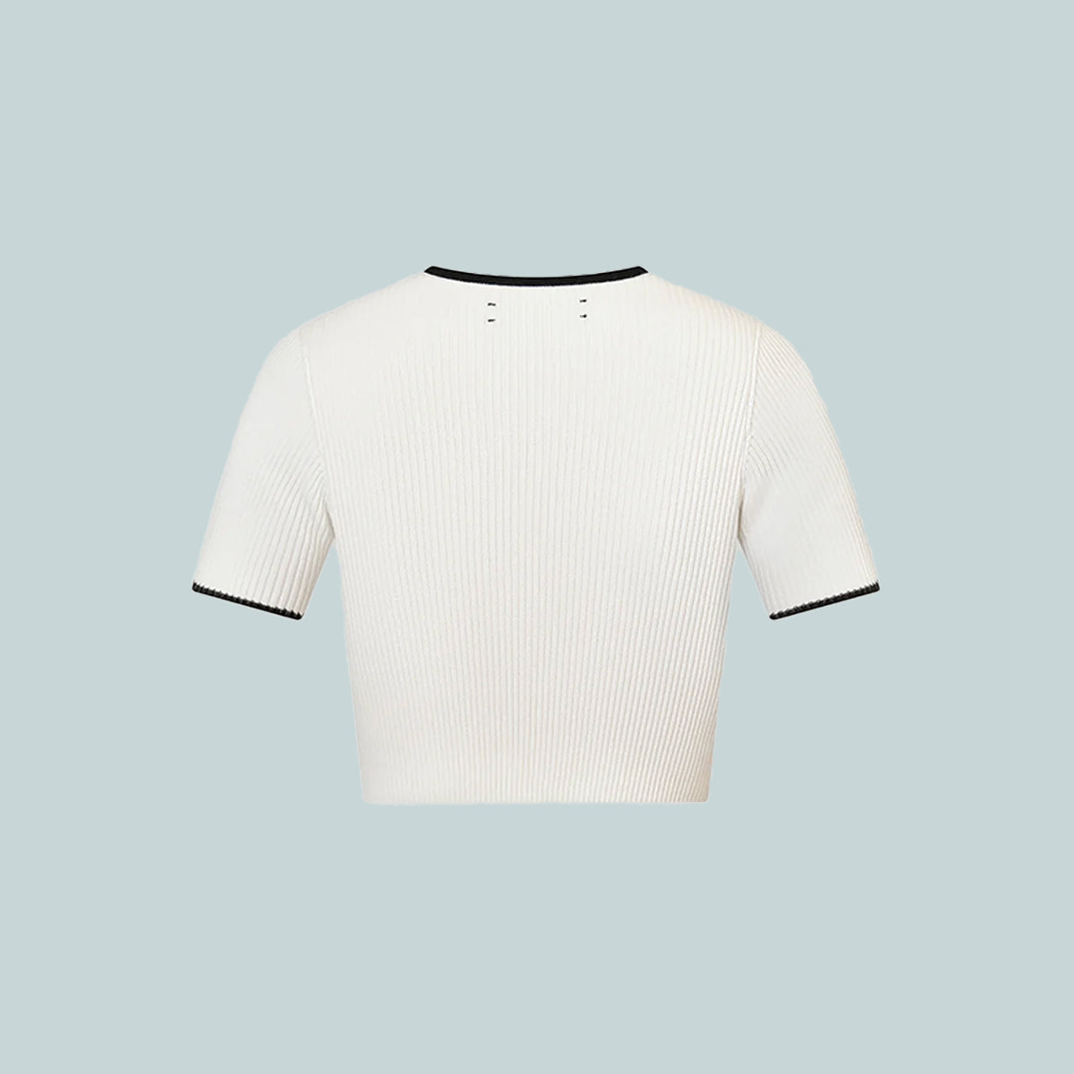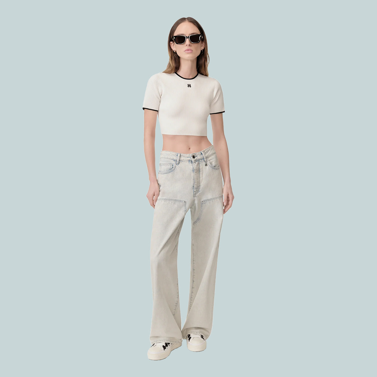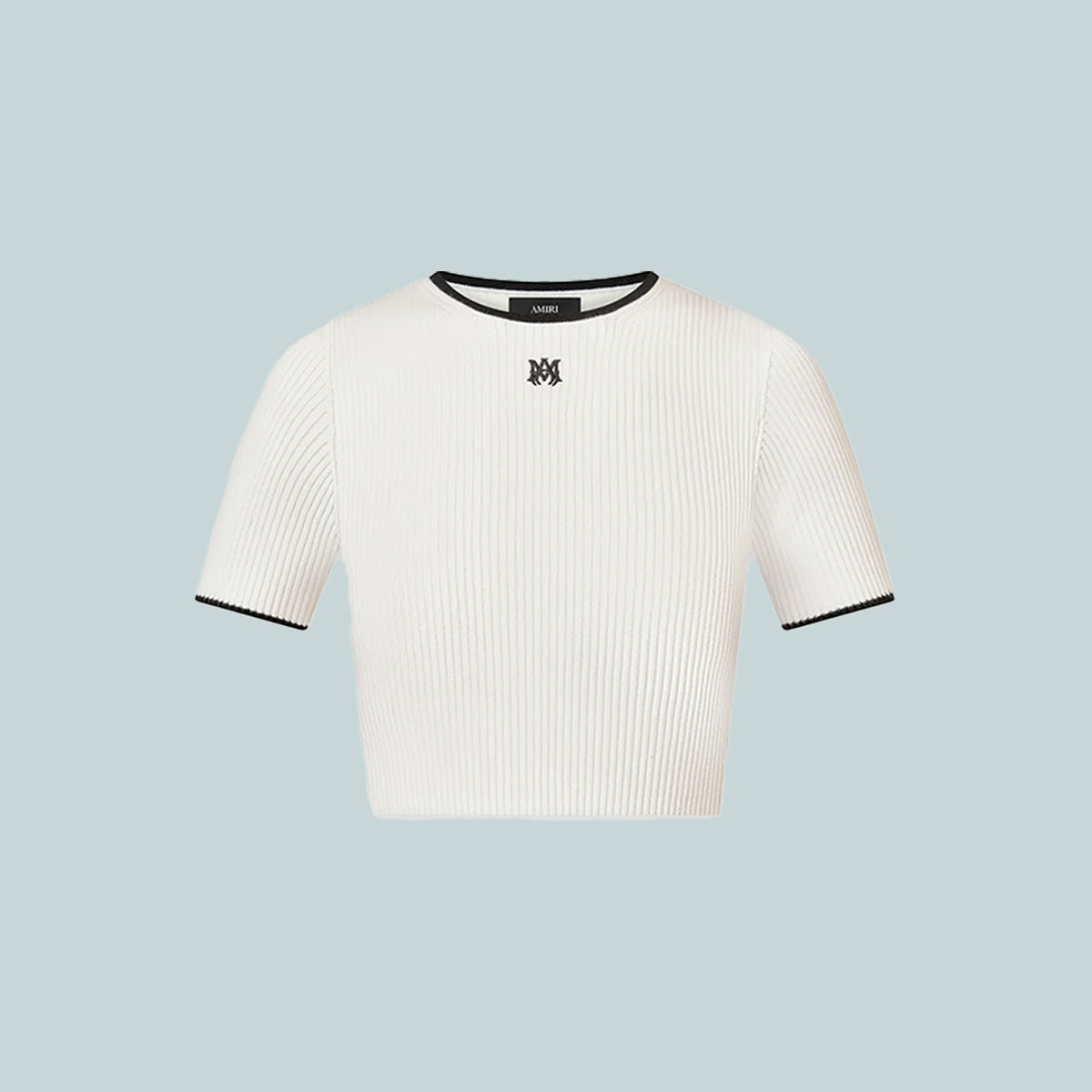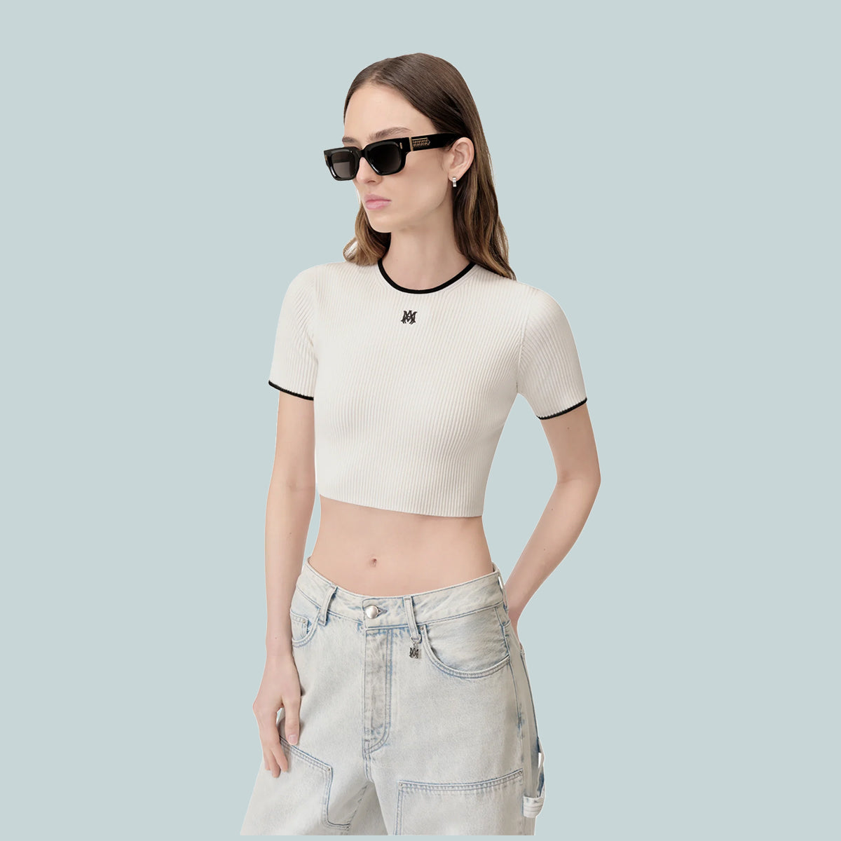 Womenswear introduces versatile silhouettes enhanced by house iconography. The MA Baby Tee is designed in rib knit with an embroidered MA icon and contrast finishes at collar and cuffs.