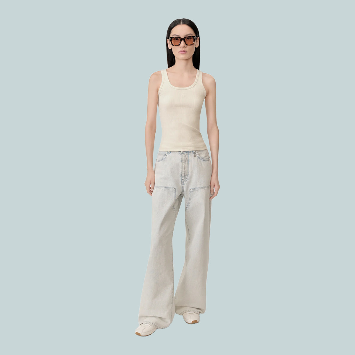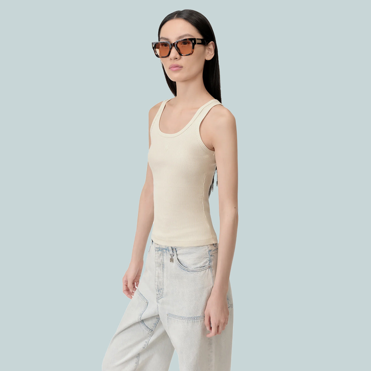 Womenswear introduces versatile silhouettes enhanced by house iconography. The MA embroidery tank is designed in stretch cotton rib with rib accents and the embroidered ma icon.