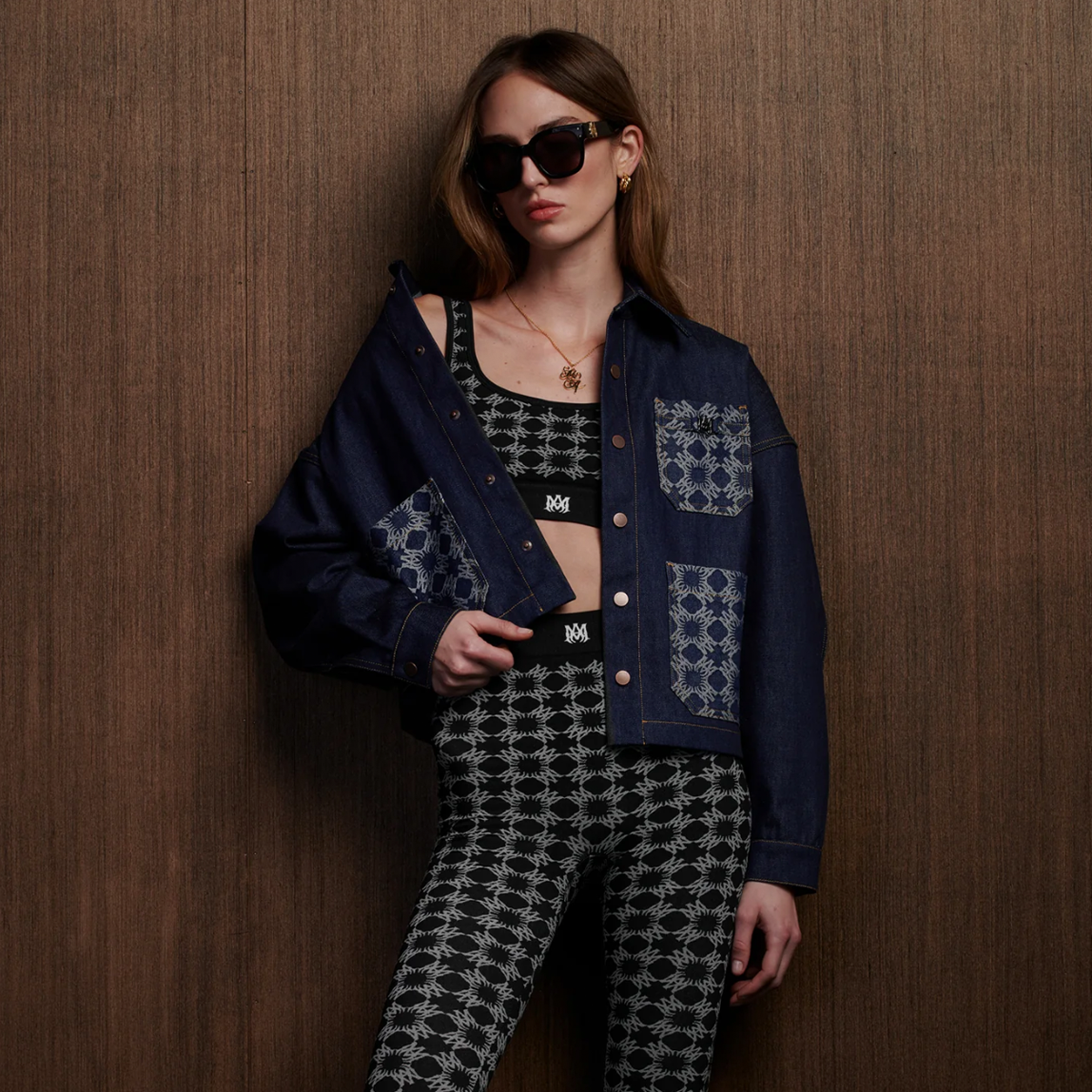 For Pre-Spring 2025, MA Quad monogram print takes on new meaning in heritage denim silhouettes. The MA Quad Workwear Jacket features MA Quad monogram denim pockets and is finished with contrast topstitching.