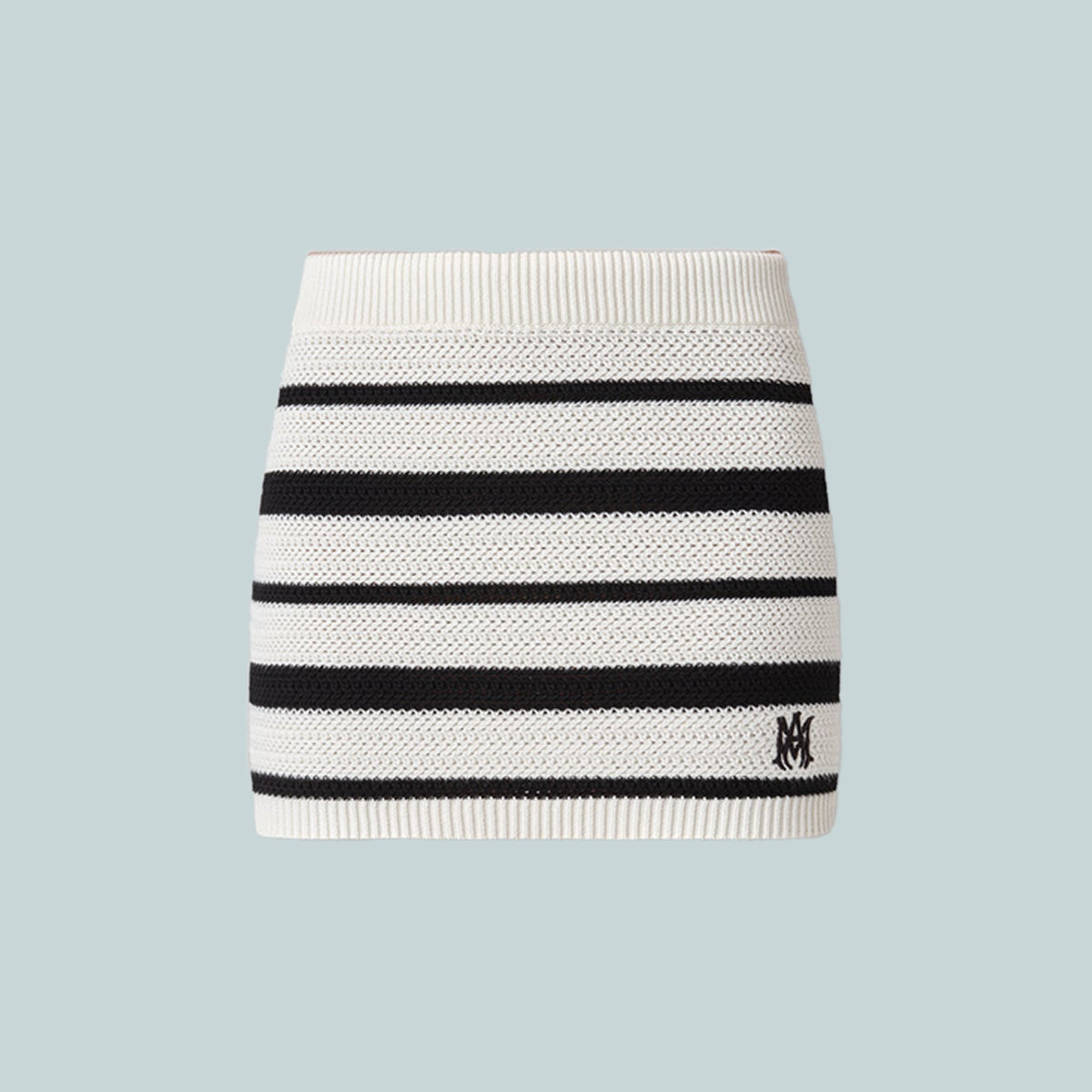 The season's knit stripe appears in a slim-fit skirt for Pre-Spring 2025. The MA Striped Mini Skirt is designed in knit Egyptian cotton and finished with the embroidered MA icon and fine rib accents.