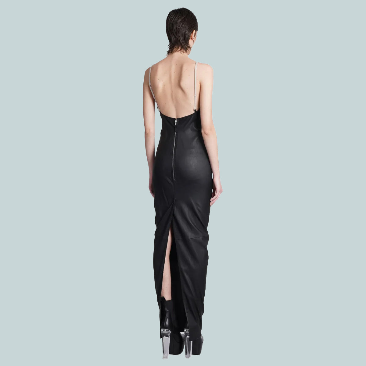 Maillot Gown Dress in black leather, V neck, thin straps, zip closure, back slip.