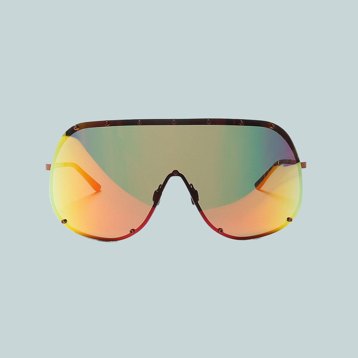 The oversized, mask sunglass infused with the allure of science fiction summons the sleek minimalism of the future with a cinematic elegance.